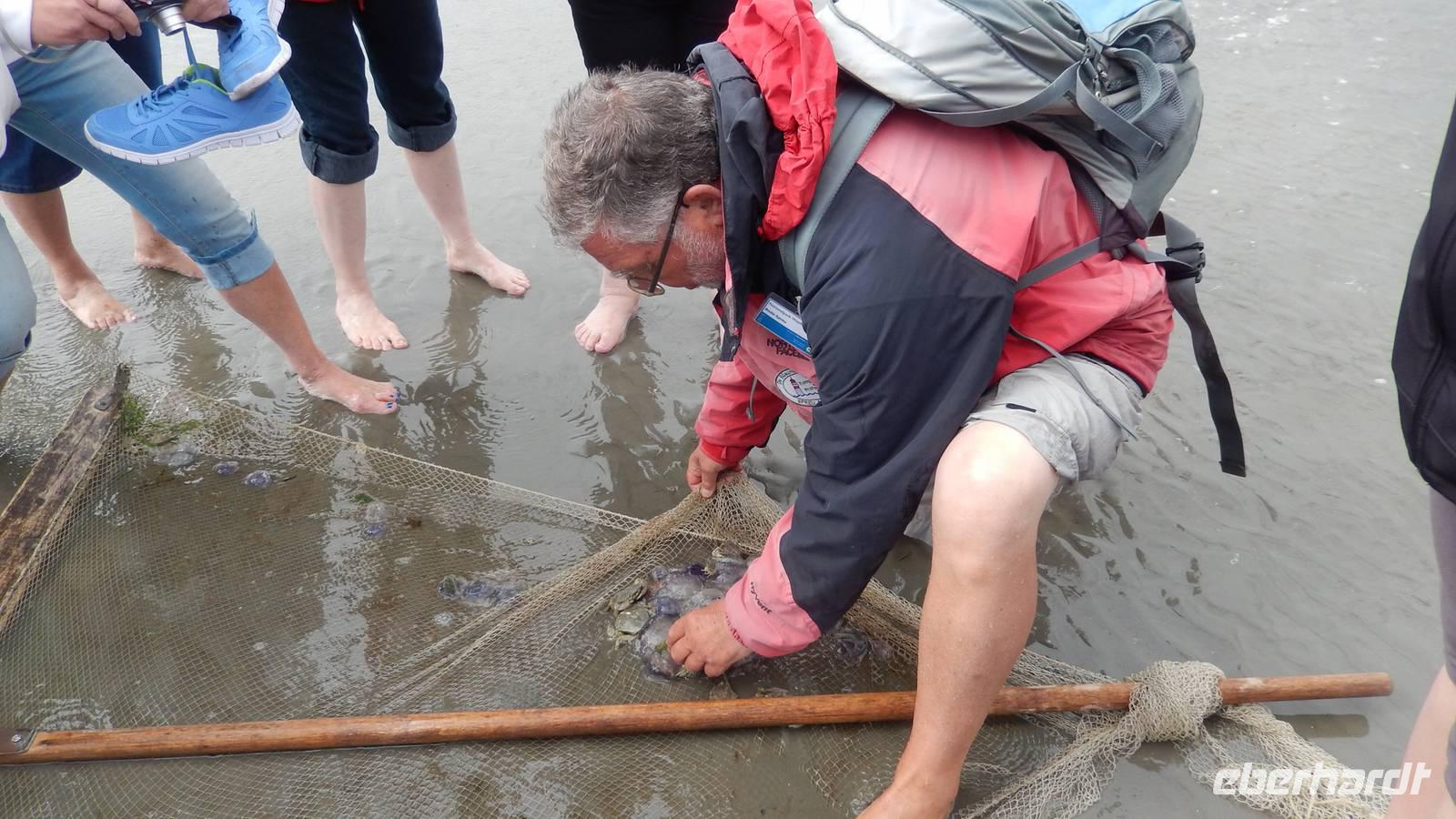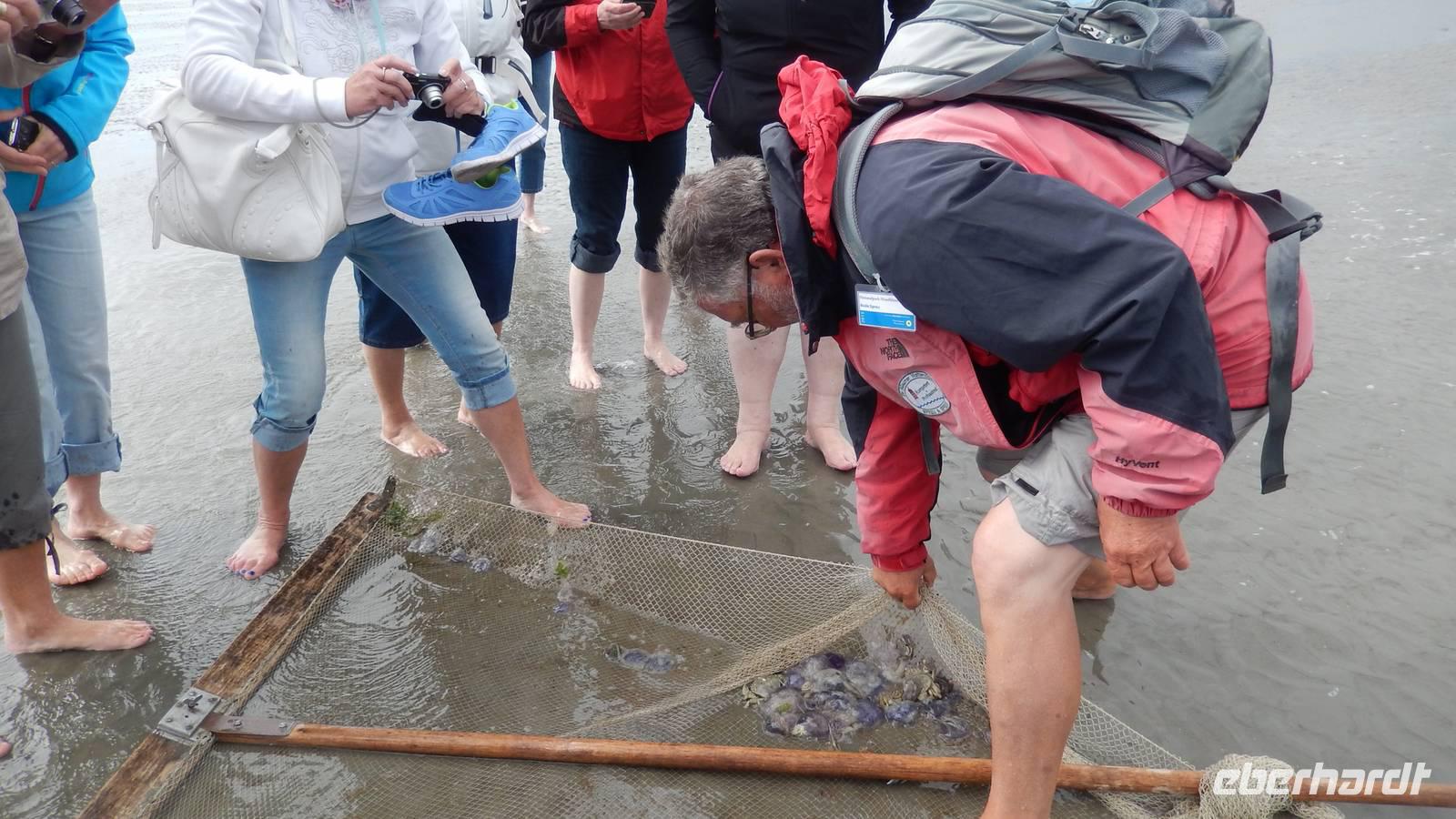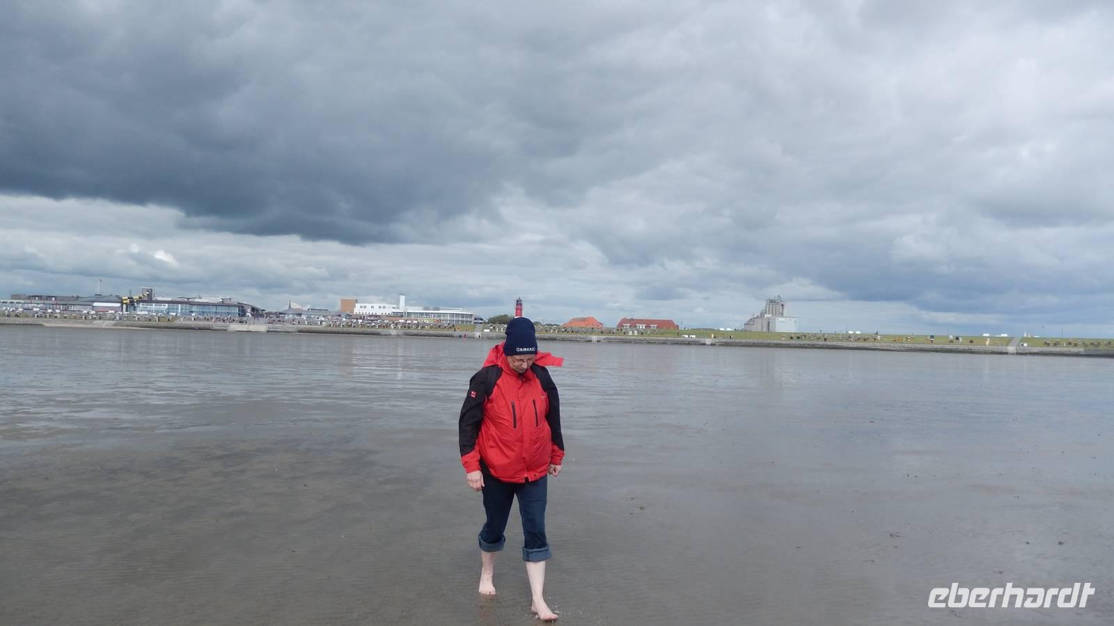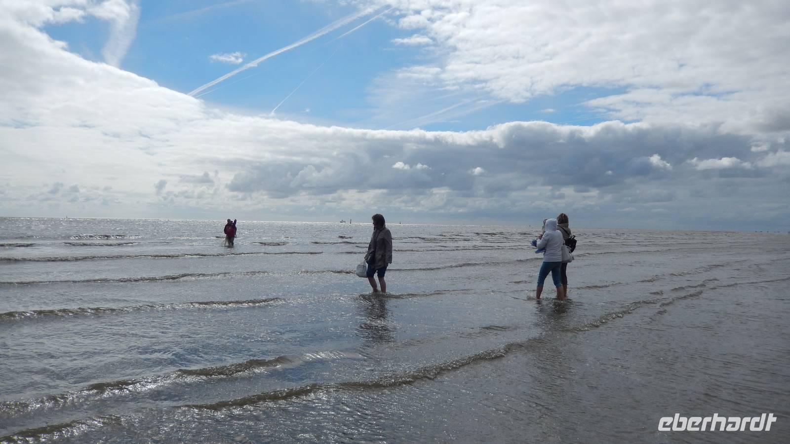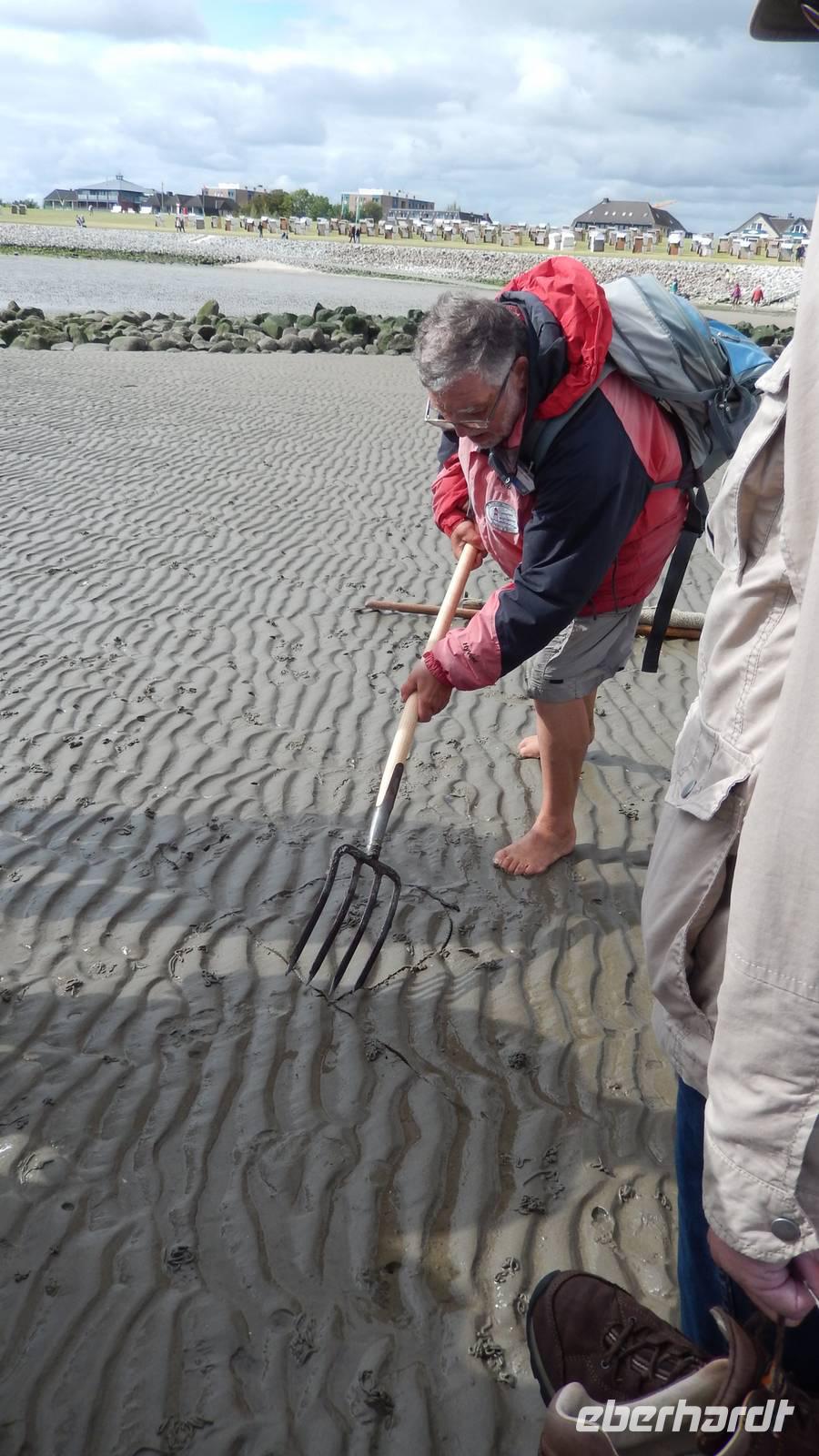 Wieder im Hafen hatten wir Freizeit. Jeder konnte Büsum kennen lernen. Viele bummelten durch die Geschäfte, oder kosteten die leckeren Fischsemmeln. Am Nachmittag trafen wir uns vorm Hotel und gingen gemeinsam an den Strand. Dort wartete Bodo auf uns. Gemeinsam ging es dann ins Watt. Wir waren erstaunt, wie angenehm das "laufen" war. Er erklärte uns viel über die Nordsee, Ebbe und Flut, die Meeresbewohner und beantwortete geduldig alle Fragen. Die Tide ist dort 3.20 m und man könnte 6,5 km weit "raus" laufen.