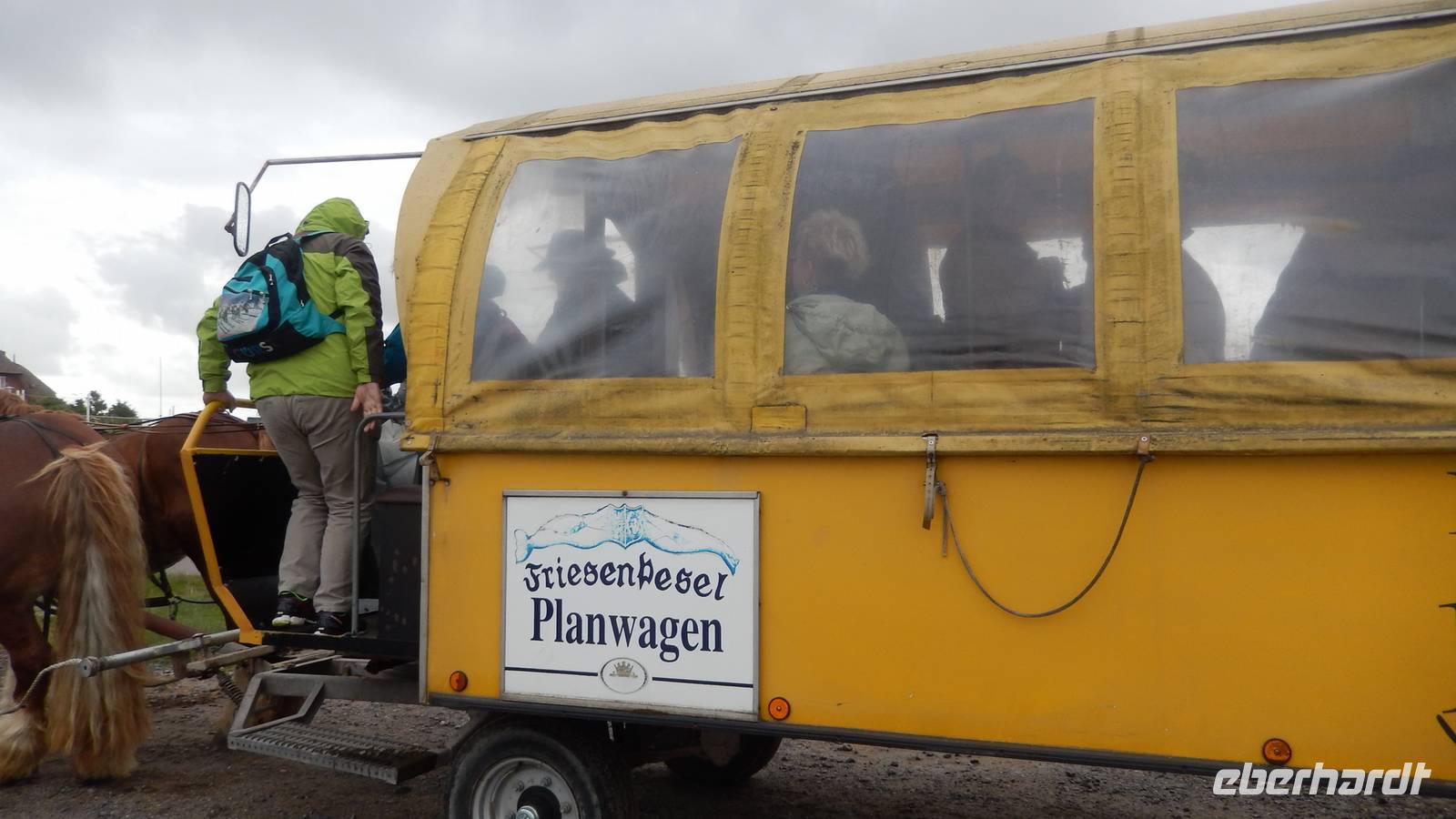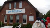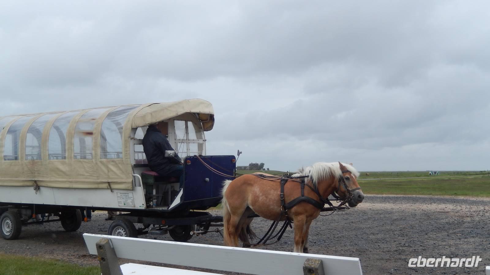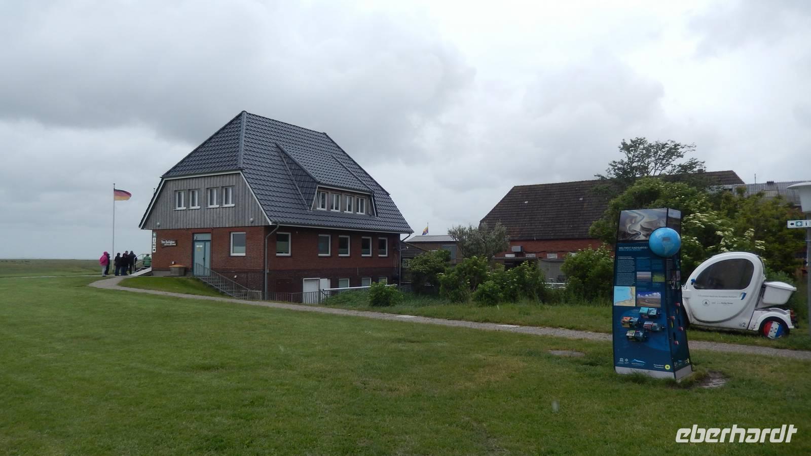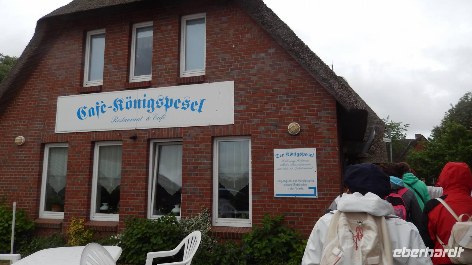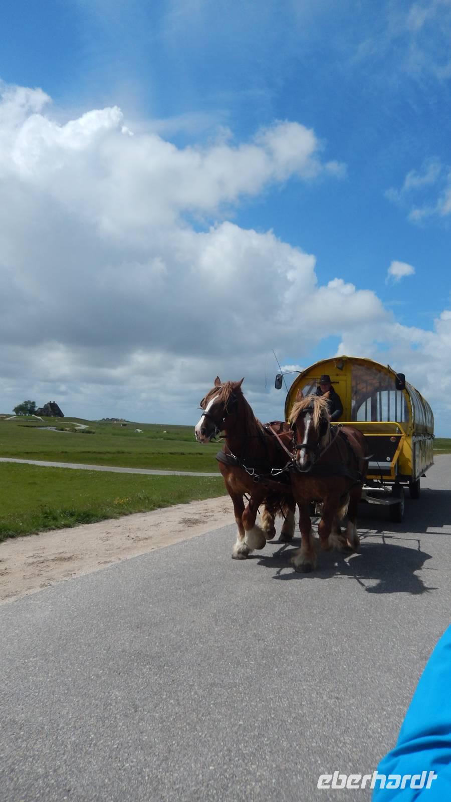 Auf der Hallig Hooge, der Königin der Halligen, wartete bereits eine Kutsche auf uns. Sie ist die meistbesuchteste und berühmteste. Im Sturmflutkino sahen wir uns eine Vorführung über die Flut an. Mehrmals im Jahr wird alles überflutet. Alle waren wir beeindruckt. Dann besuchten wir den Königspesel. In einem ehemaligen Kapitänshaus aus dem 18. Jahrhundert, musste einst der König übernachten, deshalb der Name. Leider fehlte uns die Zeit, um alles in Ruhe zu bestaunen. Mit der Kutsche ging es weiter zur Kirche. In einem schönen Gasthaus gab es Mittag. Wir probierten den Mehlbüddel. Wieder eine Premiere. Eine Spezialität der Region. Der große Mehlkloss mit Obst war sehr lecker.