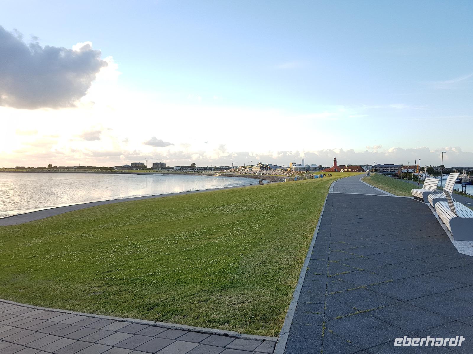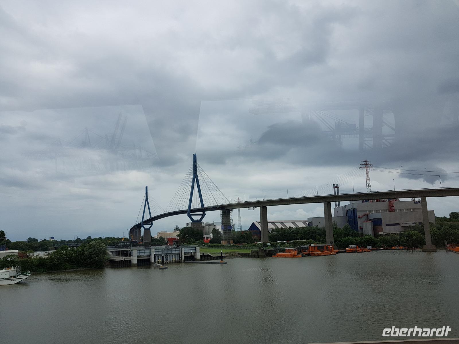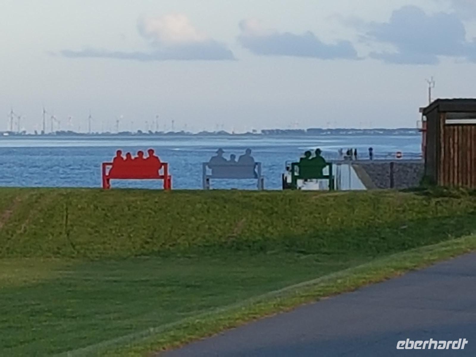 Am Sonntagmorgen startete der Bus in Dresden und nahm unterwegs an zahlreichen Zustiegsstellen immer wieder Gäste auf. Wir reisten mit den Gästen der Nordfrieslandrundreise und so war unser Bus recht gut gefüllt. Regelmäßig gab es Pausen, leider aber auch Stau auf der Autobahn. In Hamburg fuhren wir recht nahe am Hafen und der Köhlbrandbrücke vorbei und in der Ferne war sogar das Gebäude der neuen Elbphilharmonie zu erkennen. Am Nord-Ostsee-Kanal gab es die letzte Pause und wir spazierten zur Autobahnbrücke und sahen sogar einige Schiffe auf dem Kanal. Am frühen Abend schließlich erreichten wir den Ankerplatz in Büsum und dort warteten schon Dirk und Florian vom Hotel Tum Stüürmann. Sie übernahmen unsere Koffer und brachten sie auch gleich in unsere Zimmer. Wir gingen zu Fuß zum Hotel, wo wir sehr freundlich begrüßt wurden und unsere Zimmerschlüssel bekamen. 2 Gäste waren mit Pkw bzw. der Bahn angereist. Unser Abendessen hatten wir bereits unterwegs ausgewählt und so mußten wir auch nicht lange warten auf Vorspeise, Hauptgericht und Nachtisch. Nach dem langen Sitzen im Bus und dem reichlichen Abendessen begaben wir uns alle zum Strand zu einem ausgiebigen Abendspaziergang. Der stürmische Wind konnte uns nicht abhalten den ganzen Deich bis zur Lagune zu gehen. Danach aber freute sich jeder auf sein Bett.