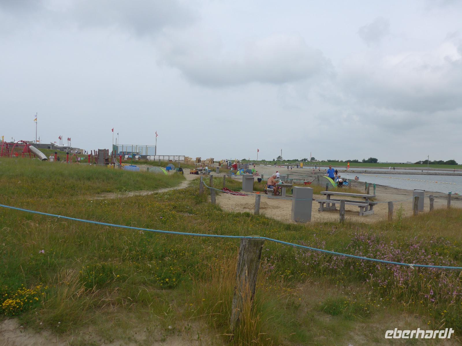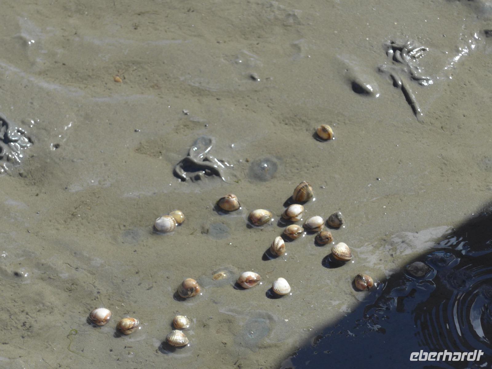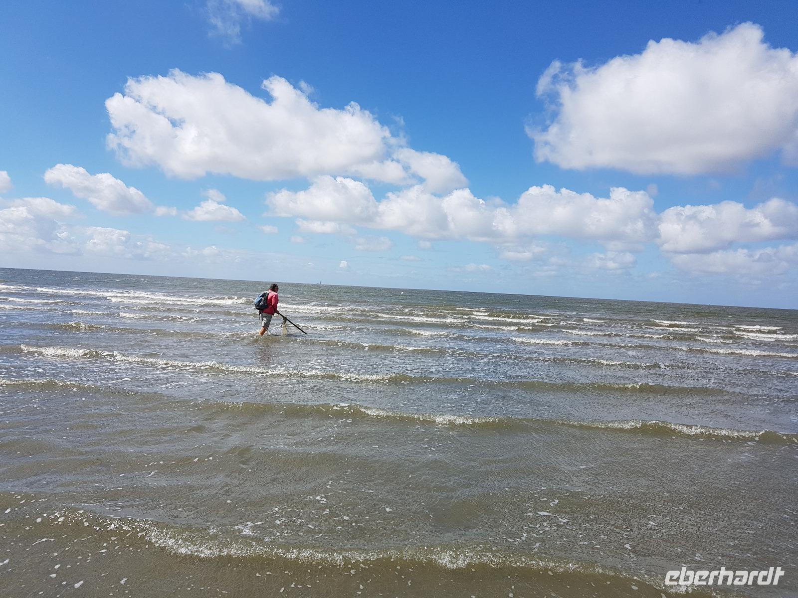 Das Frühstück im Hotel war eine Augenweide und ließ keine Wünsche offen. Gut gestärkt trafen wir uns dann mit Bodo am "Piraten Meer" zur Wattwanderung. Der Wind pfiff immer noch heftig, dennoch gingen fast alle barfuß durchs Watt. Bodo hatte eine Grabegabel und ein "Fangwerkzeug" bei sich und los gings. Alle sprachen nur von den Wattwürmern, erfuhren aber zunächst von den zahlreichen unterschiedlichen Schecken im Watt und von den vielen Krebsen. Auf der Rückseite hat der männliche Krebs einen Leuchtturm und der weibliche ein Bienenkörbchen. Mit der Grabegabel legte Bodo dann die heilende Kieselerde frei und zum Schluß auch ein Prachtexemplar eines Wattwurmres. Wir liefen bis zur Wasserkante und dort kam das Fanggeschirr zum Einsatz. Leider war nicht viel im Netz und die erhofften Nordseekrabben waren nicht dabei, weil zu viele Wittlinge sie verspeisen. Wieder am Ufer spülten wir den Sand von den Füßen und begaben uns in die Mittagspause.