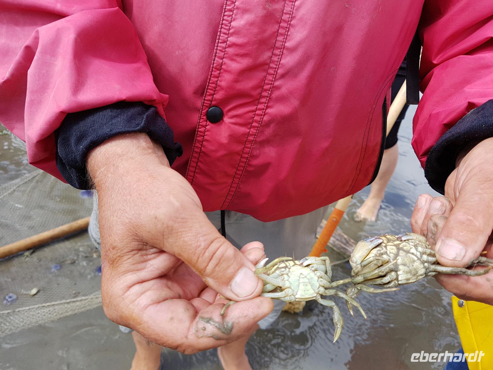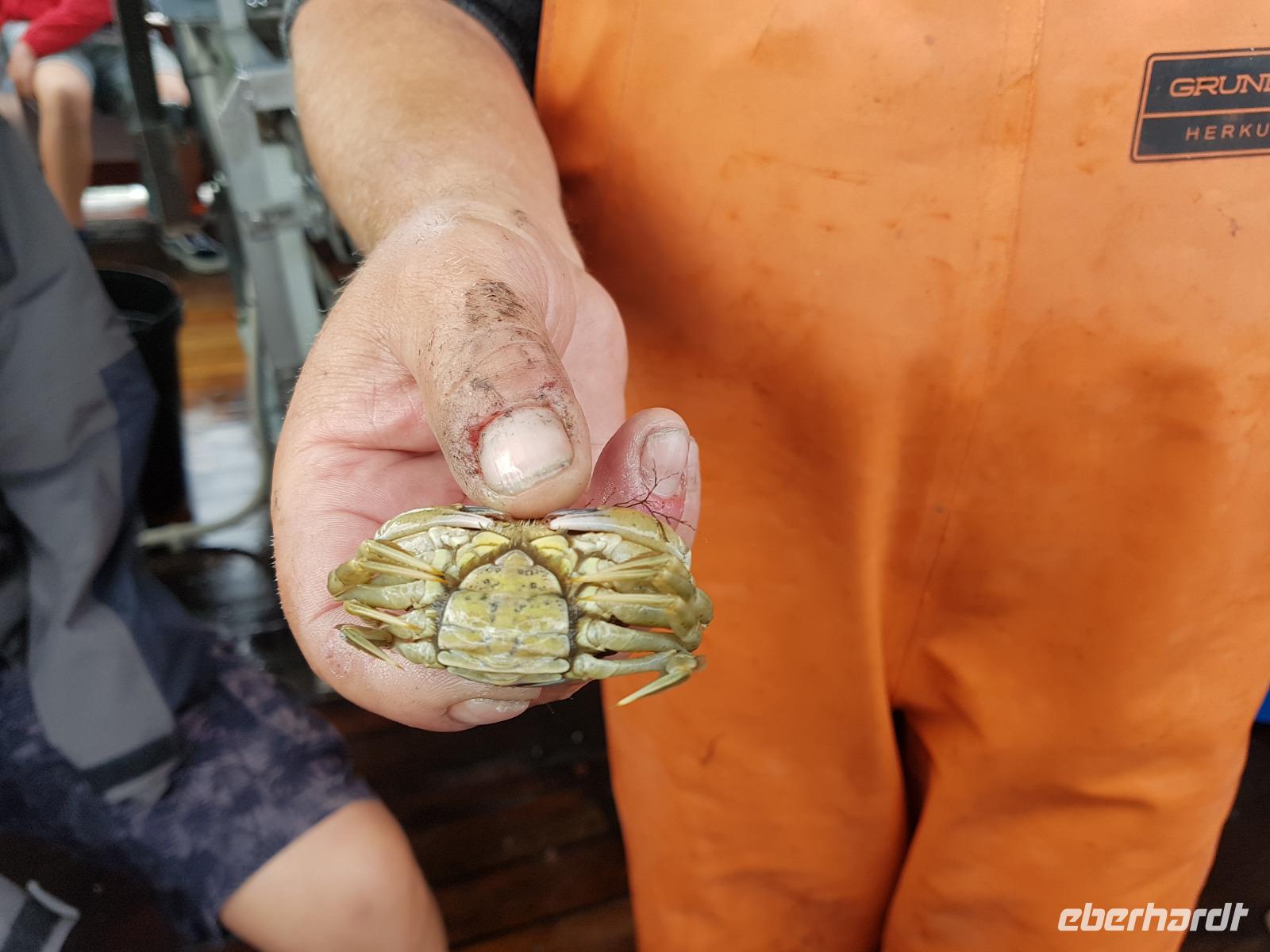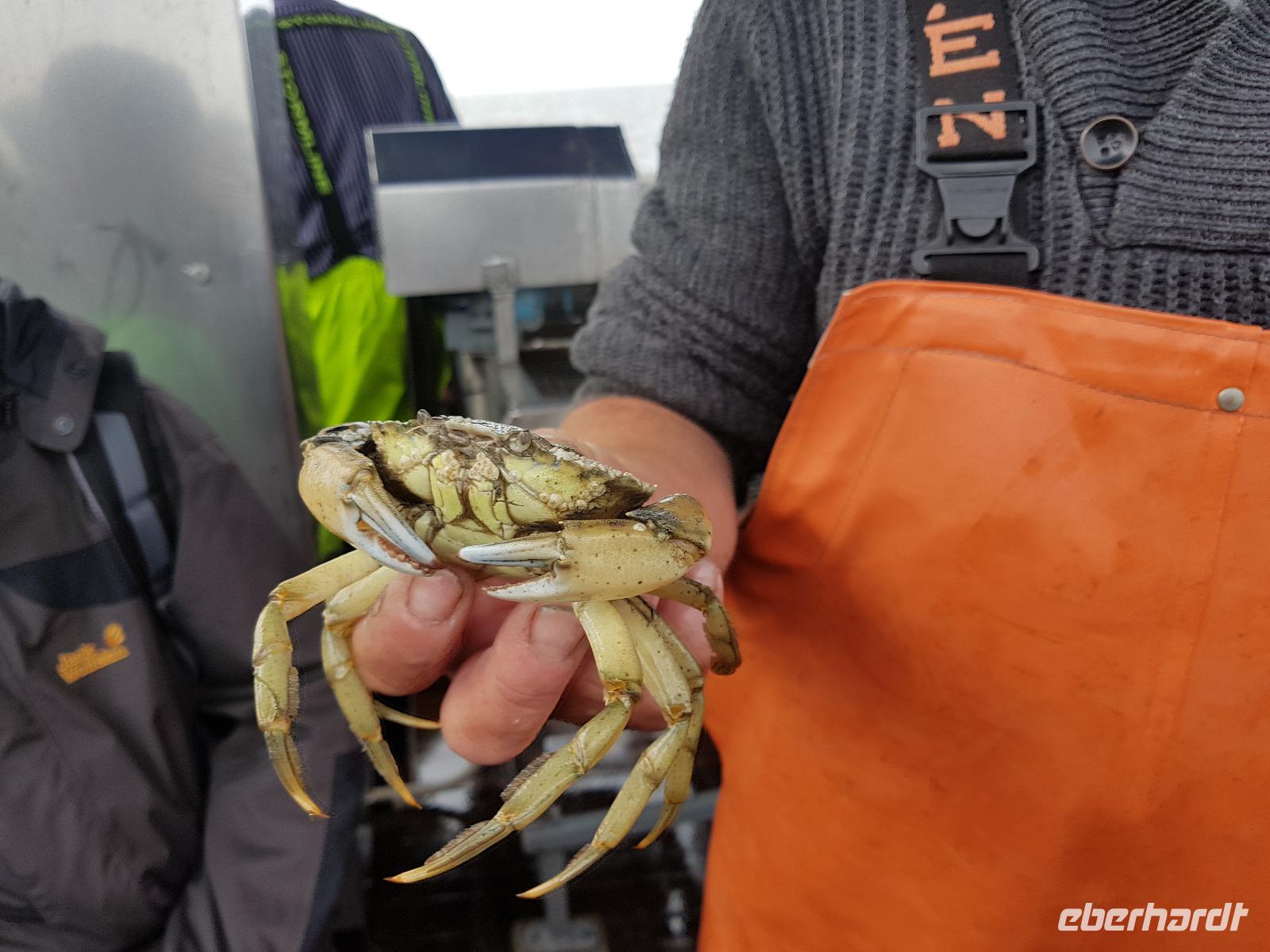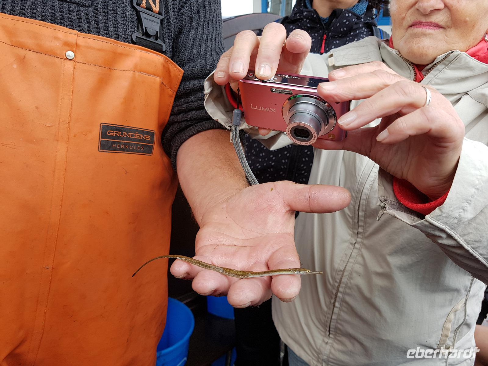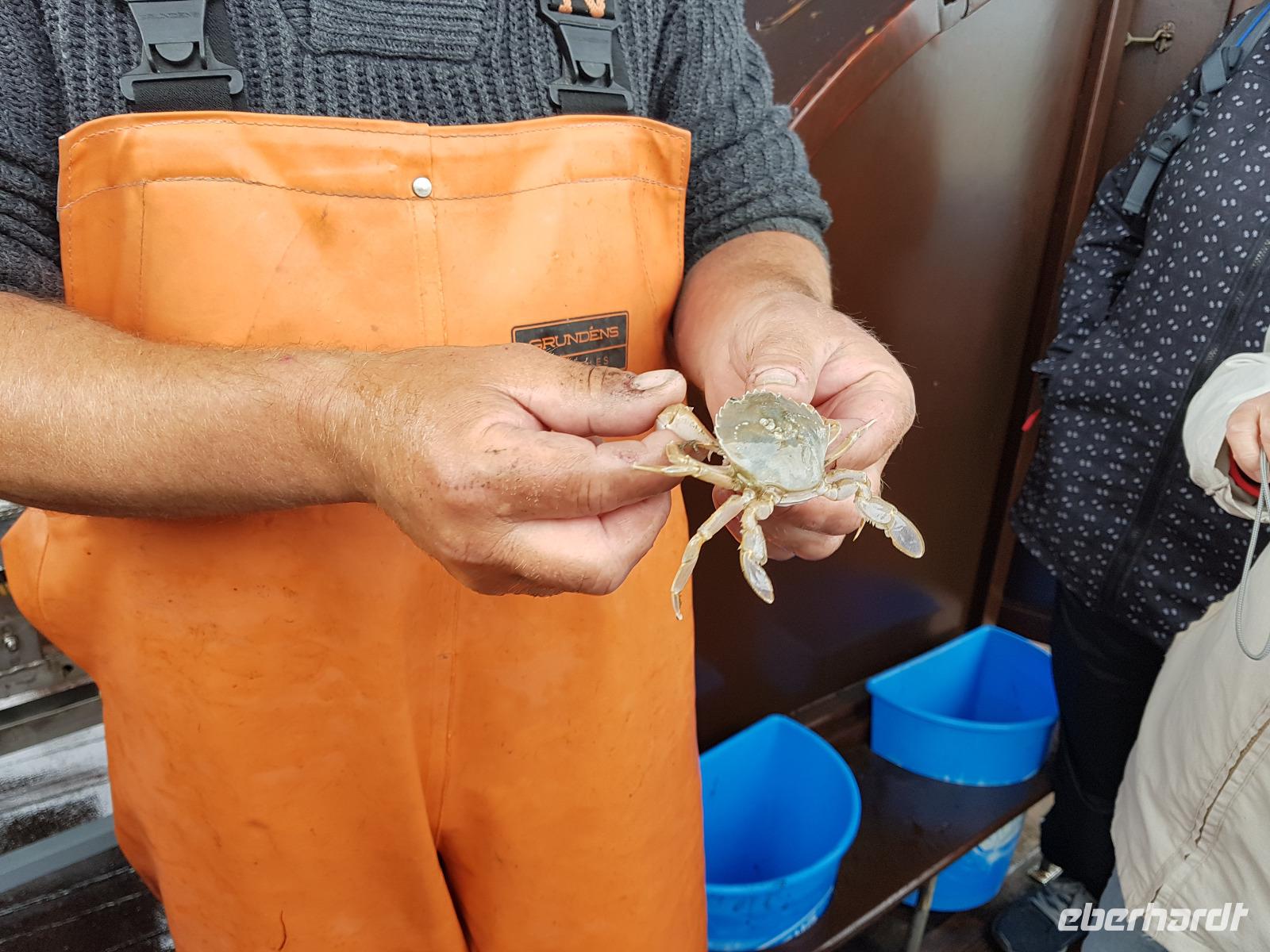 Eigentlich war Regen angesagt, aber wir hatten auch am Mittwoch Glück mit dem Wetter. So entschied sich ein Teil unserer Gruppe, die Fangfahrt am Morgen zu buchen. Mit der "Hauke" fuhren wir ein Stück hinaus und die Männer ließen das Fangnetz zu Wasser. Derweil genossen wir einen Grog an Bord. Dann wurde das Netz eingeholt und war waren sehr gespannt. Der Fang wurde sortiert und uns die interessanten Exemplare gezeigt und erklärt. Wie man die Krebse unterscheidet, wußten wir schon von Bodo. Wir lernten aber auch die Seenadel, eine Aalmutter, Seewanzen, den gefräßigen Wittling und andere Fische sowie die Nordseekrabbe kennen. Letztere wurden an Bord gekocht und wir konnten sie auspulen und verspeisen. Es war ein toller Ausflug und die Teilnehmerinnen happy.
