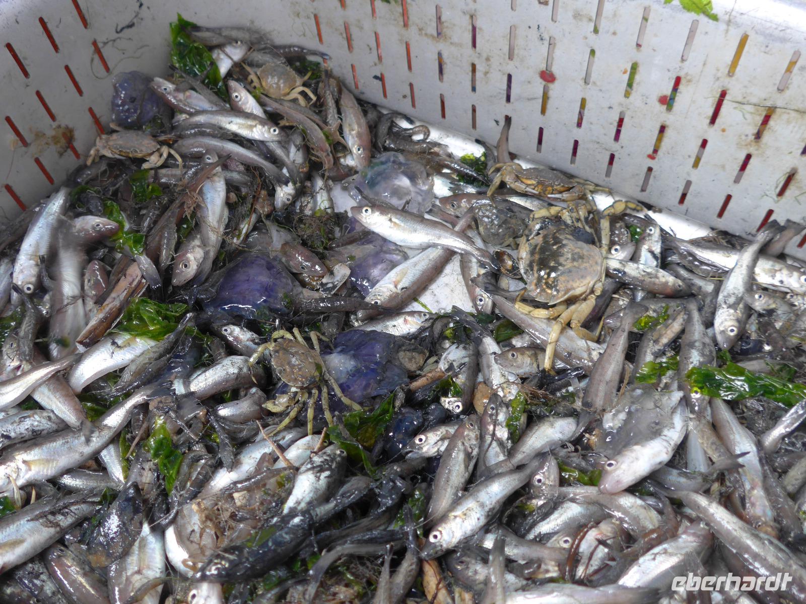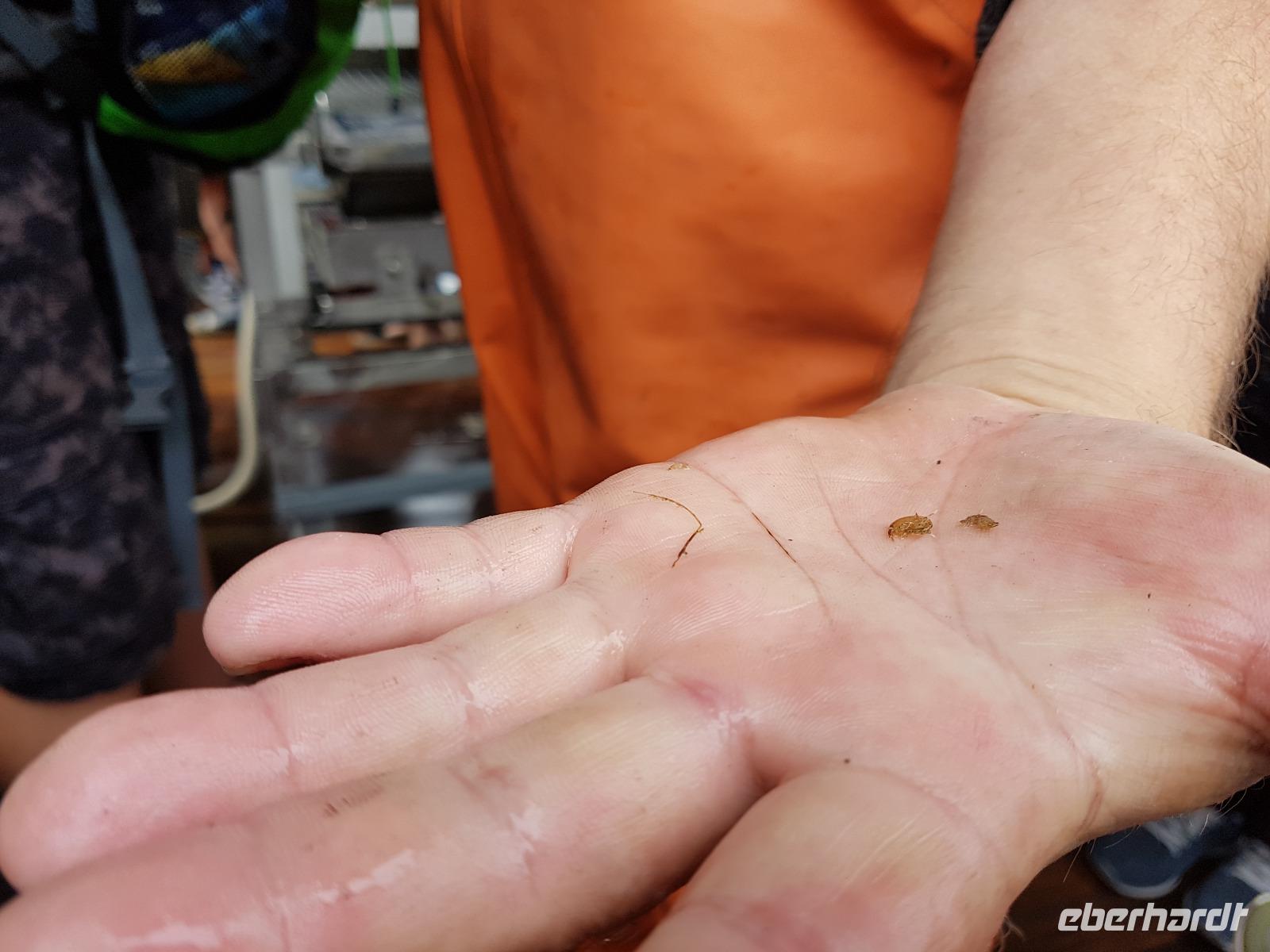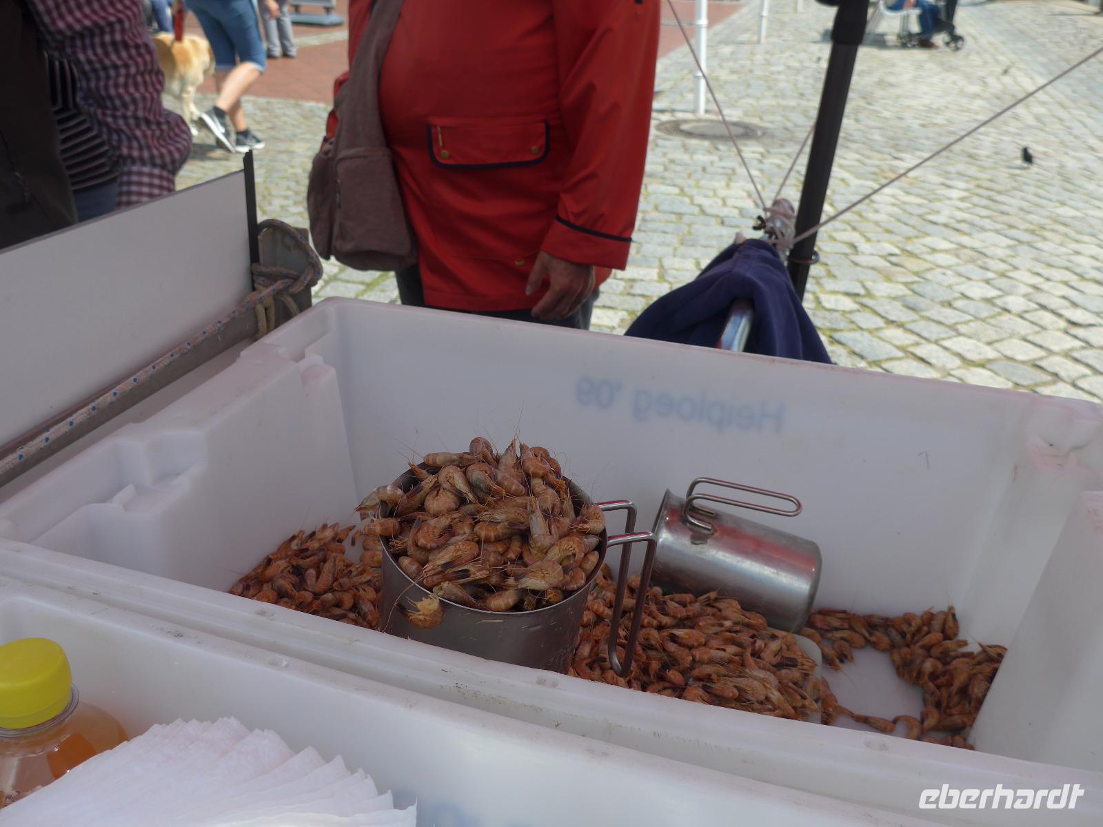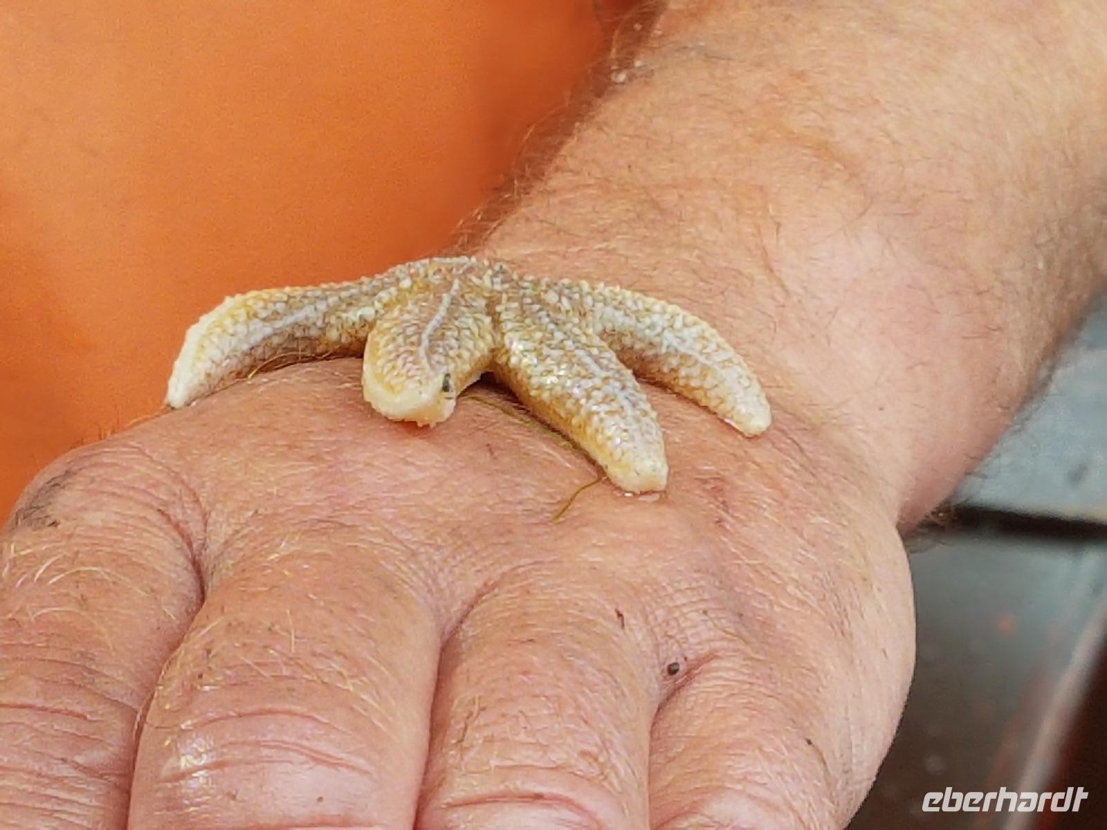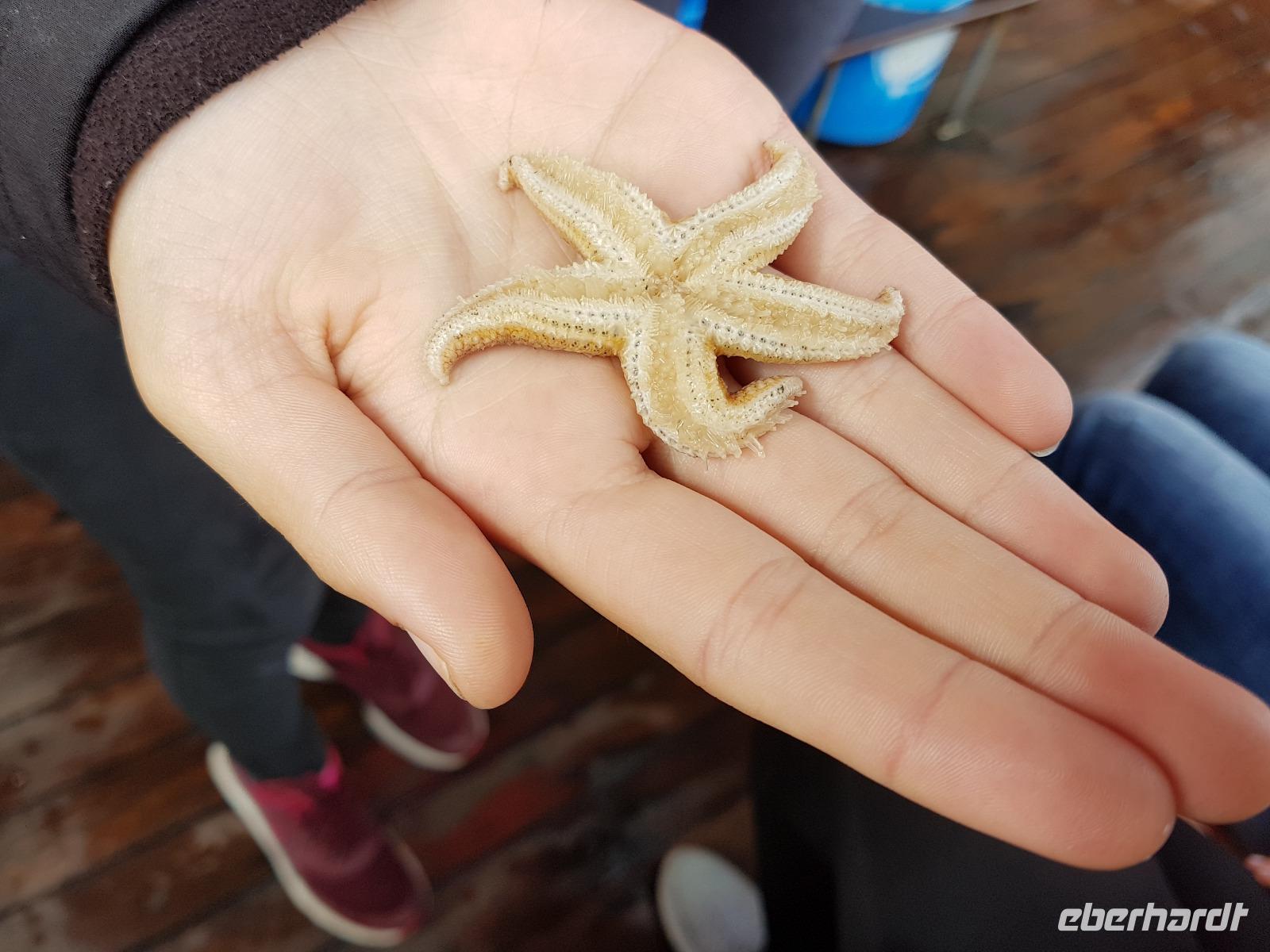 Eigentlich war Regen angesagt, aber wir hatten auch am Mittwoch Glück mit dem Wetter. So entschied sich ein Teil unserer Gruppe, die Fangfahrt am Morgen zu buchen. Mit der "Hauke" fuhren wir ein Stück hinaus und die Männer ließen das Fangnetz zu Wasser. Derweil genossen wir einen Grog an Bord. Dann wurde das Netz eingeholt und war waren sehr gespannt. Der Fang wurde sortiert und uns die interessanten Exemplare gezeigt und erklärt. Wie man die Krebse unterscheidet, wußten wir schon von Bodo. Wir lernten aber auch die Seenadel, eine Aalmutter, Seewanzen, den gefräßigen Wittling und andere Fische sowie die Nordseekrabbe kennen. Letztere wurden an Bord gekocht und wir konnten sie auspulen und verspeisen. Es war ein toller Ausflug und die Teilnehmerinnen happy.