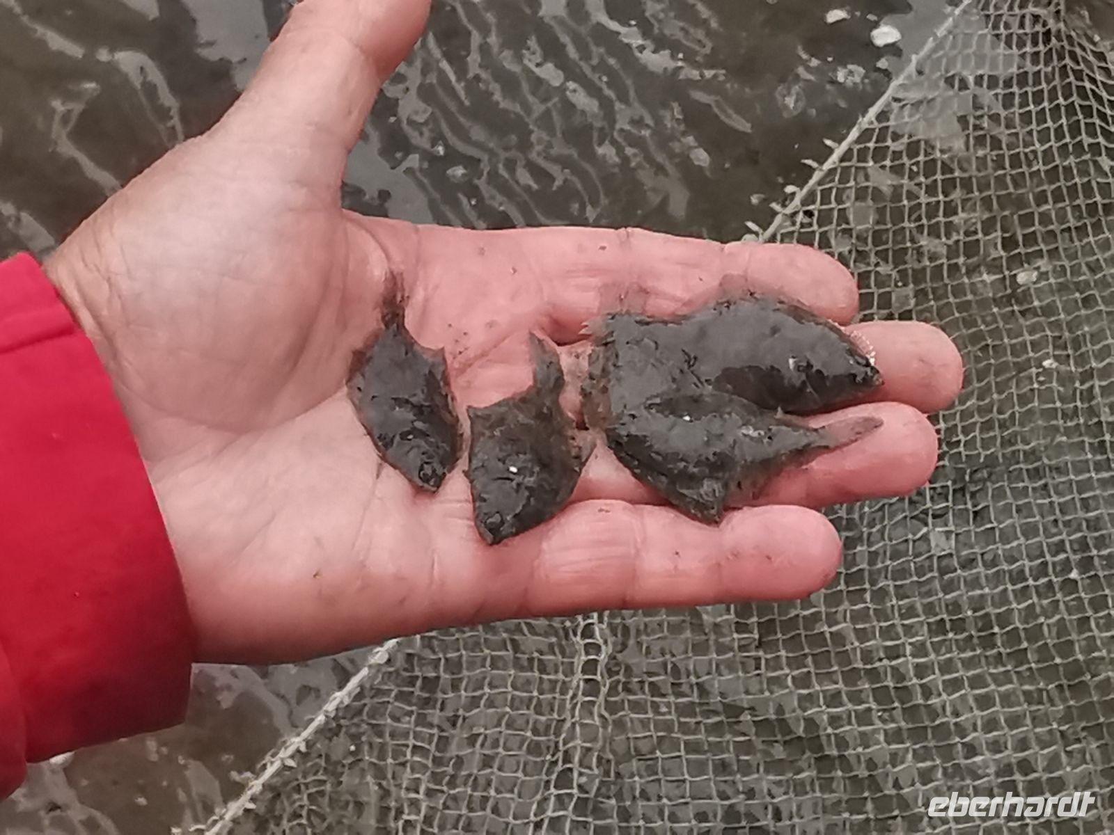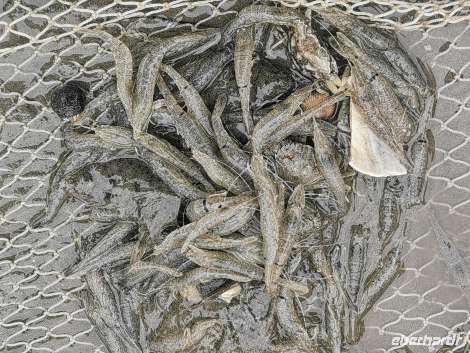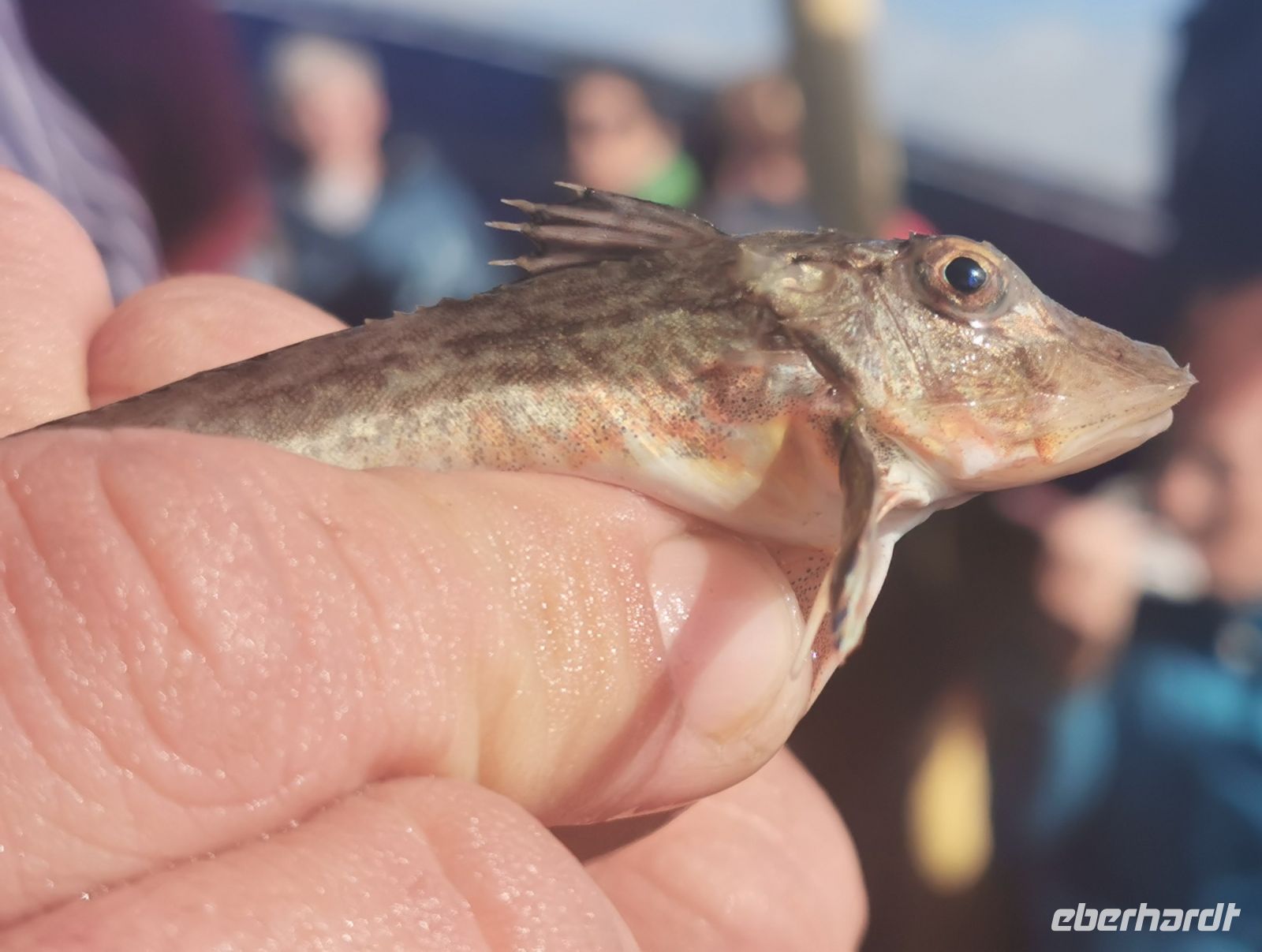 Als das Netz eingeholt wird liegen allerlei verschiedene Meeresbewohner im Fangkorb, leider kaum Krabben. Die Fischer erklären uns die verschiedenen Fische, heute ist ihnen sogar der wie ein Drache aussehende giftige Knurrhahn ins Netz gegangen. Die kleine Flunder, die auch mit im Netz war, hat strahlend blaue Augen. Eine Seenadel erinnert uns an Seepferdchen. Die Krabbenausbeute ist leider so gering, daß wir nicht pulen werden und somit auch leider keine verkosten können. Darauf hatten wir uns so gefreut.