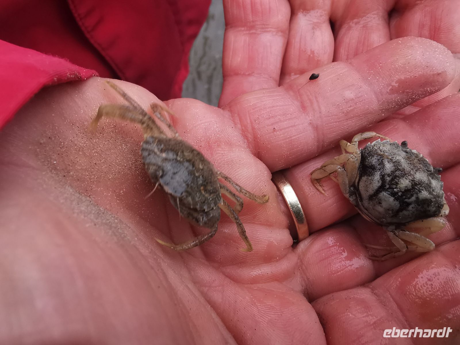 Kleine und größere Krebse drehen und wenden wir, ist es nun ein Männlein oder ein Weiblein? Ganz einfach ist das zu erkennen: das Männchen hat einen Leuchtturm, das Weibchen ein Bienenkörbchen. Bodo macht sich mutig auf in die herannahenden Nordseefluten und fängt mit Stock und Netz auf die traditionelle Weise ein paar Krabben. Doch nein, nicht nur Krabben sind im Netz, bemerken wir erstaunt. Er fischt geschickt eine Qualle, kleine Flundern, Krebse, Muscheln und Krabben aus seinem Fang.