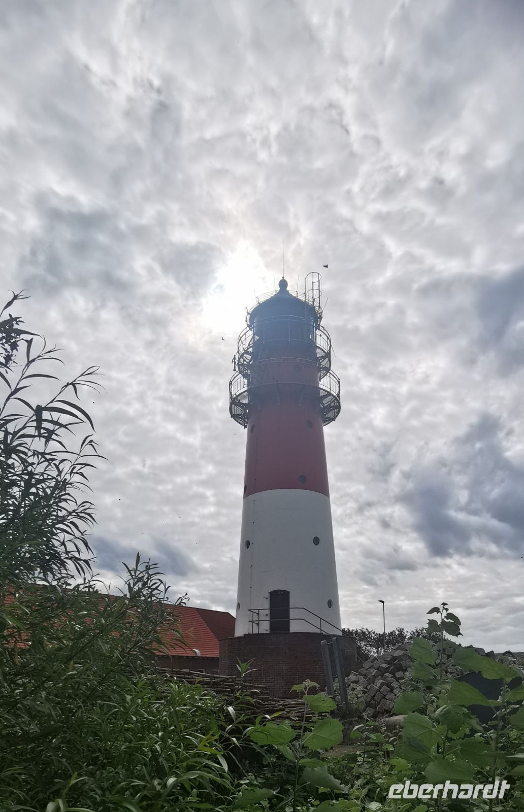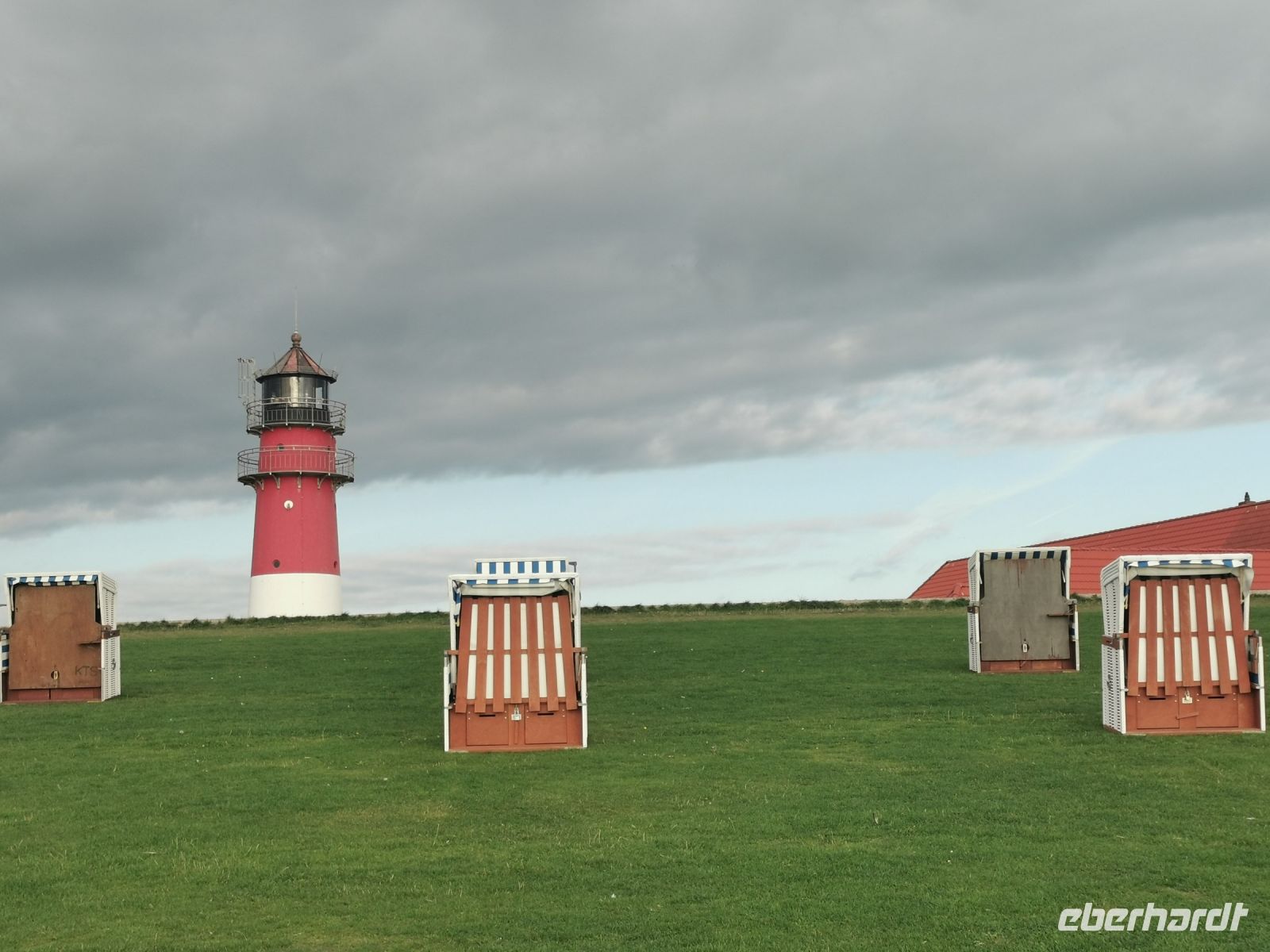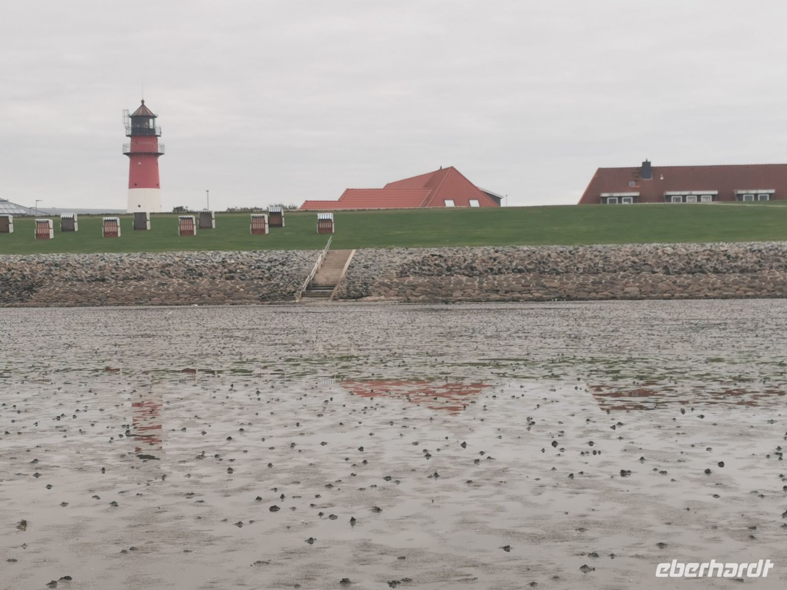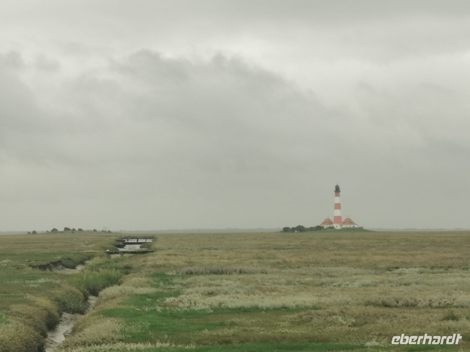 Zuallererst steuern wir den aus der Jeverwerbung bekannten Westerhever Leuchtturm an, der neben dem Strand von St. Peter Ording das beliebteste Fotomotiv des Bundeslandes sein dürfte. Beim Öffnen der Bustür umweht uns heftiger Nordwind und leichter Nieselregen kommt uns entgegen. Wir trotzen dem Wetter und machen uns über die Salzwiesen auf zum 40 Meter hohen Wahrzeichen der Halbinsel. Der Turm wurde 1906 etwa 1000 Meter vor dem Seedeich auf einer aufgeschütteten Warft errichtet. Im Leuchtturm befinden sich neun Stockwerke, die aber momentan leider geschlossen sind. Daneben stehen zwei kleine Leuchtturmwärterhäuser. Wir kämpfen uns durch Wind und Wetter und als wir zurück am Bus sind haben alle glutrote Wangen und zerzauste Haare aber glückliche Gesichter.