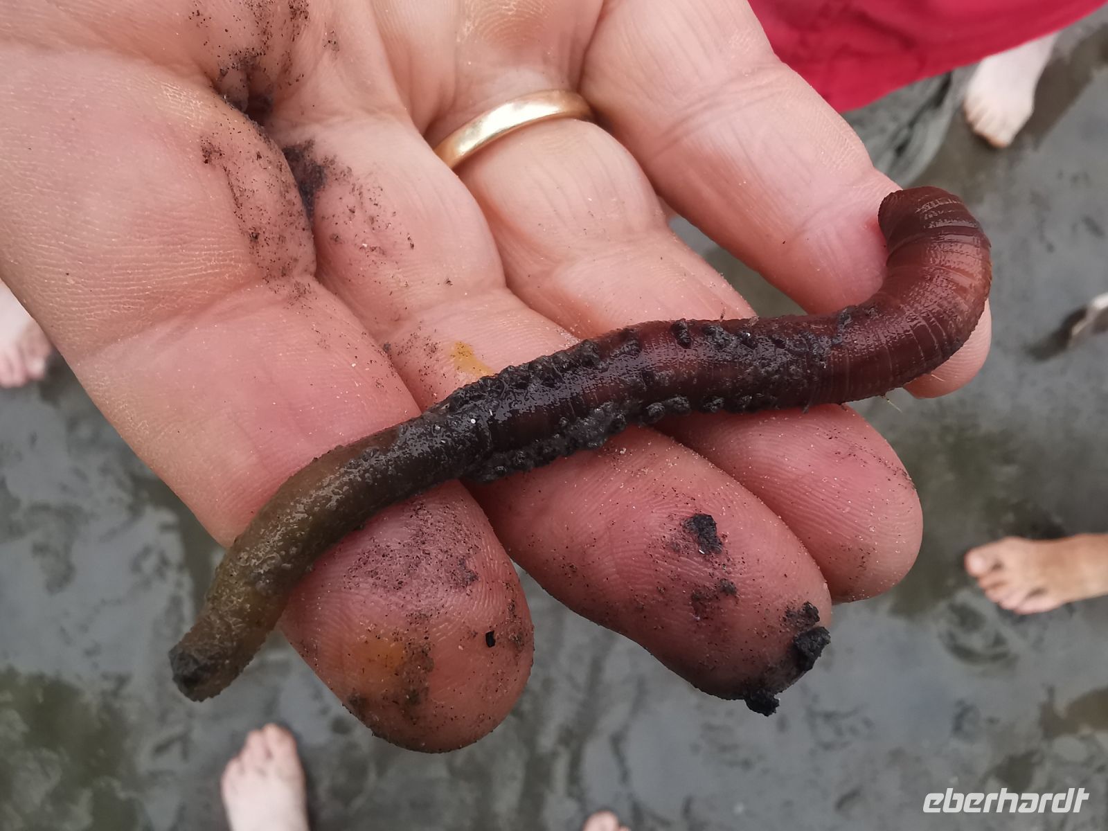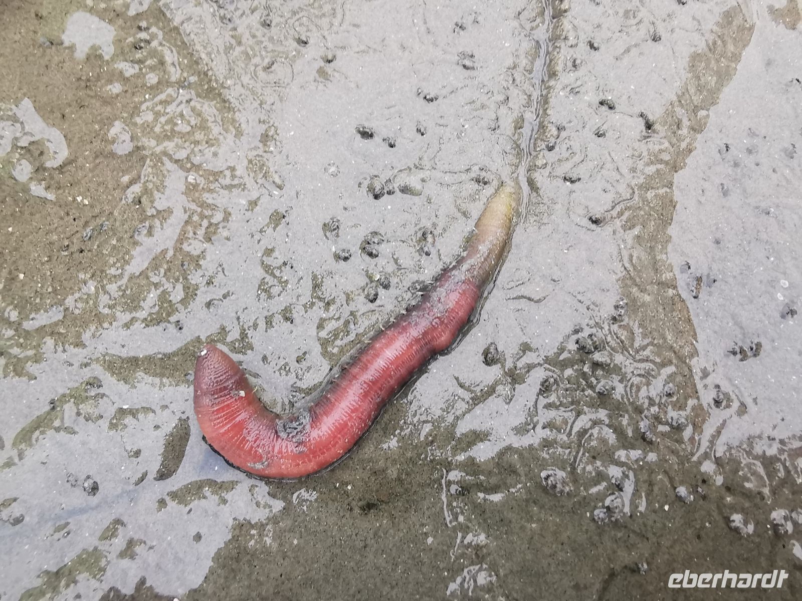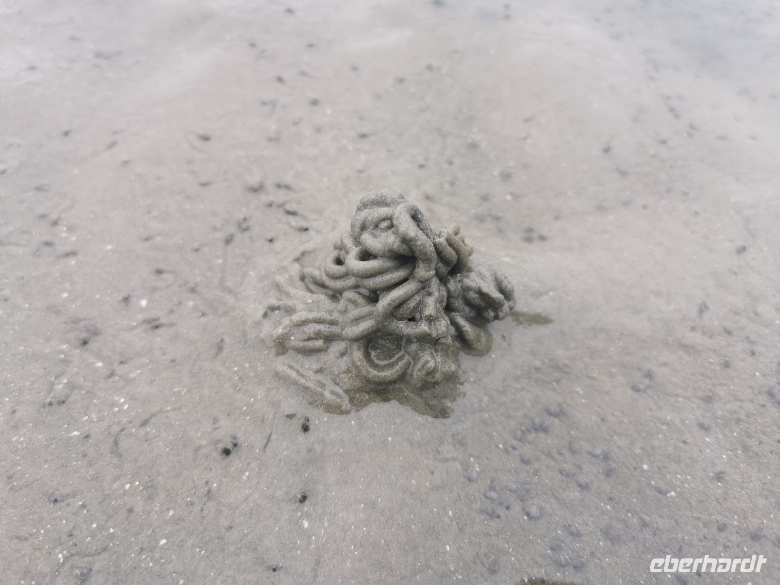Wir machen sofort Bekanntschaft mit den Wattwürmern, die den Sand regelrecht filtern und dann wieder ausscheiden, das Ergebnis sieht aus, wie schwarz gefärbte Spaghetti .