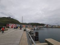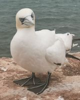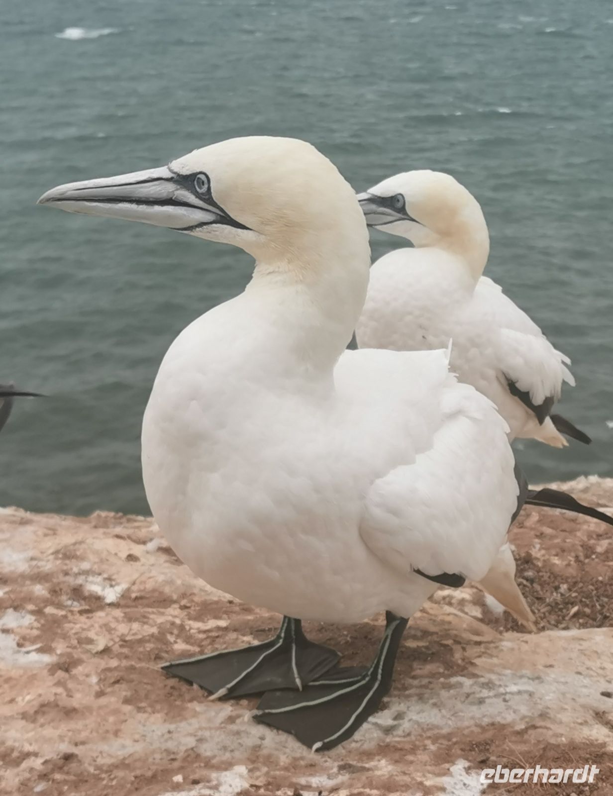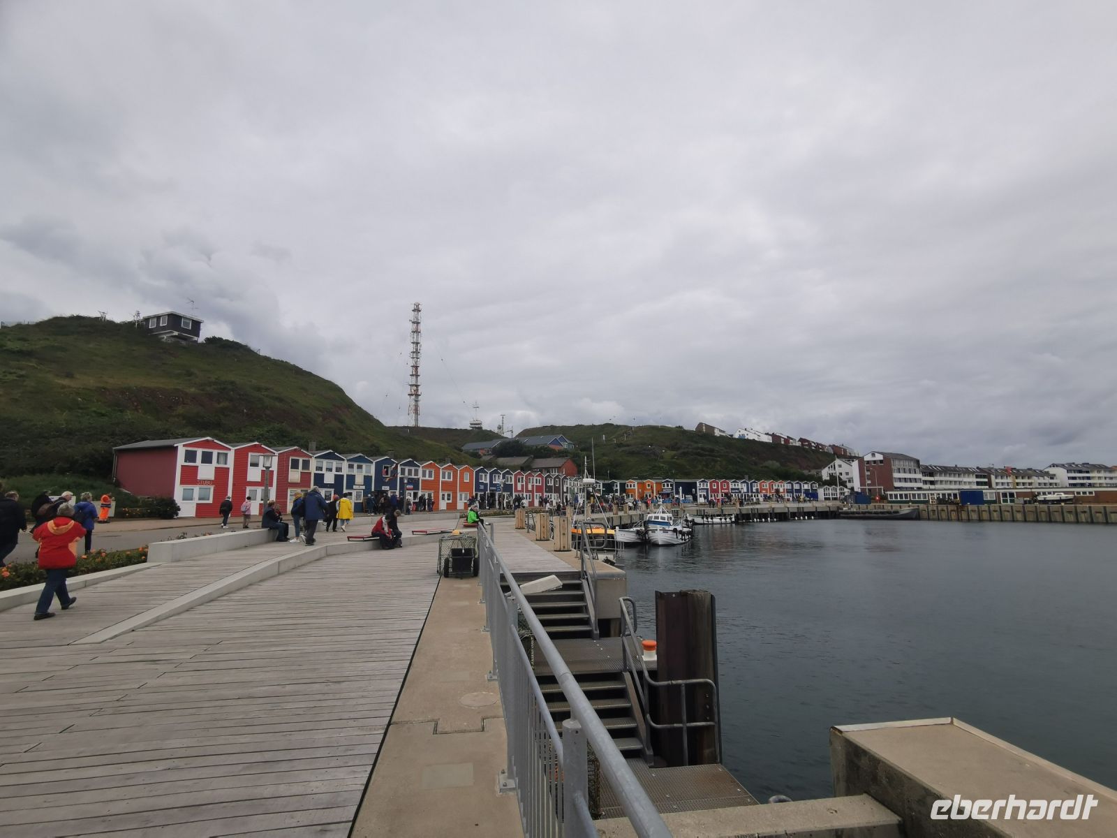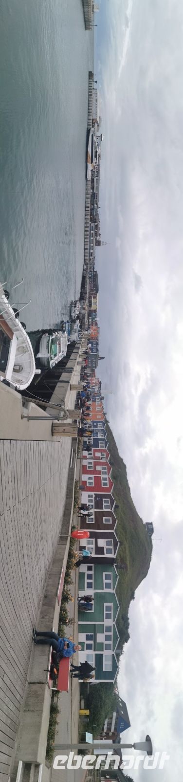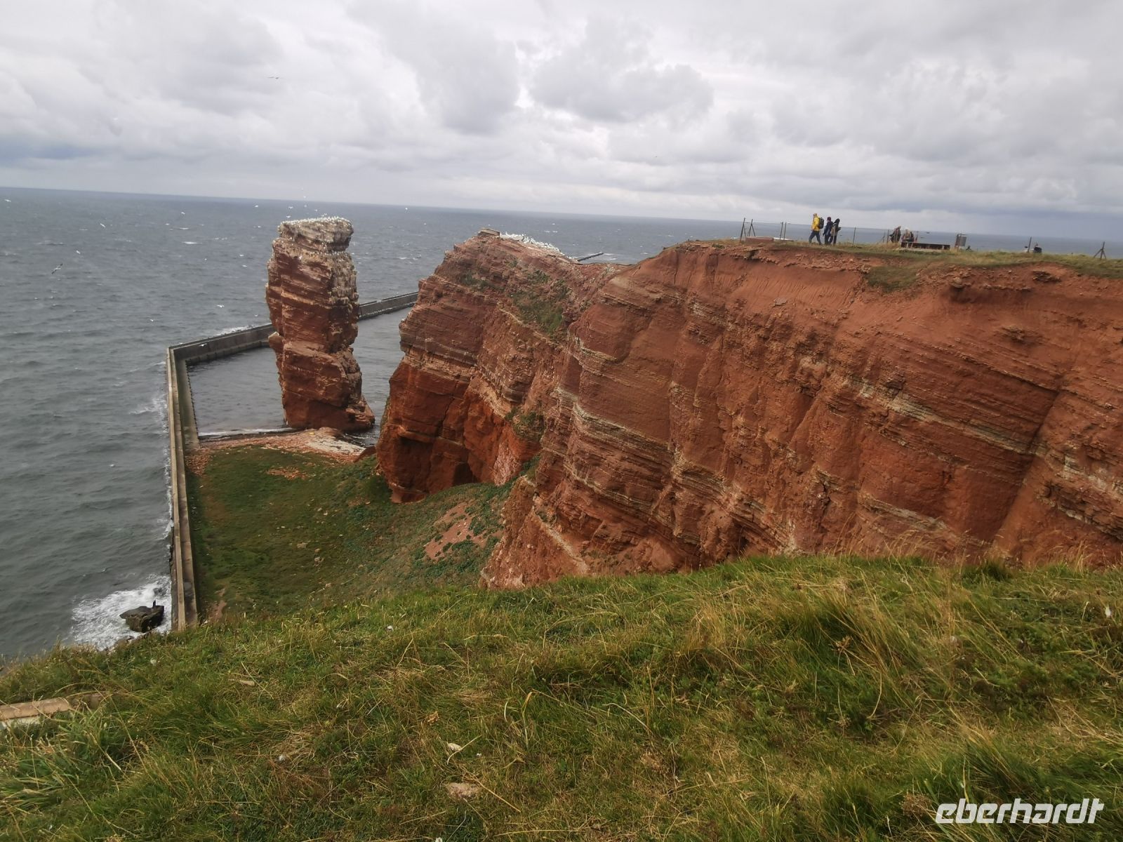 Wir laufen entlang der bunten Hummerbuden im Hafengelände und steigen dann die 184 Stufen zum Küstenrundweg hinauf. Obwohl es trübe, wolkig und windig ist, genießen wir die frische Luft und die tollen Ausblicke ins Meer und auf die roten Inselfelsen. Beim Wahrzeichen, der langen Anna, siedeln unzählige Basstölpel und veranstalten einen ohrenbetäubenden Lärm. Dieser gänsegroße Meeresvogel wurde hier erstmalig 1992 gesichtet, die Flugmanöver dieser Vögel sind spektakulär, im rasant schnellen Sturzflug stürzen sie fast senkrecht ins Meer zum Jagen. Wir sind fasziniert.