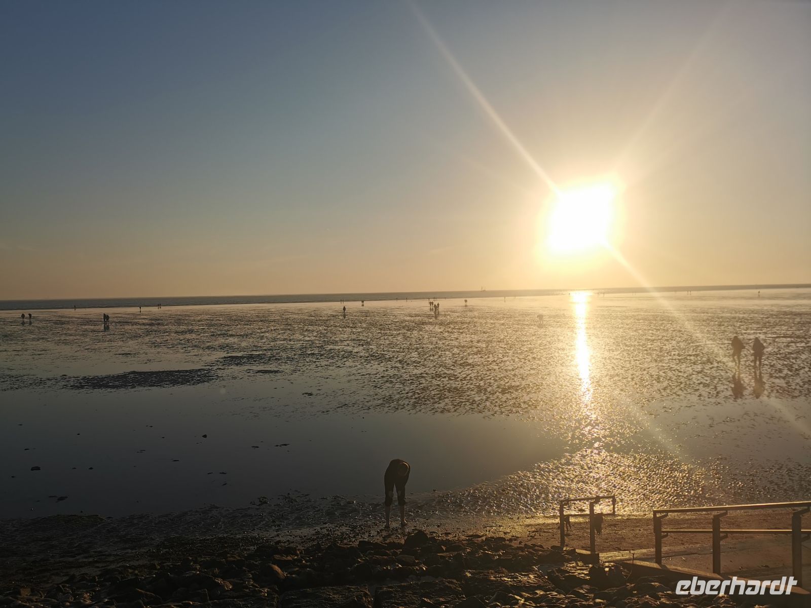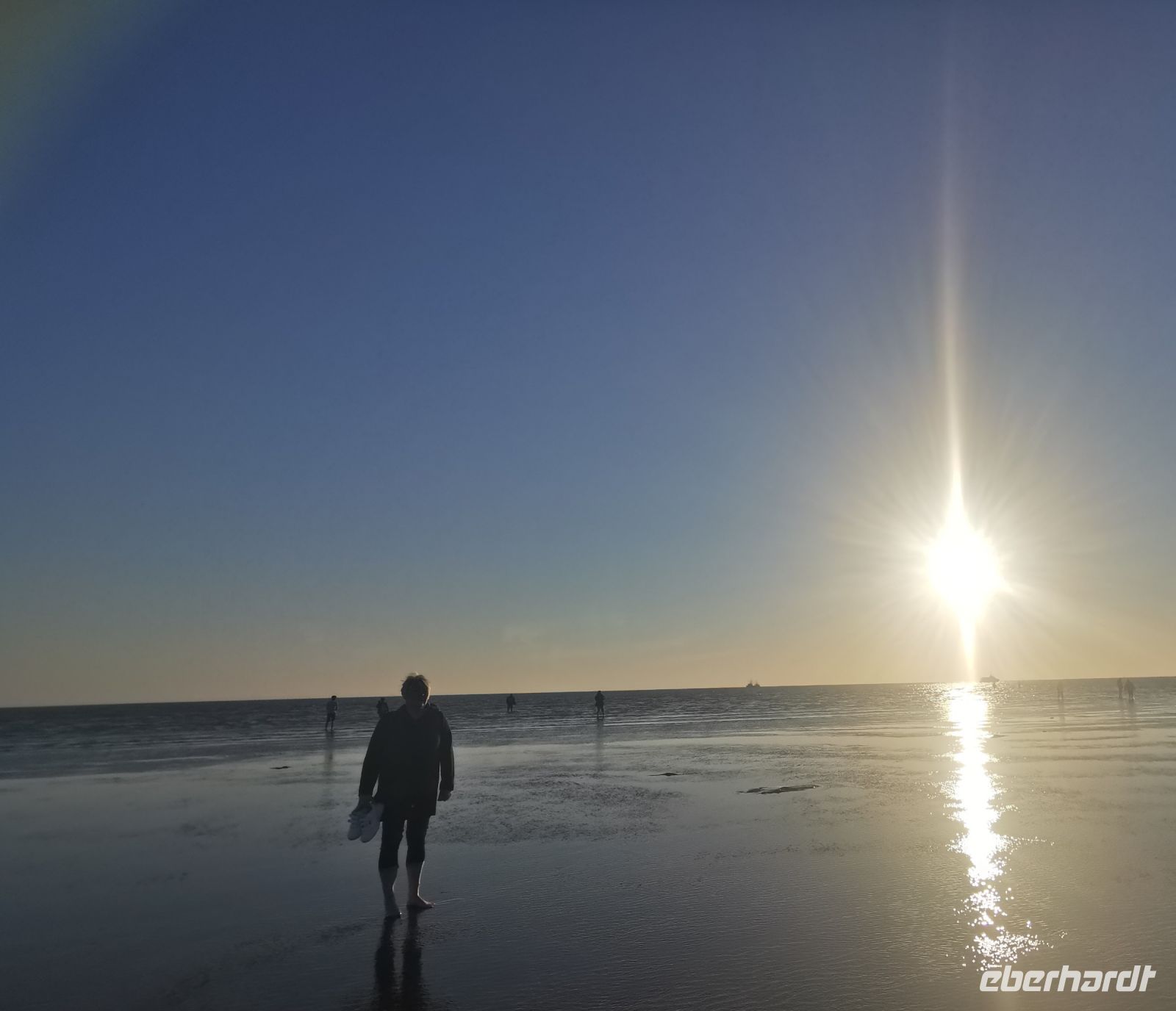 Am Ende der Wattwanderung dürfen ein paar Mutige mit geschlossenen Augen ihre Orientierung beweisen. Sie sollen zurück zum Hotel laufen. Das ist ein großer Spaß für alle, denn die meisten biegen schnell ab, irgendwohin, nur nicht mehr in Richtung unseres Hotels.