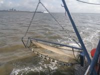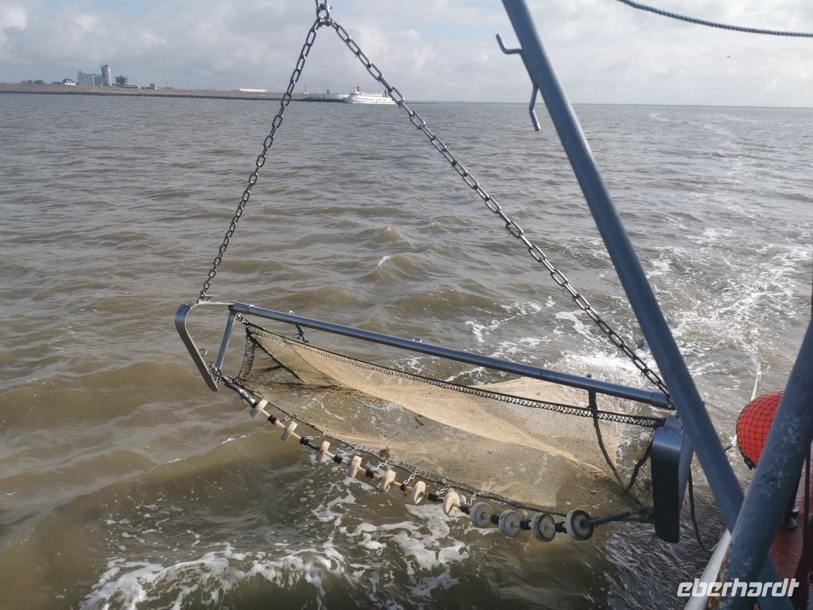Weit raus fahren wir gar nicht, schon wird das Netz ausgeworfen. Es ist ein originales Krabbenfangnetz, allerdings im Kleinformat. Diese Netze werden auf den Nordseegrund abgesenkt und wir sind schon gespannt, was so alles drin sein wird.