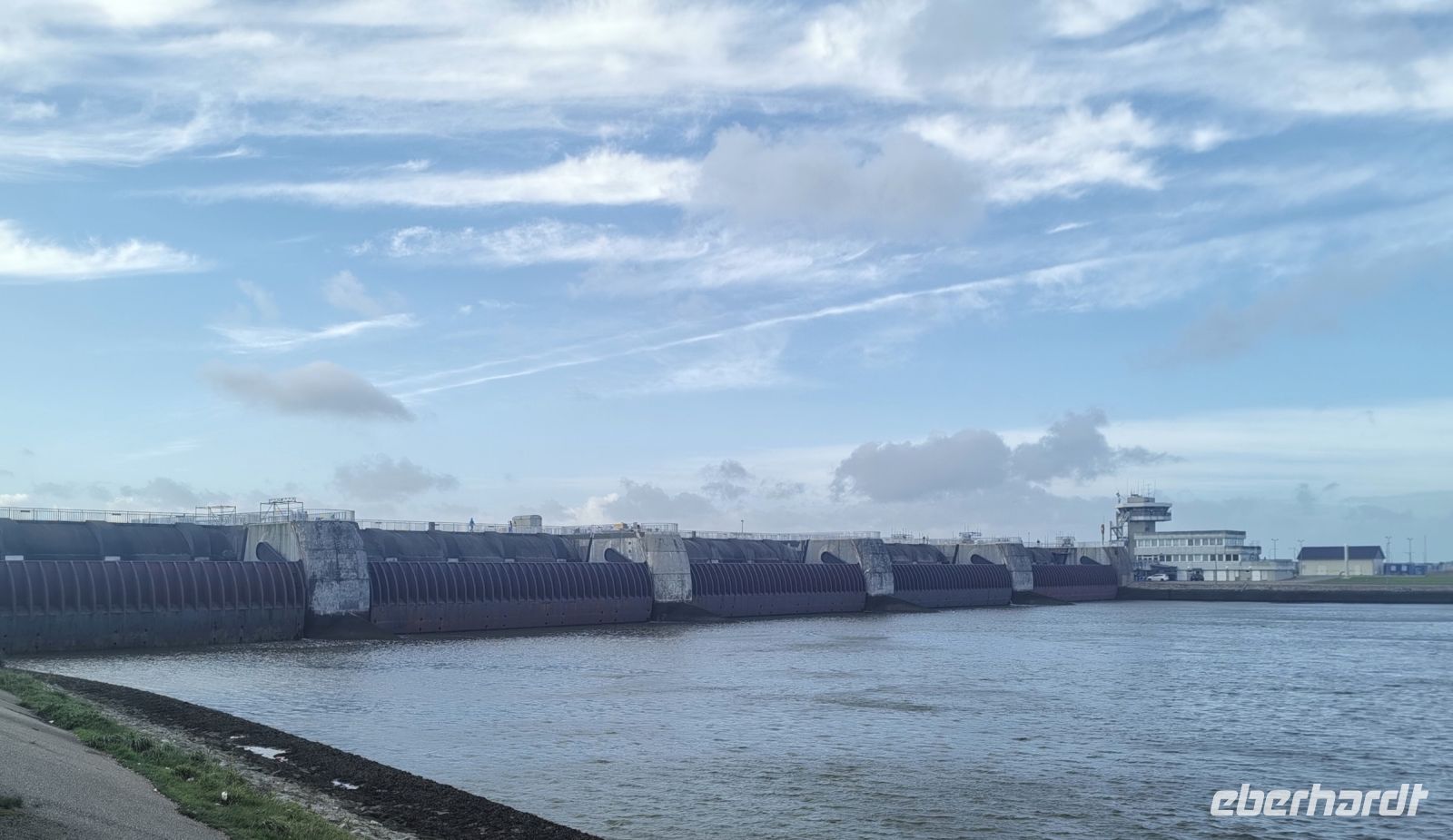 Nun wagen wir uns weiter bis zum Eidersperrwerk, diesem gigantischen Bauwerk aus dem Jahre 1973, mit dem versucht wird, die Sturmfluten der Nordsee in Schach zu halten. Genau an der Mündung der Eider in die Nordsee verhindert dieses Sperrwerk seitdem erfolgreich mit seinen gigantischen 5 Toren, daß es wieder zu einer Jahrhundertflut wie 1962 kommt, wo das Wasser bis nach Hamburg hinein schwerste Schäden anrichtete.