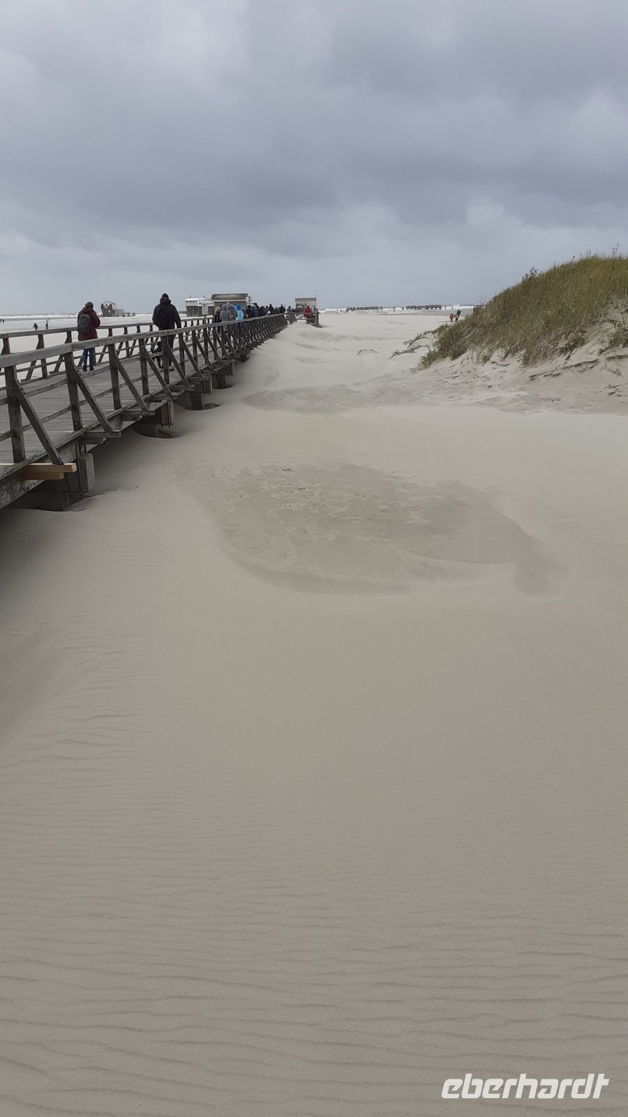 Weiter geht´s nach St. Peter Ording. Unseren ersten Versuch, diesen wunderschönen 12 km langen und bis zu zwei km breiten Sandstrand zu sehen, machen wir in der Nähe des Restaurants Seekiste. Dort erwartet uns bereits ein Mitarbeiter der Küstenwache, der erklärt, daß aufgrund der Wetterverhältnisse und des Sturms der Strand komplett gesperrt wurde und wir nicht vom Deich dürfen. Traurig ziehen wir von dannen und versuchen es erneut im Zentrum von St. Peter Ording. Dort fängt es auch noch stark zu regnen an und nur einige Mutige trauen sich runter zum Sandstrand. Einzigartig hier sind die sogenannten Giftbuden, Pfahlbauten, die auf bis zu sieben Meter hohen Pfählen aus dem Sand ragen. Ihre Namen haben sie vom norddeutschen Wortspiel, daß es in ihnen nach dem Sprung ins kühle Naß "wat geev". (etwas gibt). Als sie 1911 gebaut wurden, dienten sie bereits damals dem Wohlbefinden der Strandgäste. In ihnen befanden sich sowohl die Badeaufsicht, die Umkleiden als auch kleine Cafés und Kneipen.