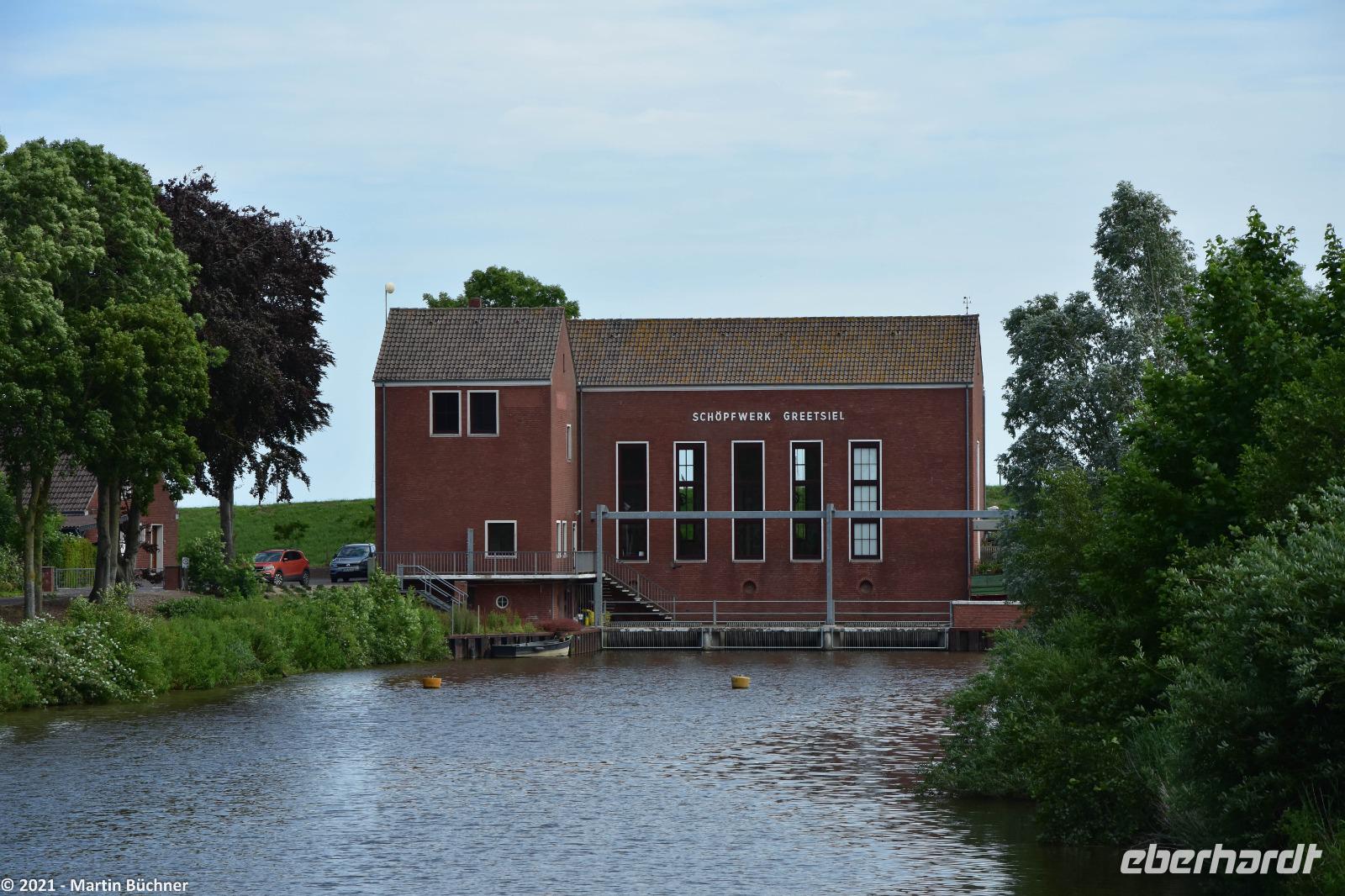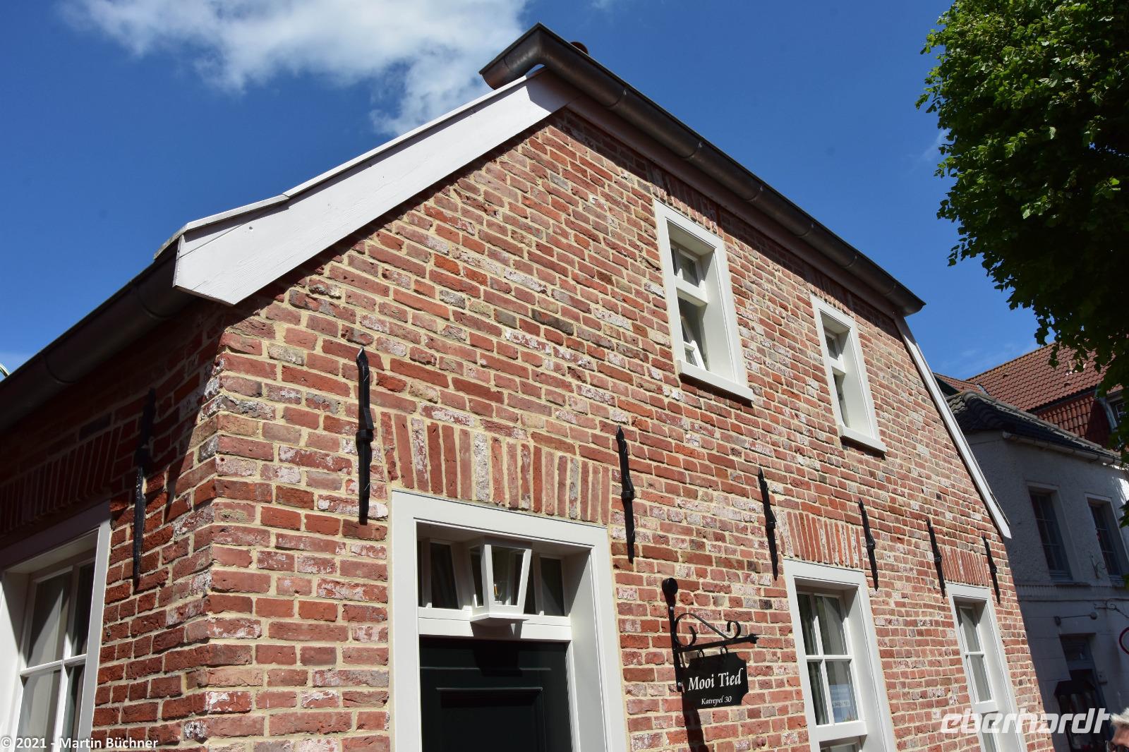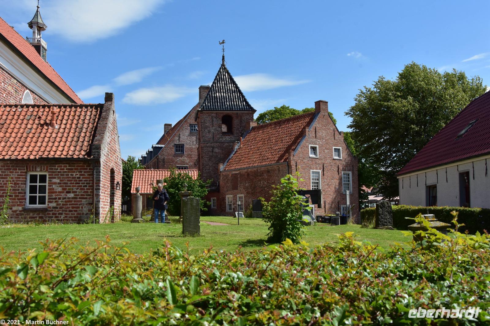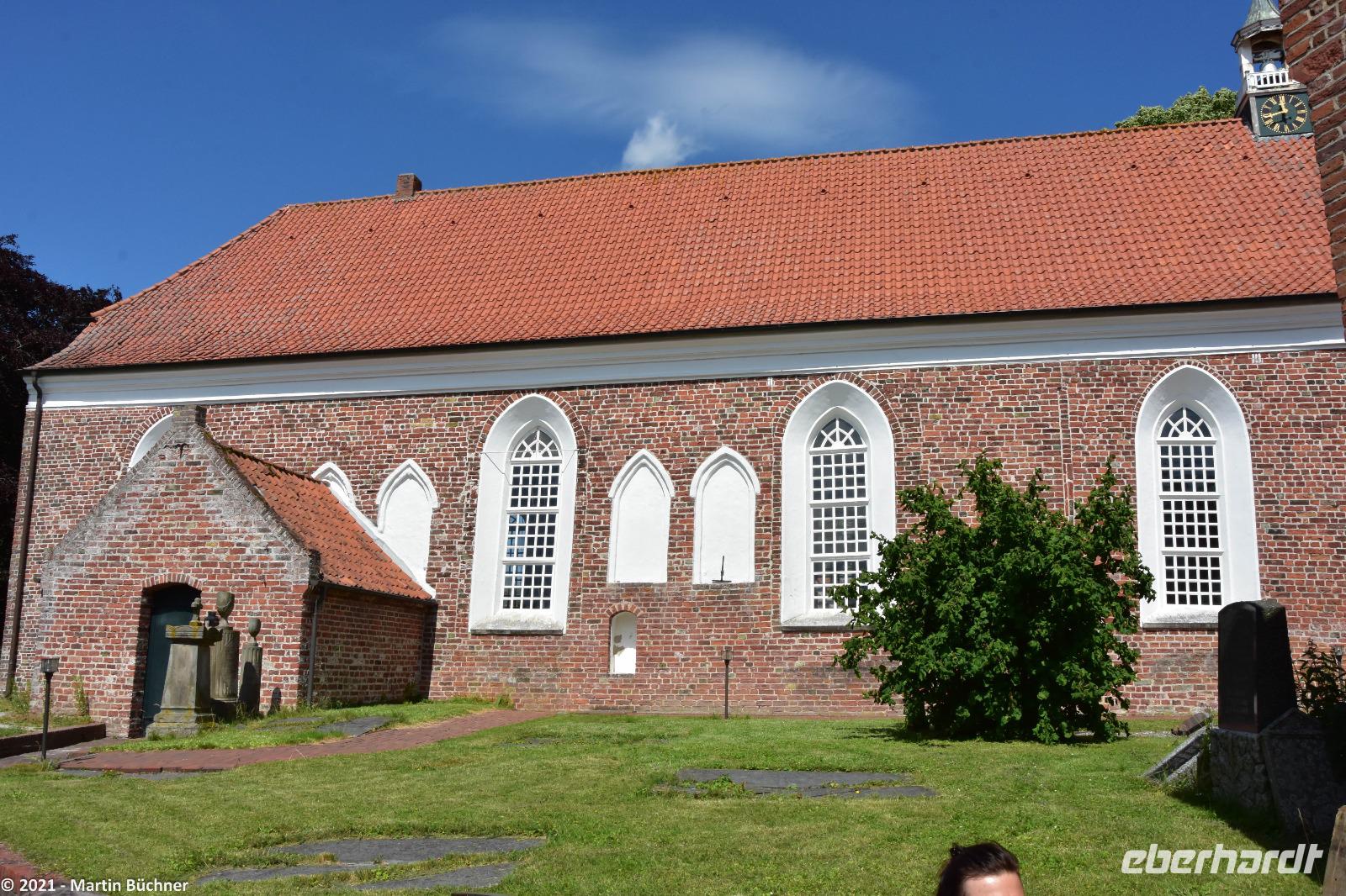 Im nahen Dorf Greetsiel scheint die Zeit stehen geblieben zu sein. Nordseeromantik mit Krabben- und Fischkuttern im Sielhafen. Friesische Gebäude wie ein riesiger Gulhof, die Kirche, Kapitänshäuser und vieles mehr sind bestens erhalten. Niederländische Einflüsse wie der niederländische Barock sind unübersehbar. Dabei stellt das Bauen in einer Marschlandschaft eine besondere Herausforderung dar. Marschland ist Schwemmland, schwere Gebäude sinken über die Jahrhunderte schlichtweg ein. Heutzutage müssen tiefgründende Pfeiler (manchmal bis zu 15 Meter lang) in den morastigen Untergrund getrieben werden. Wird das nicht getan, sinken die Gebäude ab. Besonders gut zu sehen ist das an der Kirche. Die unteren Backsteinreihen bilden schon lange keine Waagerechte mehr, der ständig Winddruck erfüllt sein Übriges, was zu einer deutlich „windschiefen" Fassade der Kirche geführt hat.