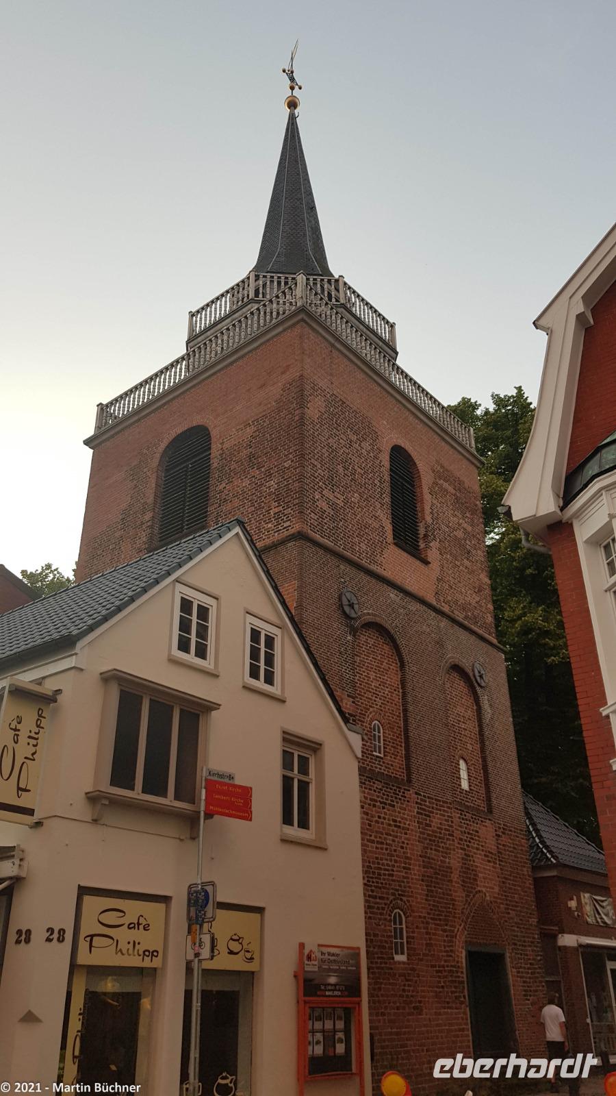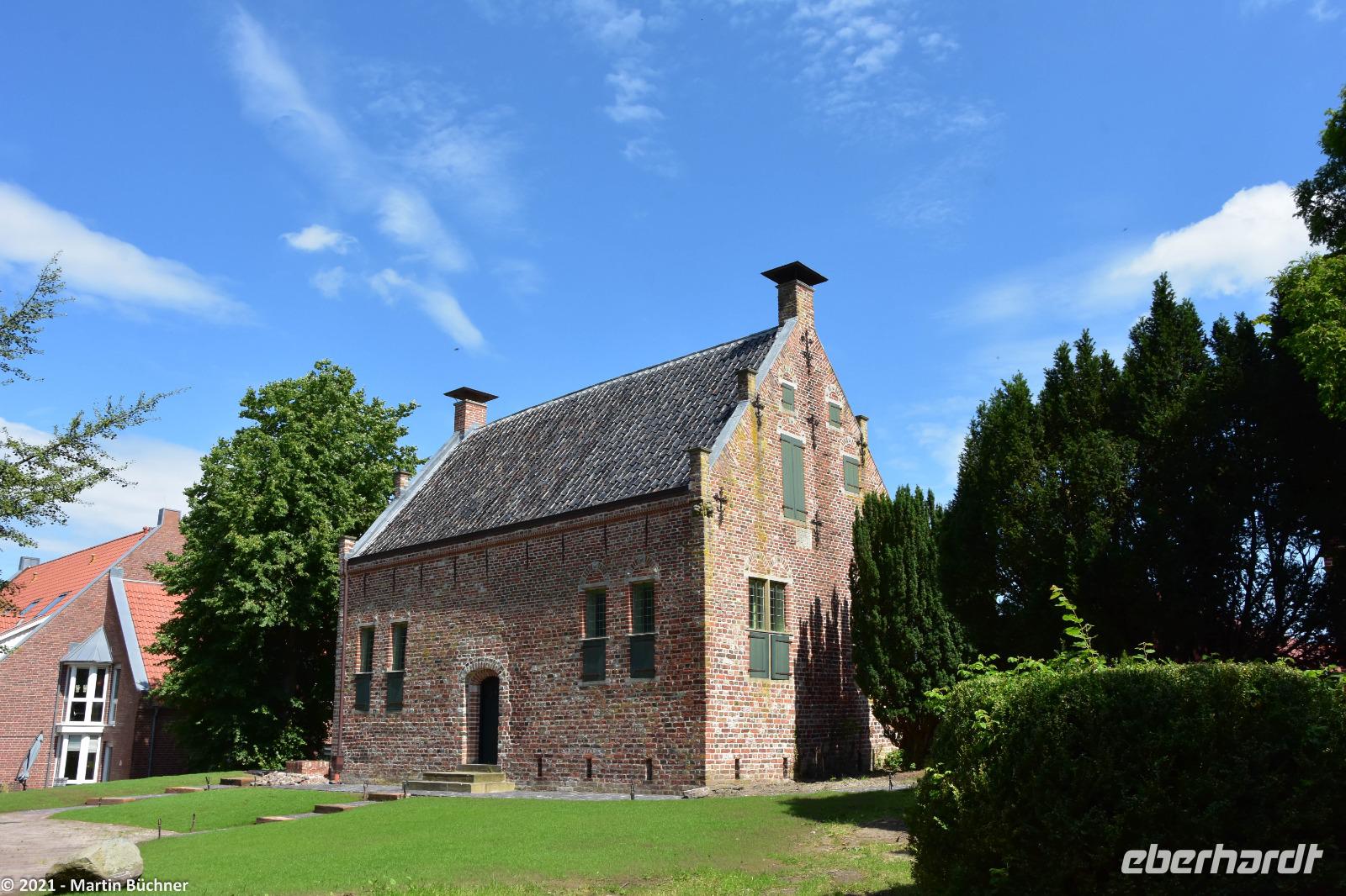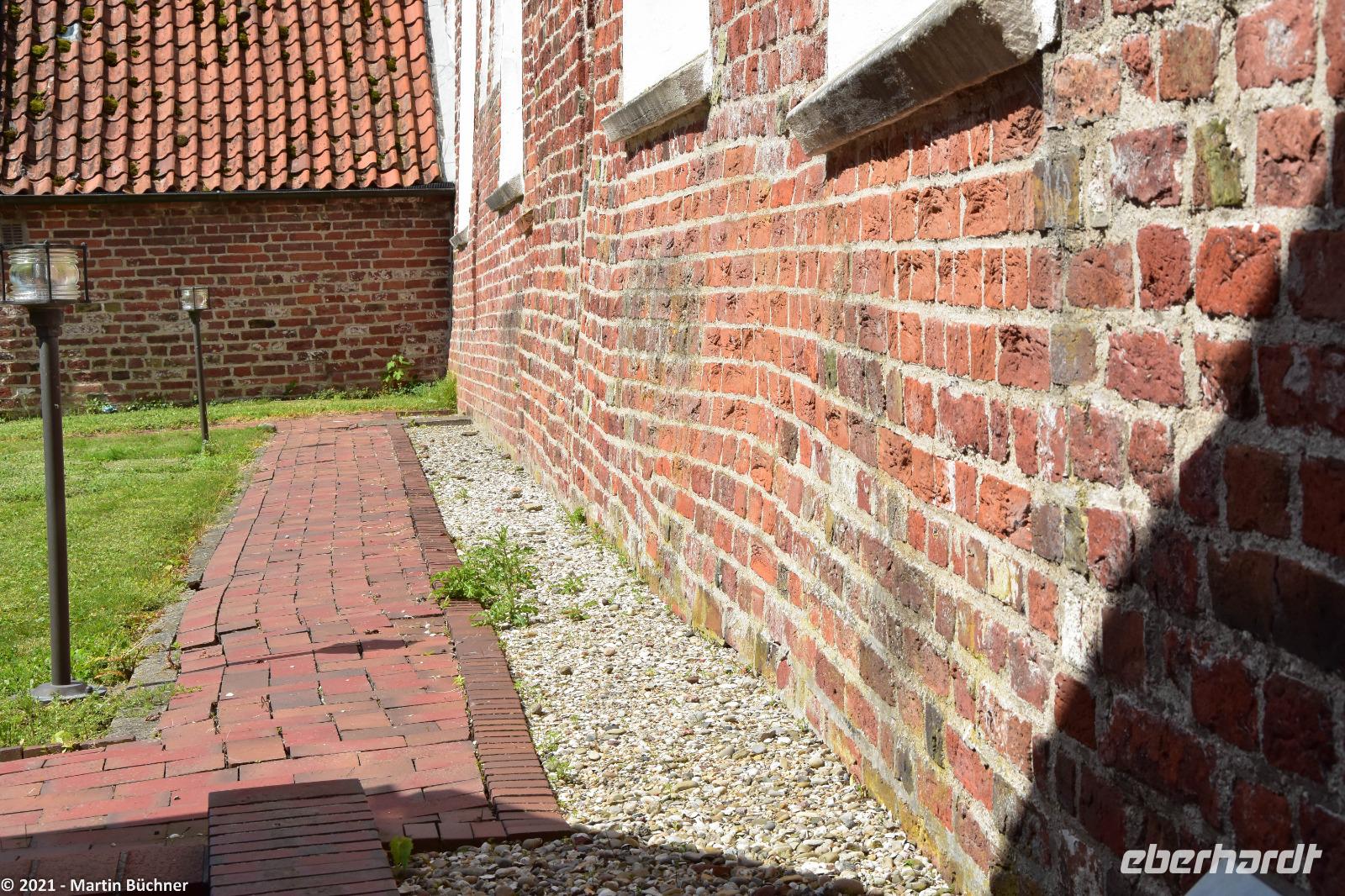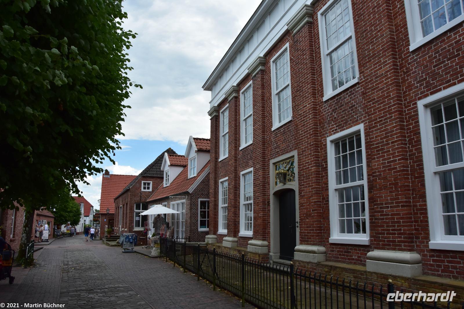 Im nahen Dorf Greetsiel scheint die Zeit stehen geblieben zu sein. Nordseeromantik mit Krabben- und Fischkuttern im Sielhafen. Friesische Gebäude wie ein riesiger Gulhof, die Kirche, Kapitänshäuser und vieles mehr sind bestens erhalten. Niederländische Einflüsse wie der niederländische Barock sind unübersehbar. Dabei stellt das Bauen in einer Marschlandschaft eine besondere Herausforderung dar. Marschland ist Schwemmland, schwere Gebäude sinken über die Jahrhunderte schlichtweg ein. Heutzutage müssen tiefgründende Pfeiler (manchmal bis zu 15 Meter lang) in den morastigen Untergrund getrieben werden. Wird das nicht getan, sinken die Gebäude ab. Besonders gut zu sehen ist das an der Kirche. Die unteren Backsteinreihen bilden schon lange keine Waagerechte mehr, der ständig Winddruck erfüllt sein Übriges, was zu einer deutlich „windschiefen" Fassade der Kirche geführt hat.
