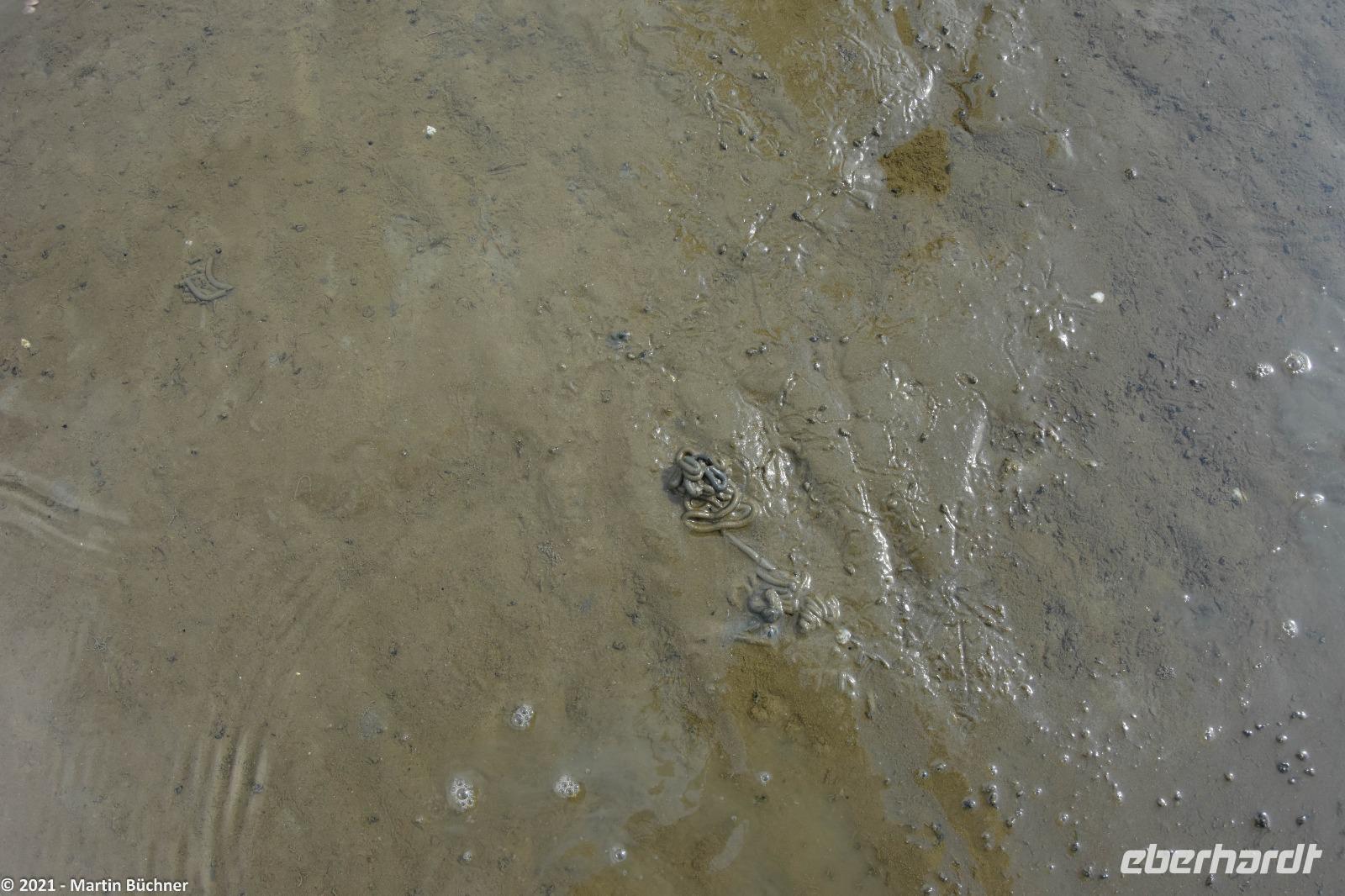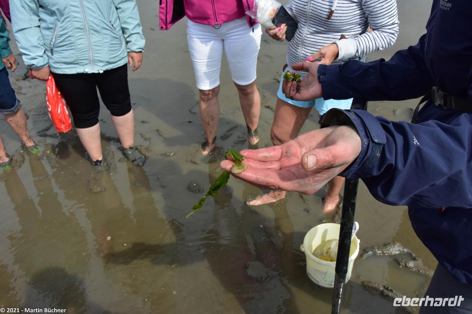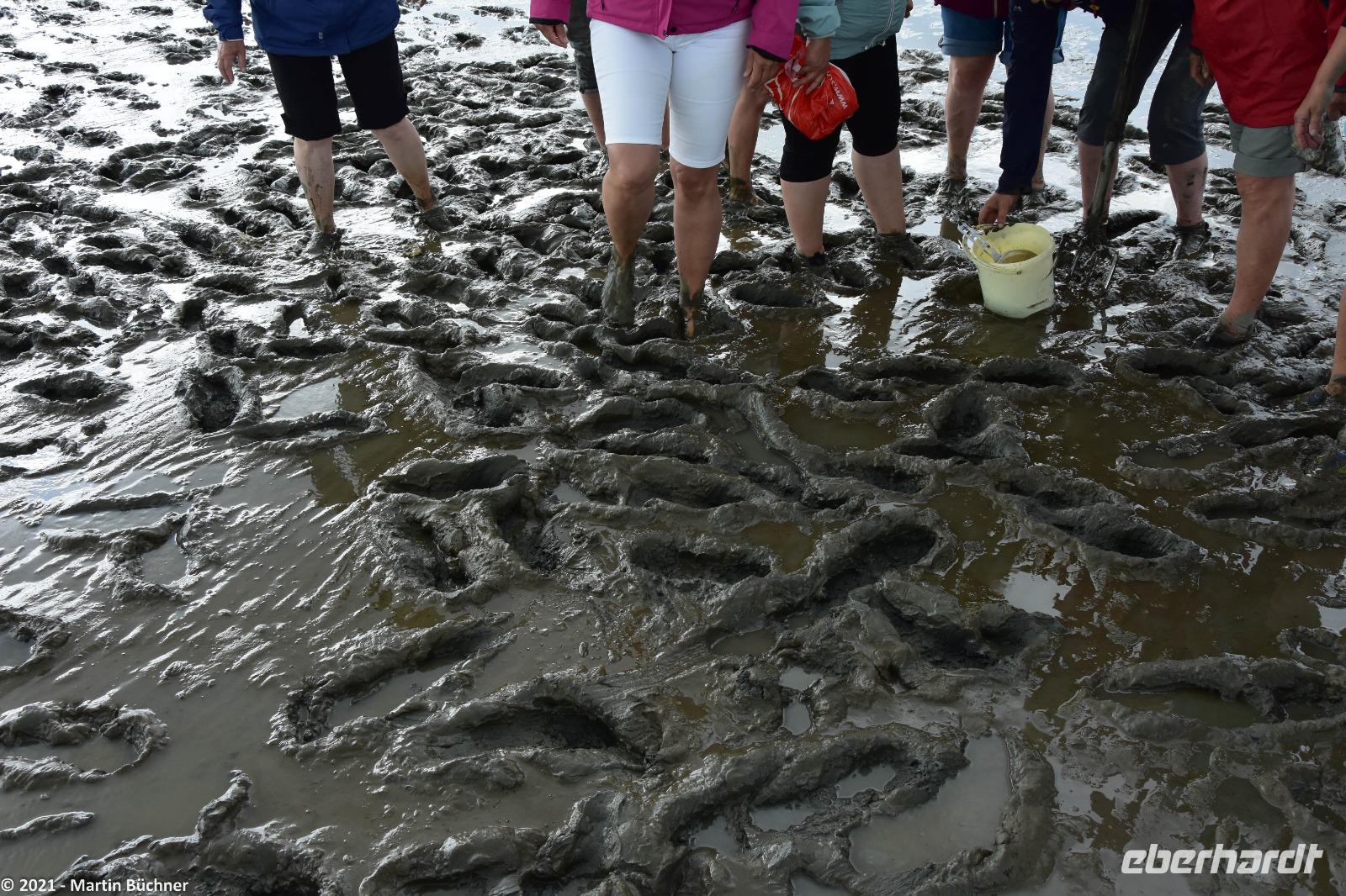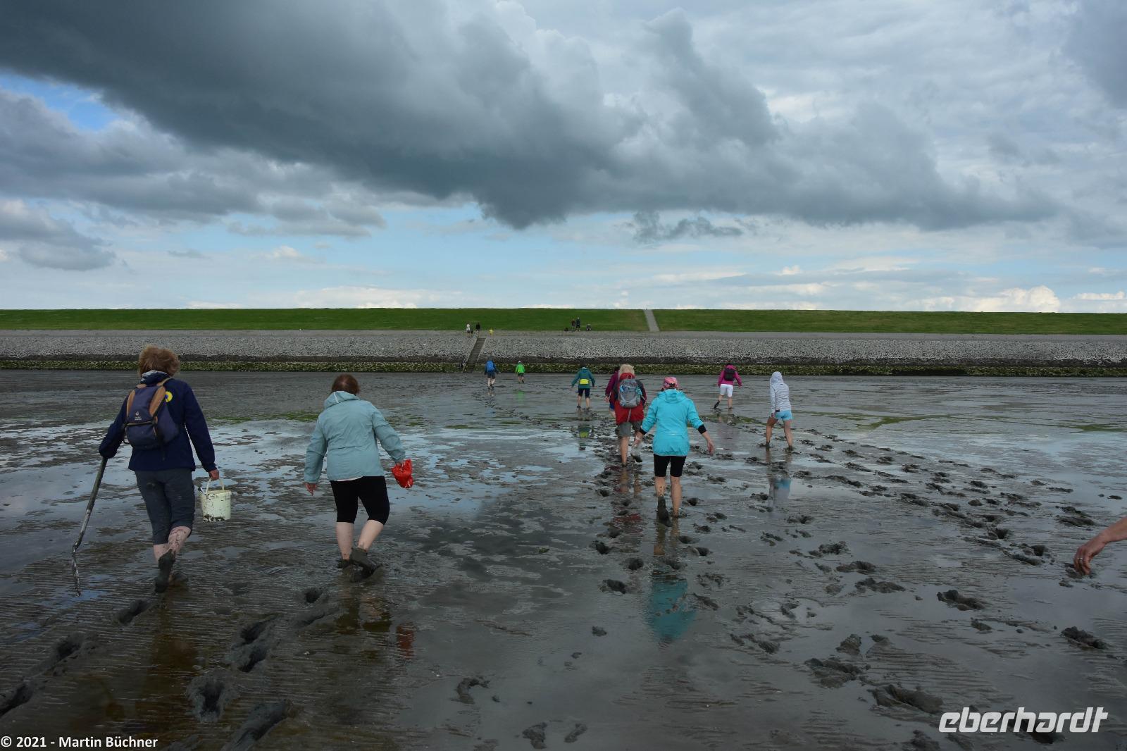 Nach einer Mittagspause und Freizeit bringt uns unser Bus auf die nahegelegene Halbinsel Krummhörn. Am Deich erwartet uns unsere Wattführerin. Wattwanderung sind natürlich immer eine „saubere Angelegenheit", wie wir schnell feststellen können. Barfuß, mit Strandschuhen oder so genannten Beachies (Socken mit fester Sohle) geht es ins Watt. Wir erfahren von den „Little Five" - („die kleinen Fünf"), diversen Muscheln, Ringelwürmern und natürlich dem berühmten Wattwurm immer auf der Spur. Kaum einer von unseren Gästen hat je mit eigenen Augen beobachtet, wie schnell sich eine freigelegte Muschel wieder in den Sand eingraben kann. Das müssen Muscheln, weil sie sonst ganz schnell eine Mahlzeit der „Flying Five" - „die fliegenden Fünf" werden. Ein wichtiger Vertreter neben den Silbermöwen ist der unüberhörbare Austernfischer.