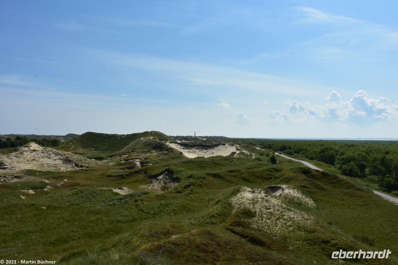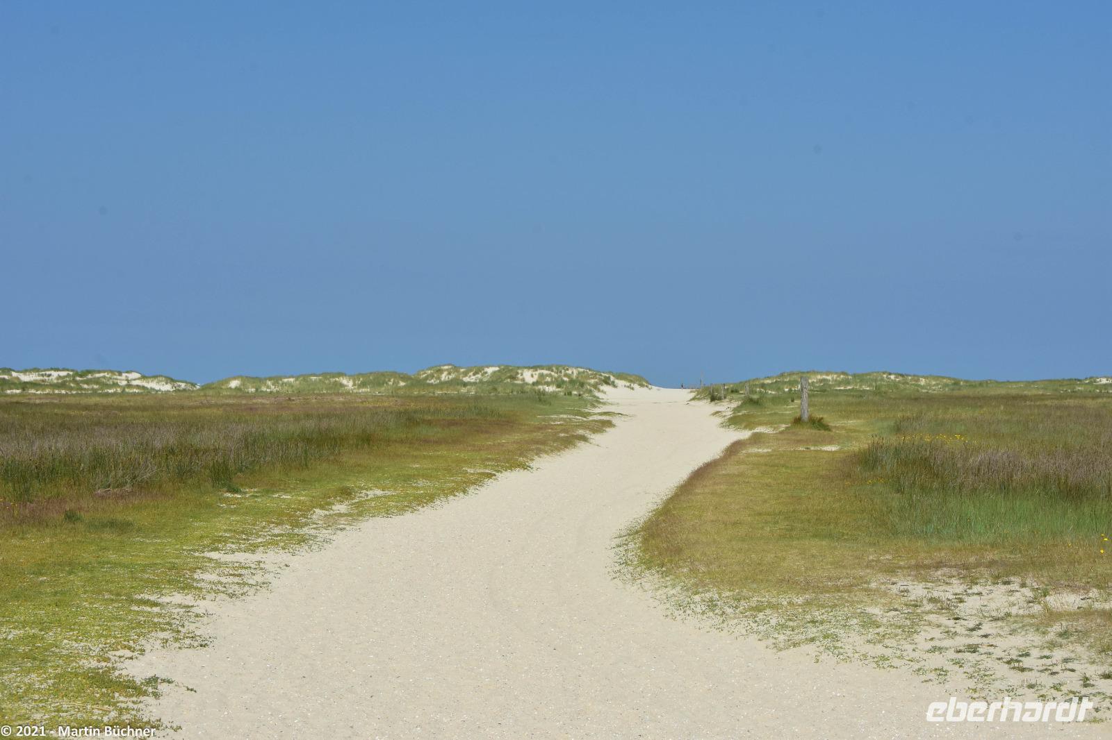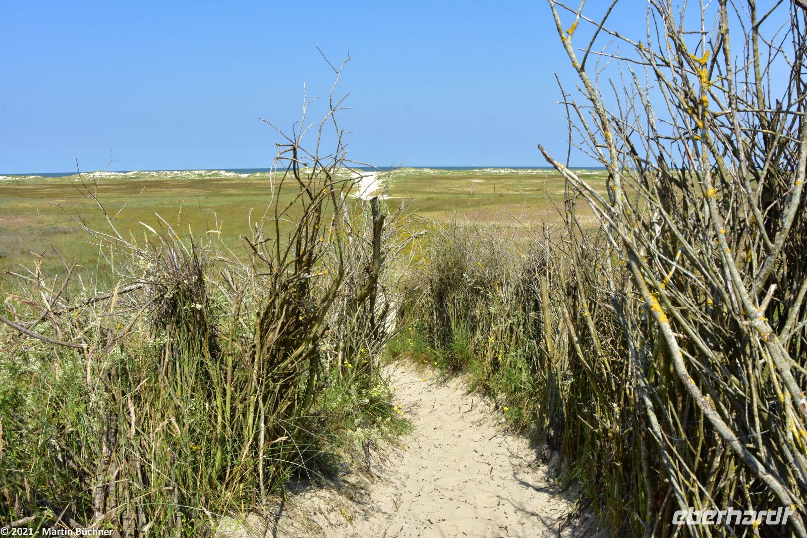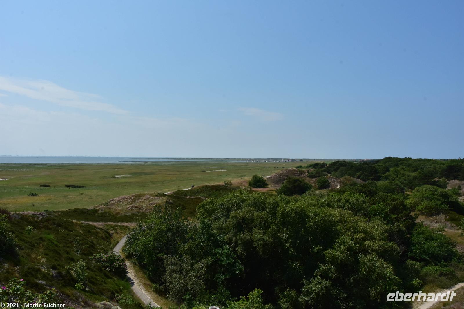 Über den „Wattweg" erreichen wir eine Aussichtsdüne. Hier liegt in Deutschland der einzige Punkt von dem man im Süden, Norden sehen kann. Gemeint ist natürlich die Stadt Norden auf dem Festland.