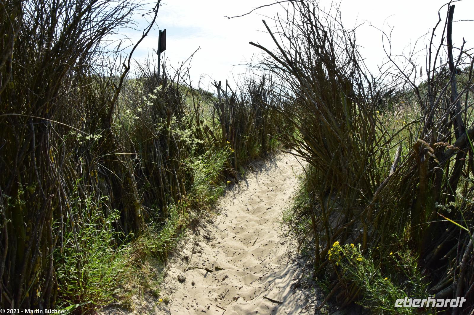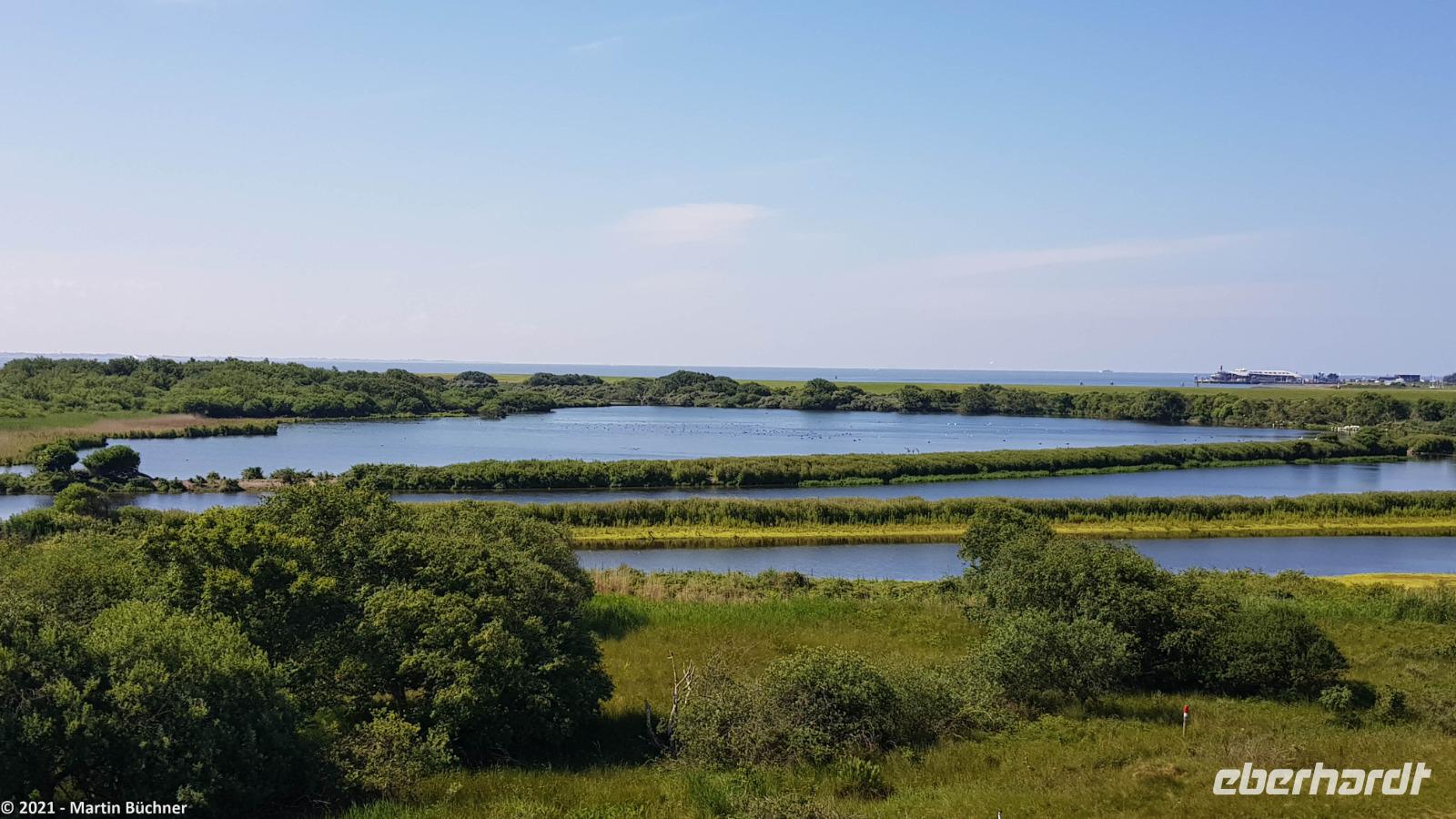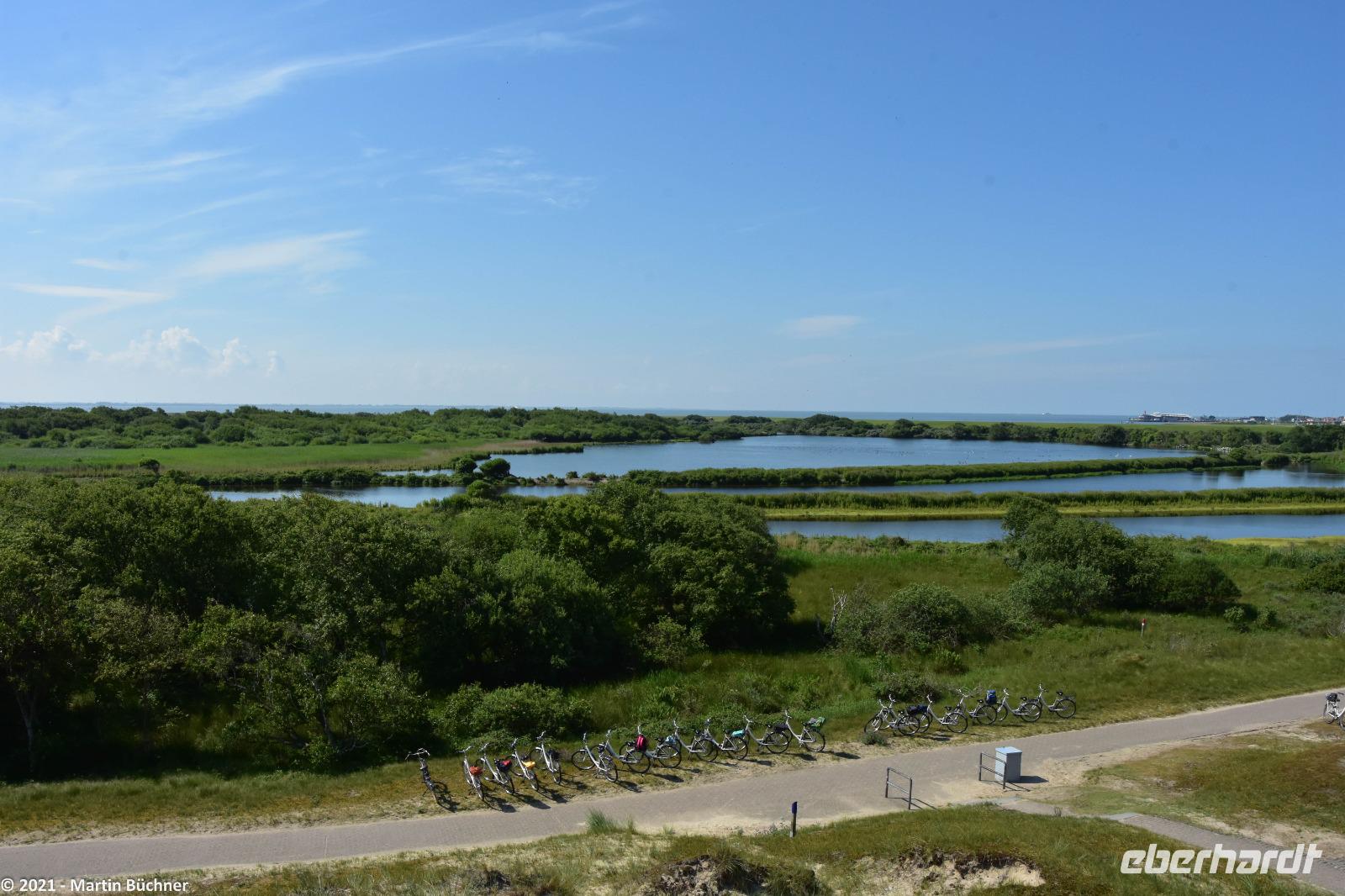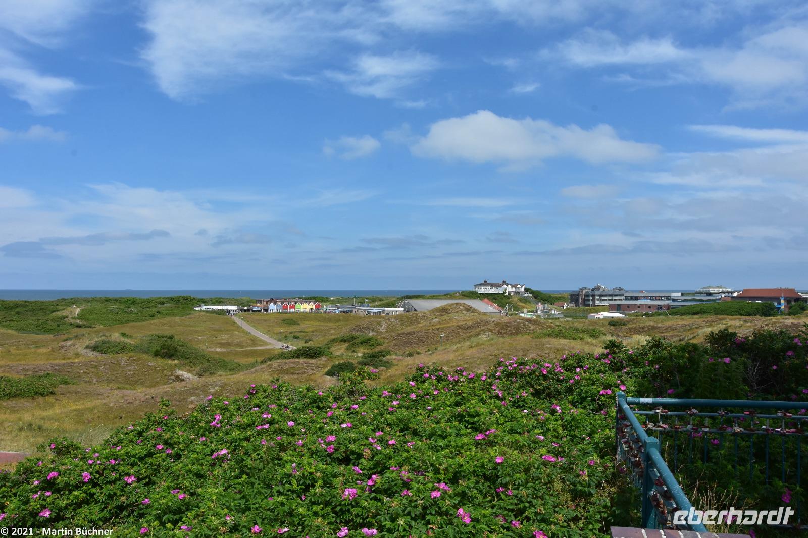 Über den „Wattweg" erreichen wir eine Aussichtsdüne. Hier liegt in Deutschland der einzige Punkt von dem man im Süden, Norden sehen kann. Gemeint ist natürlich die Stadt Norden auf dem Festland.