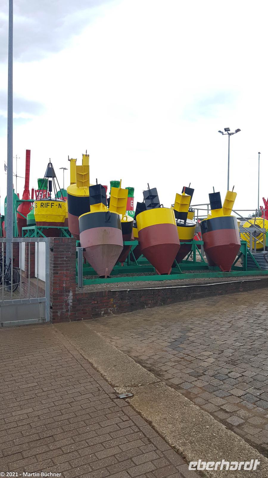 Unser lokaler Guide kann ebenfalls reagieren und startet ebenfalls eher zu unserer gemütlichen Radtour über Norderney. Wir starten im Hafen und am Tonnenhof von Norderney. Hier lagern für einen beträchtlichen Teil der Deutschen Bucht, die notwendige Betonnung. Von hier werden alle Wasserstraßen überwacht und mit der richtigen Betonnung markiert. Die Markierung erfolgt durch sog. Fahrwasserbegrenzungstonnen im Volksmund „Bojen" genannt.