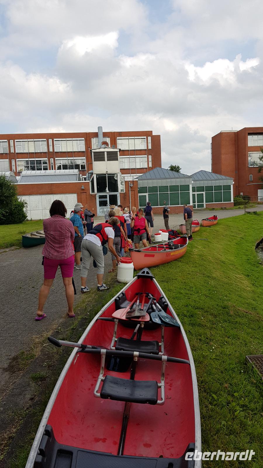 Am Nachmittag beginnt ein Höhepunkt, vielleicht der ganzen Reise: „Paddeltour auf den Emder Kanälen". Was erwartet uns? Die freudige Anspannung ist deutlich zu spüren. In 3er und 4er Kanadier werden wir in gut 2,5 Stunden durch Emder Kanäle paddeln. Teamwork ist angesagt. Boote abladen. Schwimmwesten anlegen. Teams bilden. Gegenseitig beim Einsteigen helfen... Es vergeht einige Zeit, dann sind alle im Wasser. Ich darf vorwegnehmen, dass niemand und zu keiner Zeit im Wasser landete! Entschleunigt geht es durch die engen Kanäle Emdens. Ein wunderschönes Erlebnis, dass viel Spaß bereitete.