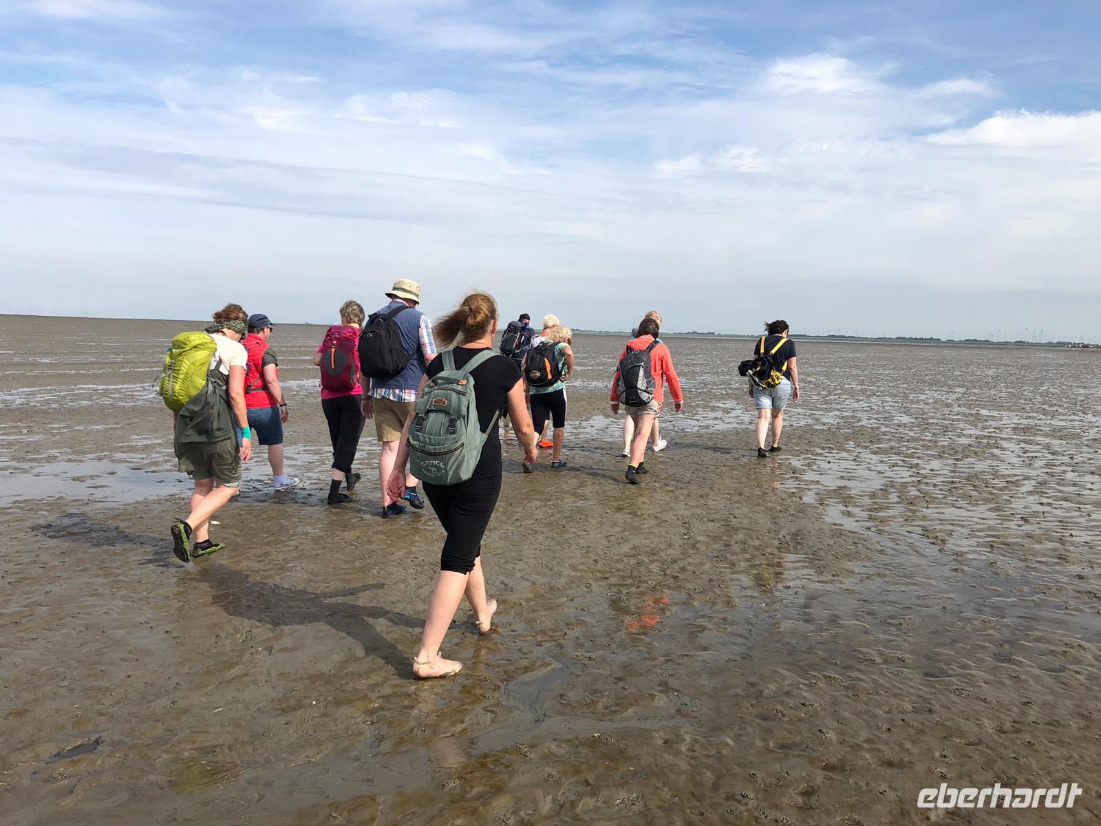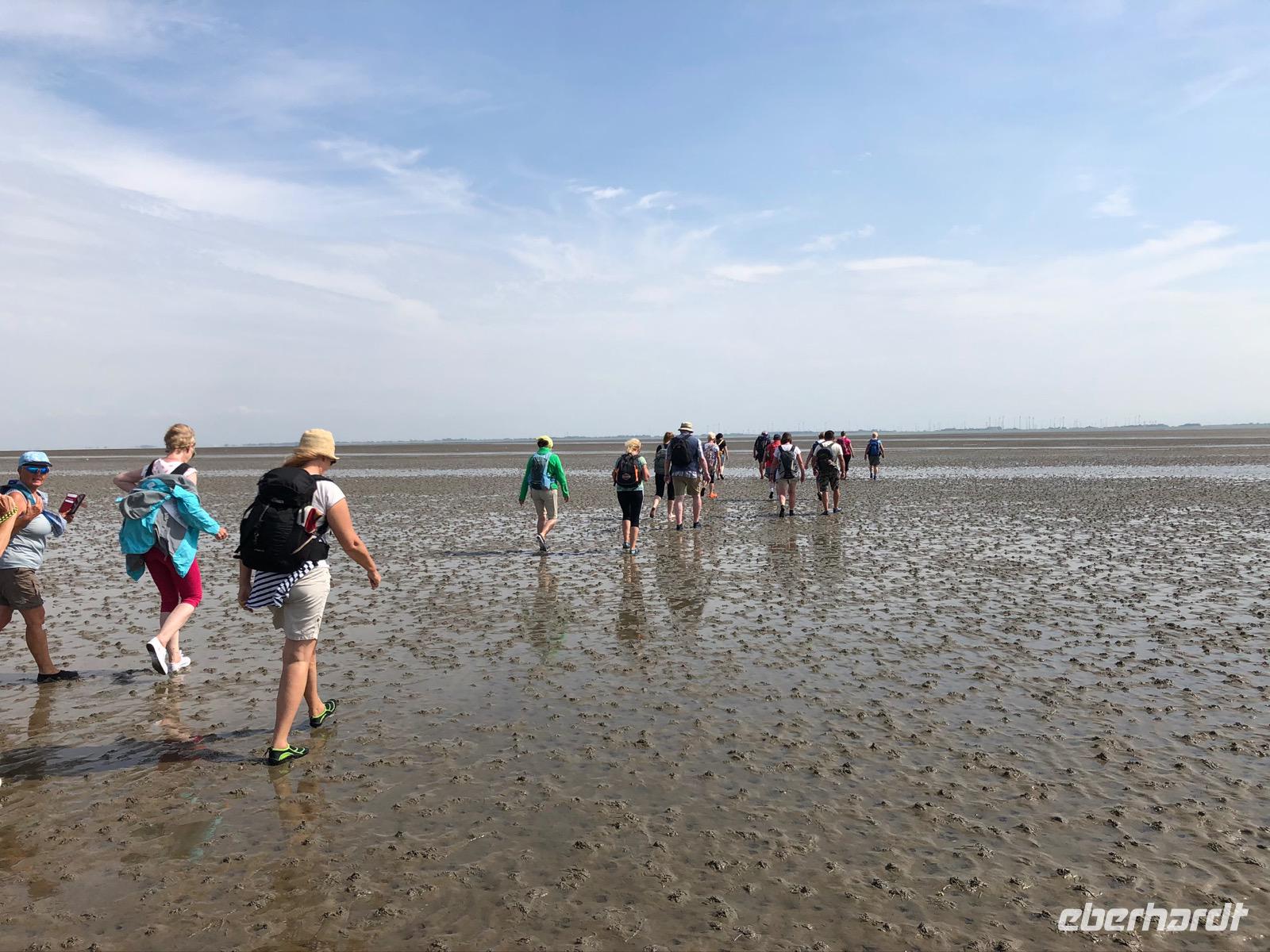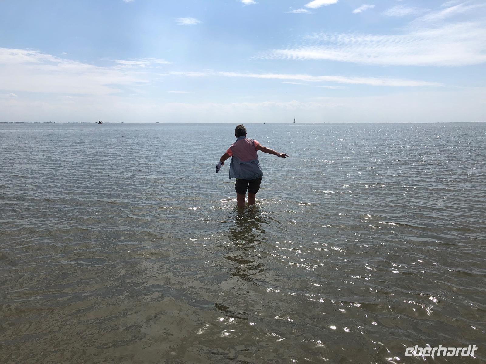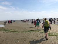 Eine Stunde Luft in Baltrum, aber das ging ja „balt(d)-rum"! Und so standen wir dann alle pünktlich am Treffpunkt und erwarteten schon gespannt unseren Wattführer Johann. Die Wattwanderung begann auch sehr interessant und reizvoll, dieses Gefühl, dort zu laufen, wo gerade noch Wasser war. Allerdings ist so eine Wattwanderung von Insel zurück auf das Festland nie homogen. Jahreszeitliche, wetter- und strömungsabhängige Veränderungen im Wattboden sind natürlich gegeben, unterliegen ständigen Veränderungen. So wurde die anfangs doch leichte Wanderung dann schnell zu einer zu durchkämpfenden Herausforderung im Schlickwatt. An Land angekommen haben wir erst einmal verschieden stark durchatmen müssen und waren erschöpft und froh, im trockenen Bus ins Hotel zum Abendessen gefahren zu werden.