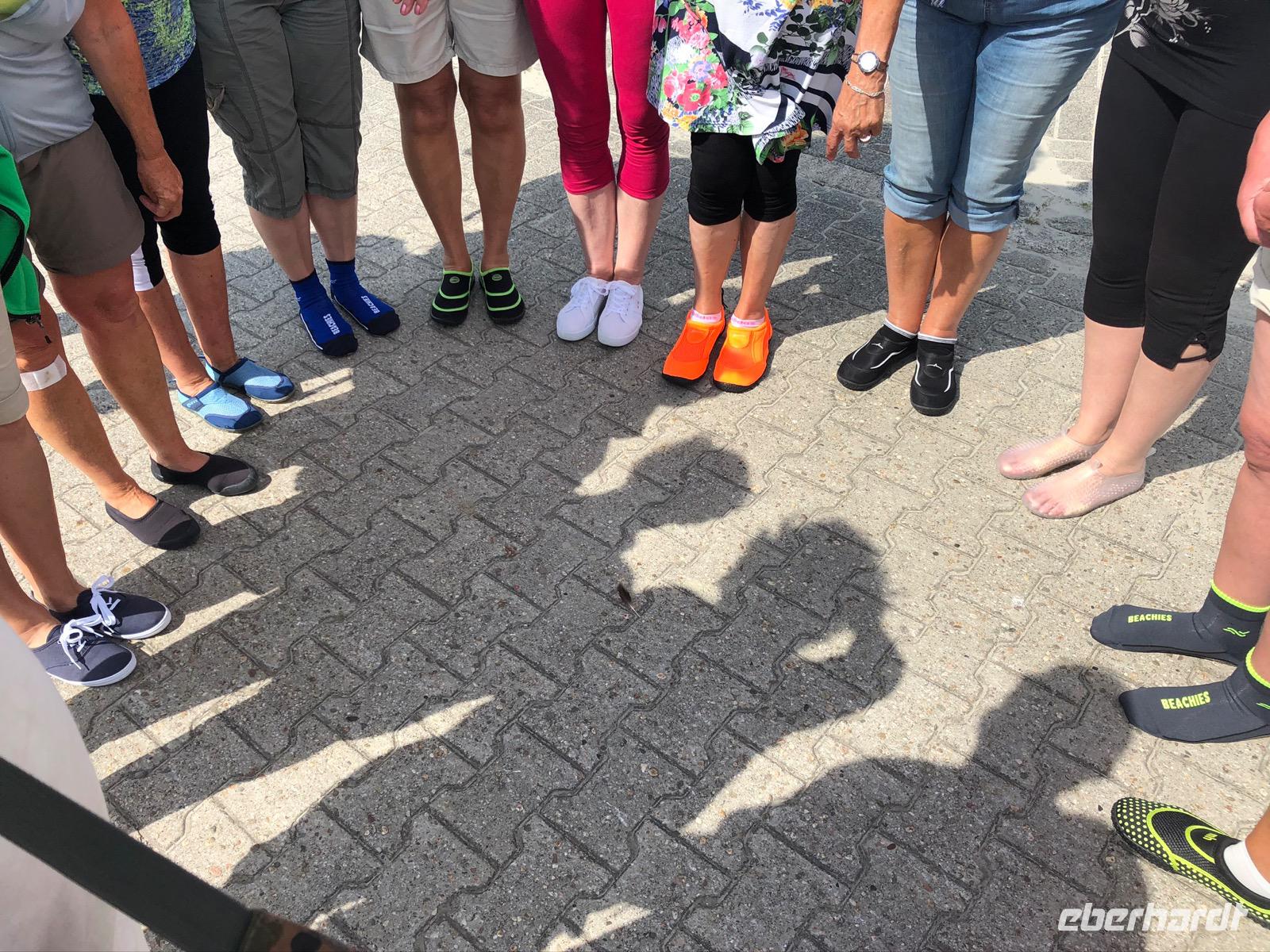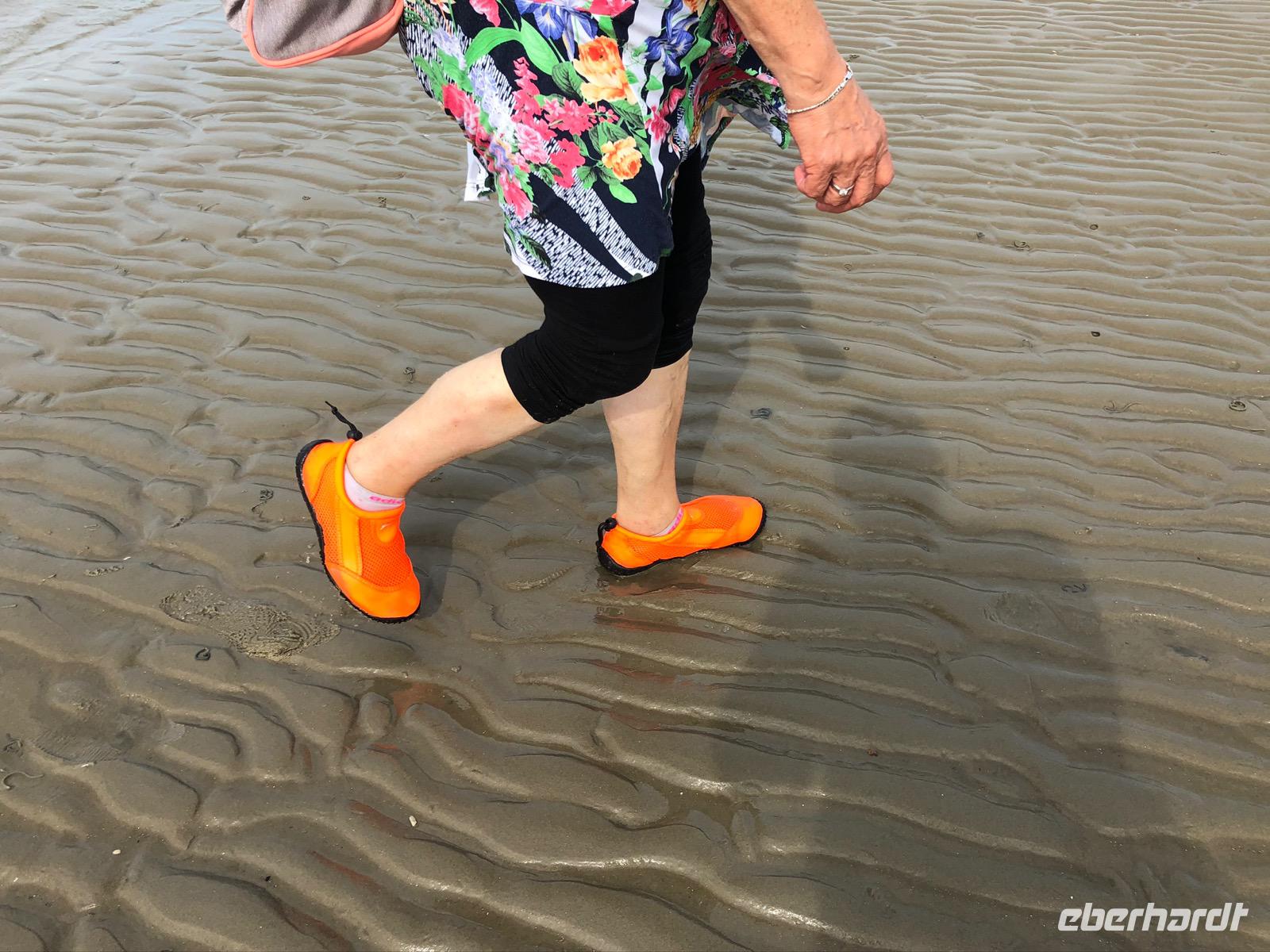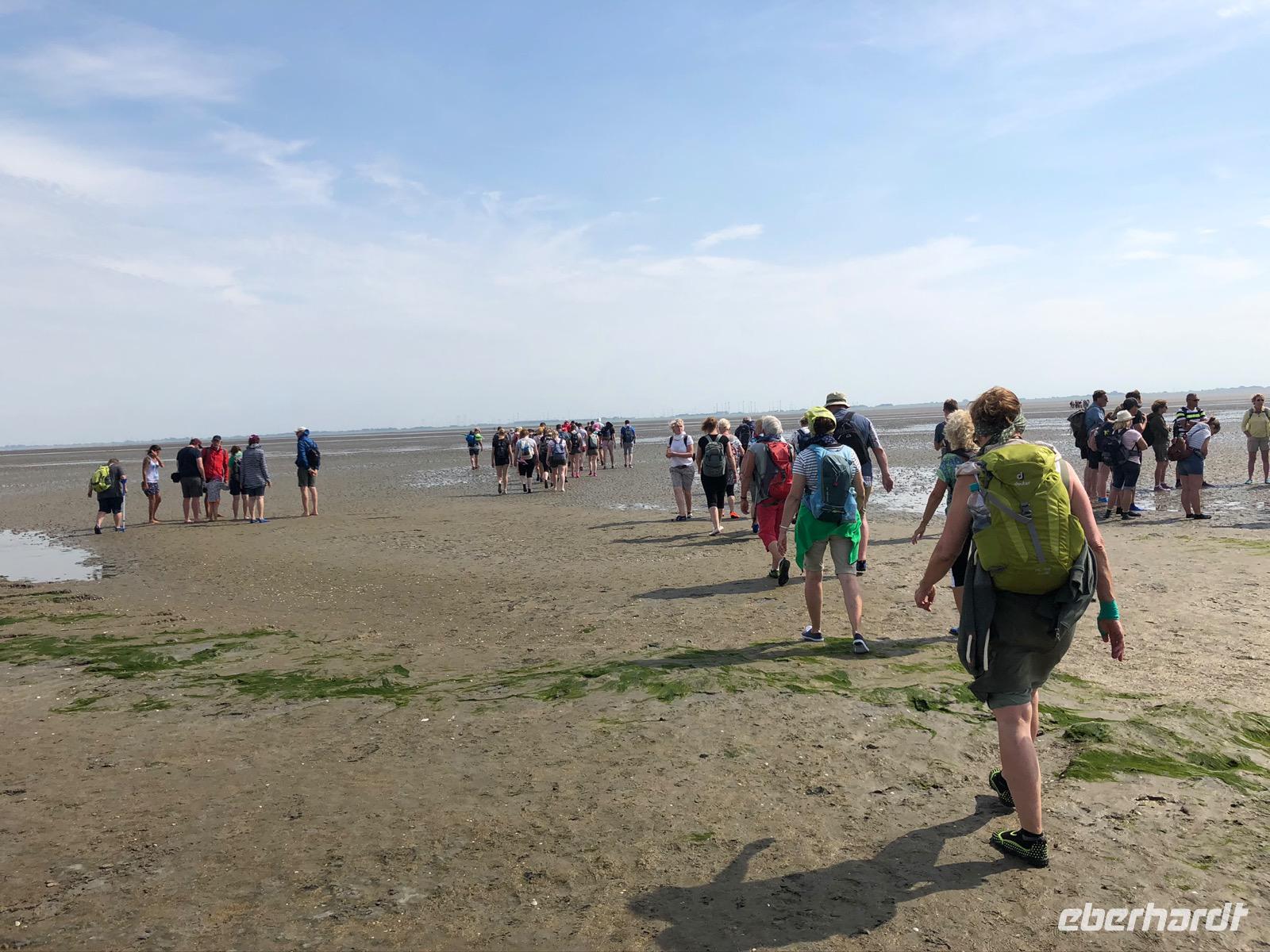 Eine Stunde Luft in Baltrum, aber das ging ja „balt(d)-rum"! Und so standen wir dann alle pünktlich am Treffpunkt und erwarteten schon gespannt unseren Wattführer Johann. Die Wattwanderung begann auch sehr interessant und reizvoll, dieses Gefühl, dort zu laufen, wo gerade noch Wasser war. Allerdings ist so eine Wattwanderung von Insel zurück auf das Festland nie homogen. Jahreszeitliche, wetter- und strömungsabhängige Veränderungen im Wattboden sind natürlich gegeben, unterliegen ständigen Veränderungen. So wurde die anfangs doch leichte Wanderung dann schnell zu einer zu durchkämpfenden Herausforderung im Schlickwatt. An Land angekommen haben wir erst einmal verschieden stark durchatmen müssen und waren erschöpft und froh, im trockenen Bus ins Hotel zum Abendessen gefahren zu werden.