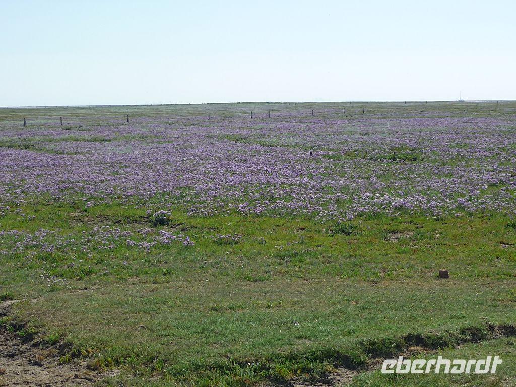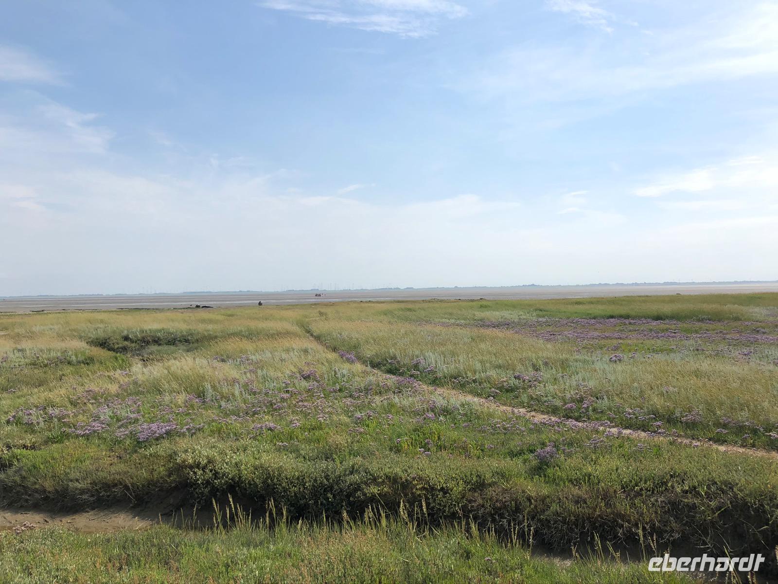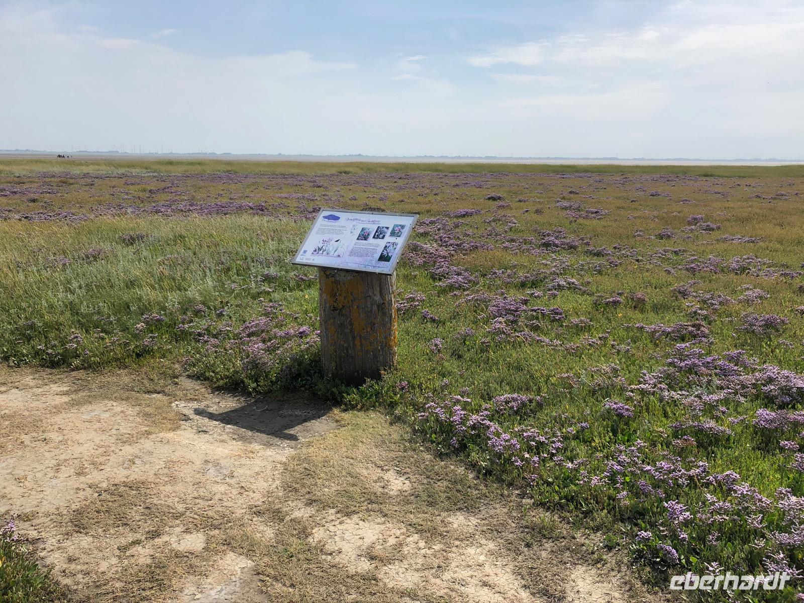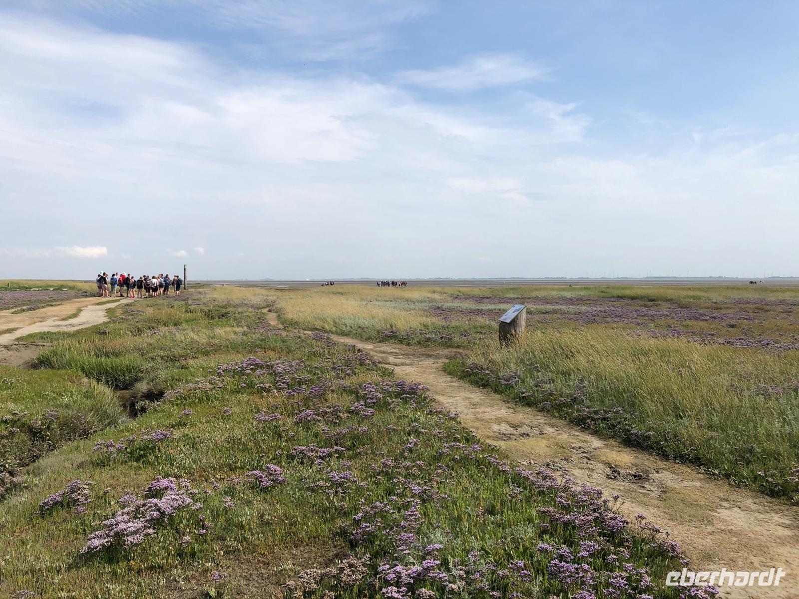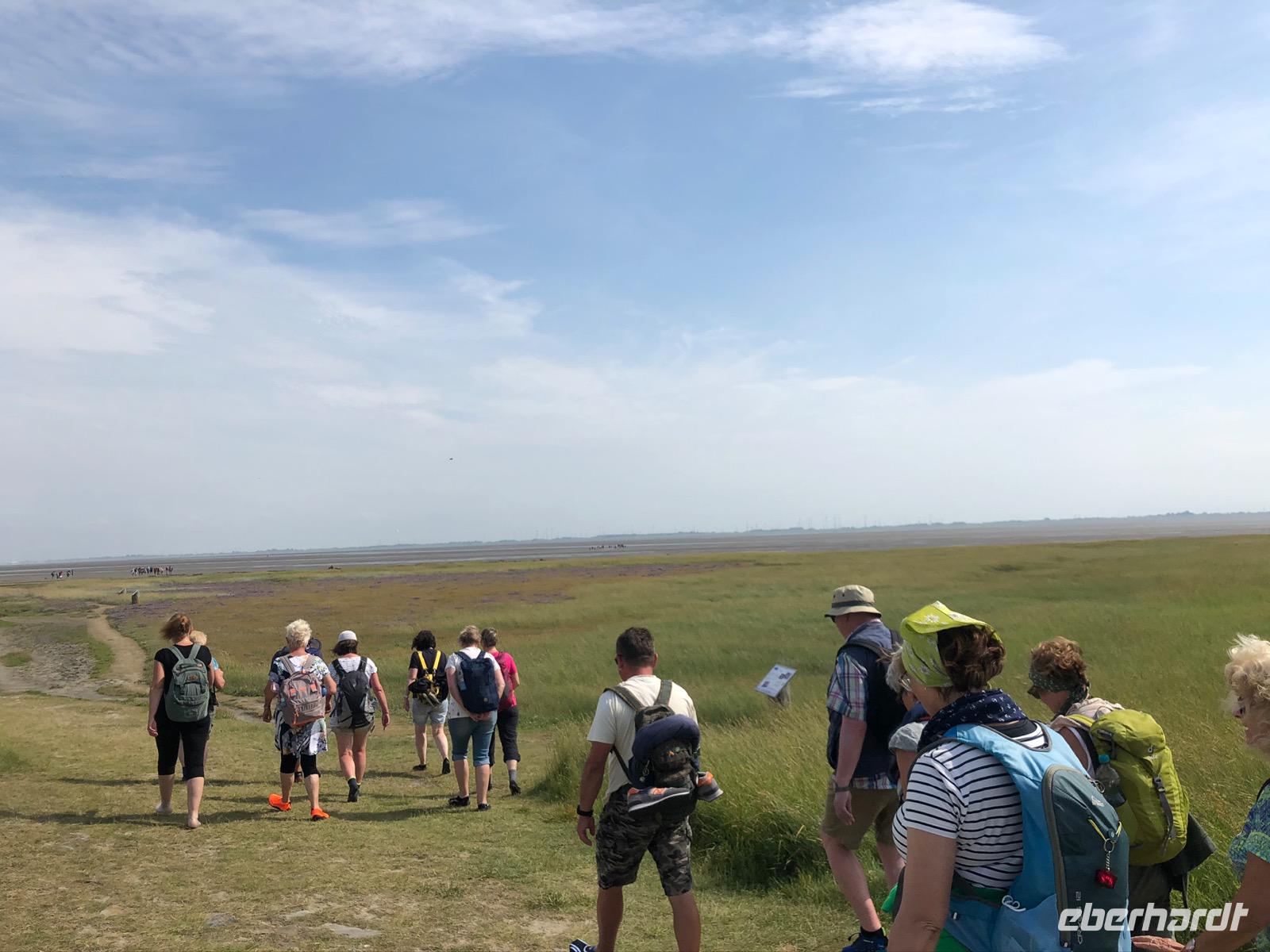 Auf Juist angekommen stand eine Salzwiesenwanderung auf dem Programm. Ein Biologe des Nationalparkhauses erwartete uns und führte die Gruppe auch sofort Richtung Deich. Nun war dies sicher der schwierigste Moment für die Gruppe den wolkenlosen, blauen Sommerhimmel auf einer Insel mitten in der Nordsee nicht zu verfluchen, denn die eineinhalb Stunden Vortrag entwickelten sich zu einer außerordentlichen Herausforderung bei gefühlt 49 Grad und nirgends Schatten. Leider verbrannten sich einige Gäste dabei auch schmerzhaft.