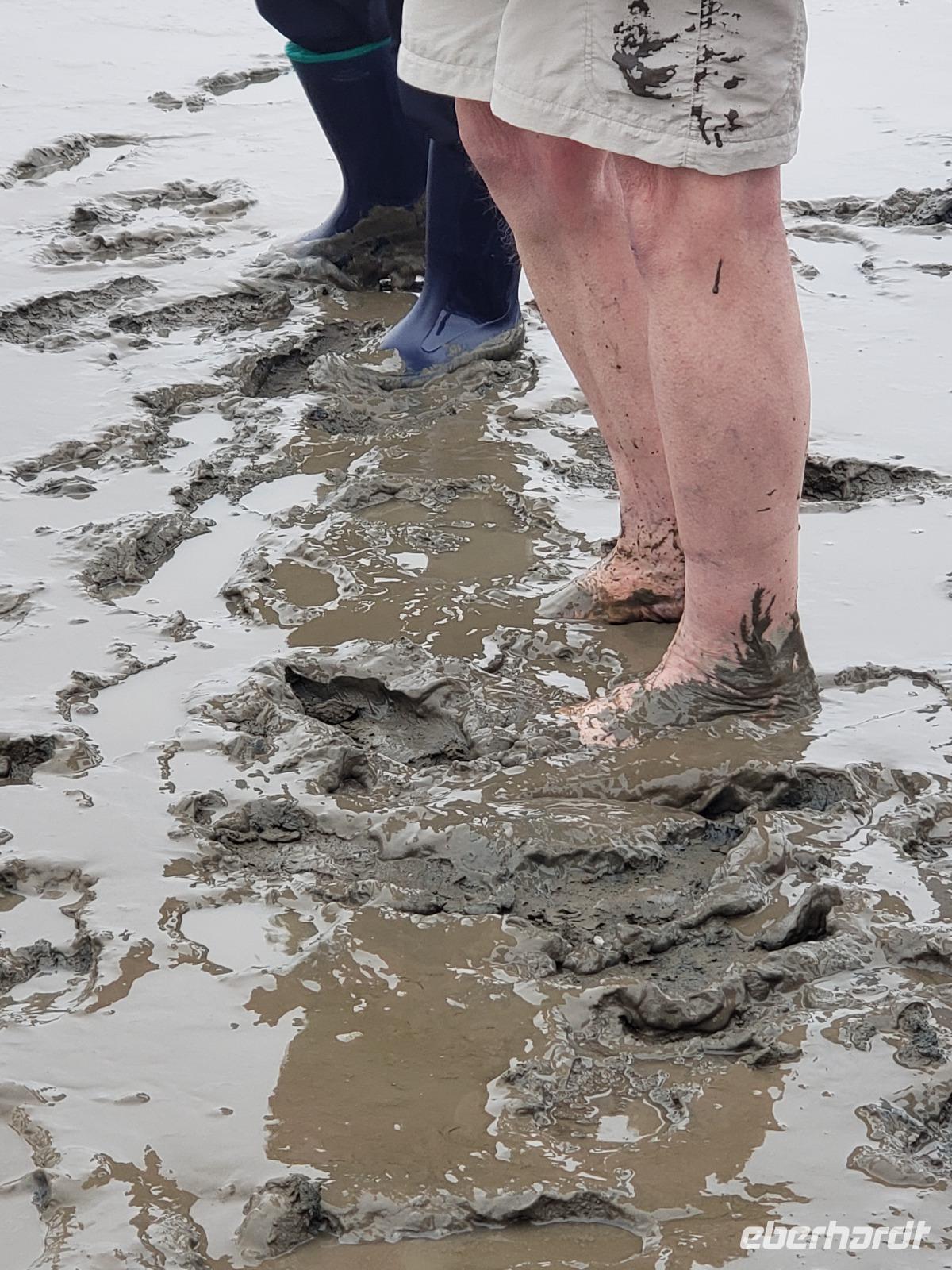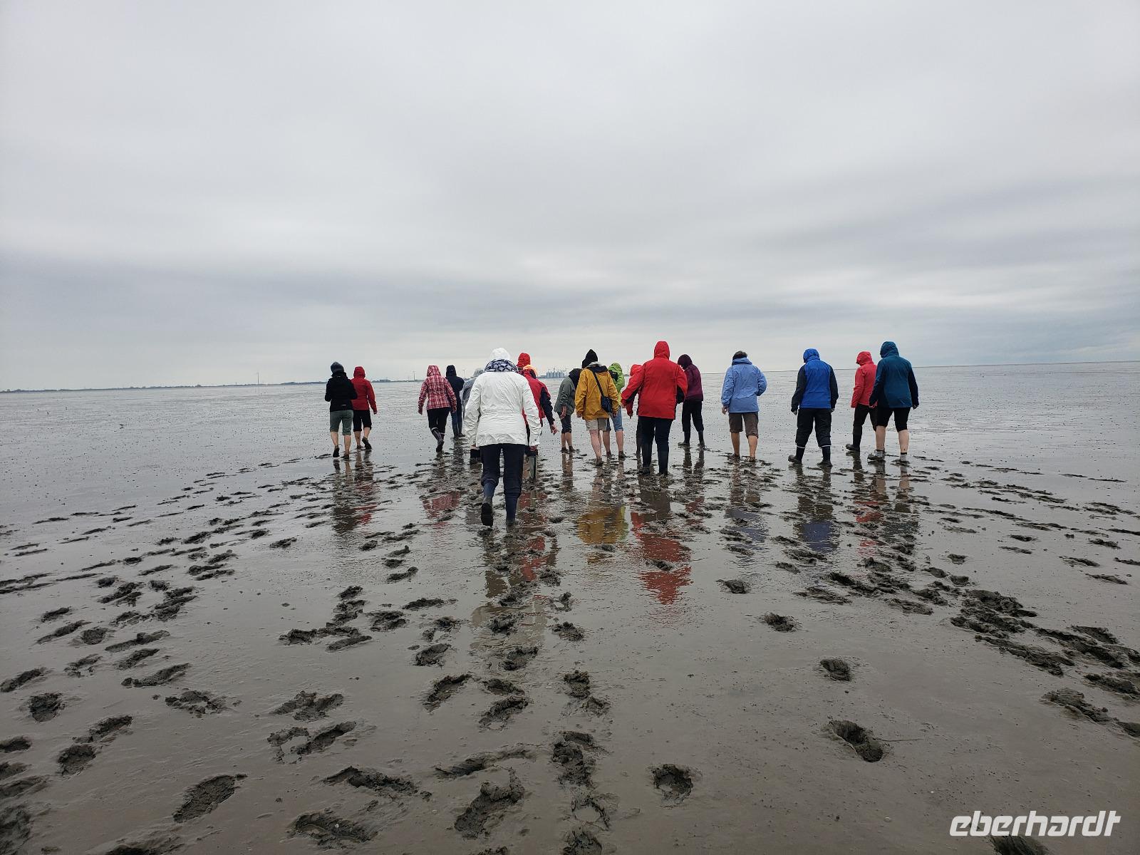 Helle Aufregung bereits morgens im Bus! Heute erwartet uns ein ganz besonderes Erlebnis, eine Wattwanderung! Beim ersten Schritt ins feuchte Nass wissen wir, dass ein Schlick-Watt einem förmlich die Schuhe auszieht, ganz anders als was mancher von uns bisher im Watt erlebt hatte. Anfangs kommen wir kaum vorwärts. Uns wird genau erklärt, wie man den Fuß nach außen drehen muss, wenn er einmal feststeckt. Wir haben die ganze Zeit die Ermahnung unserer lustigen Wattführerin im Kopf „Wenn jemand fällt, dann bitte allein" ...aber keiner fällt zum Glück! Nass werden wir nur von oben. Durchgefroren gibt es eine Überraschung für uns im Bus, unser Busfahrer Maik hat Kaffee gekocht, mit Rum und Schlagsahne wird es für die meisten ein wärmender Pharisäer.