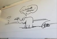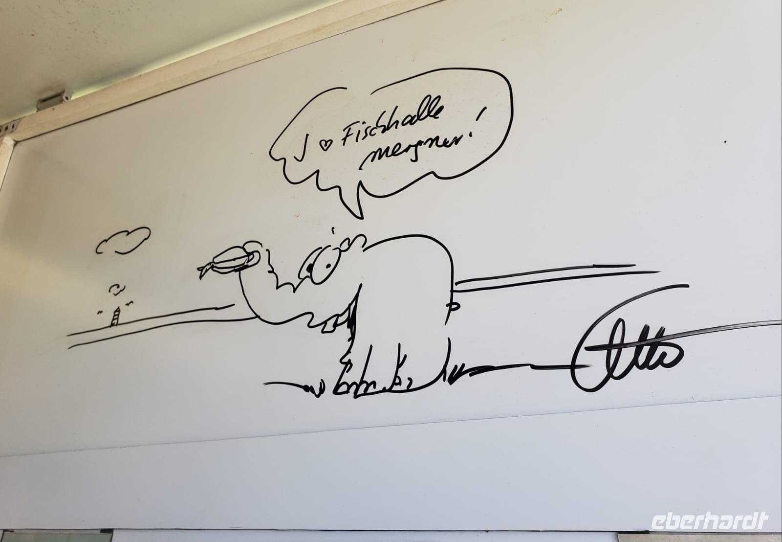 Unser erstes Fischbrötchen essen wir hier auch und entdecken an der Imbissbude einen Original-Ottifanten mit Widmung an der Tür.