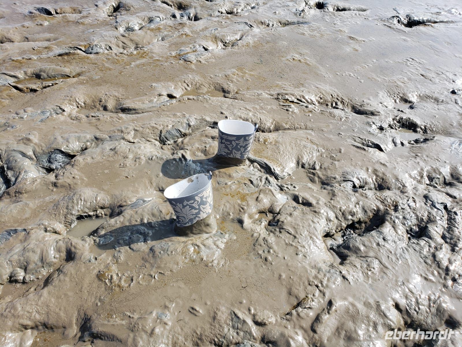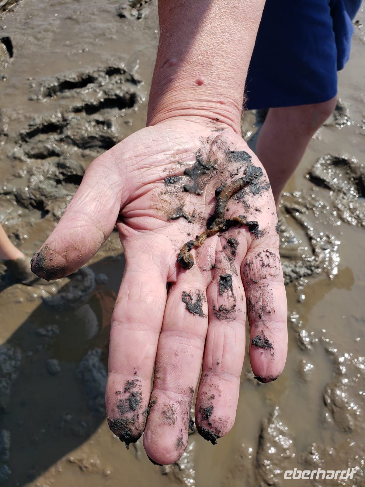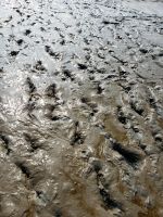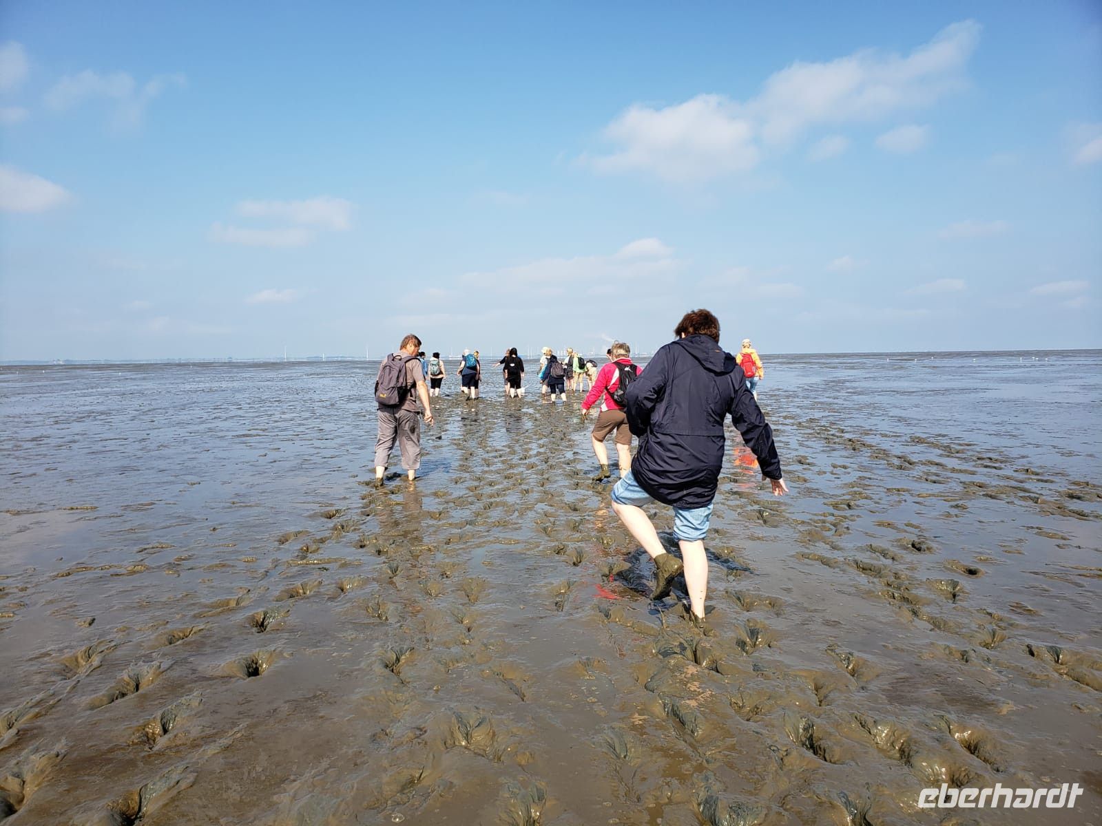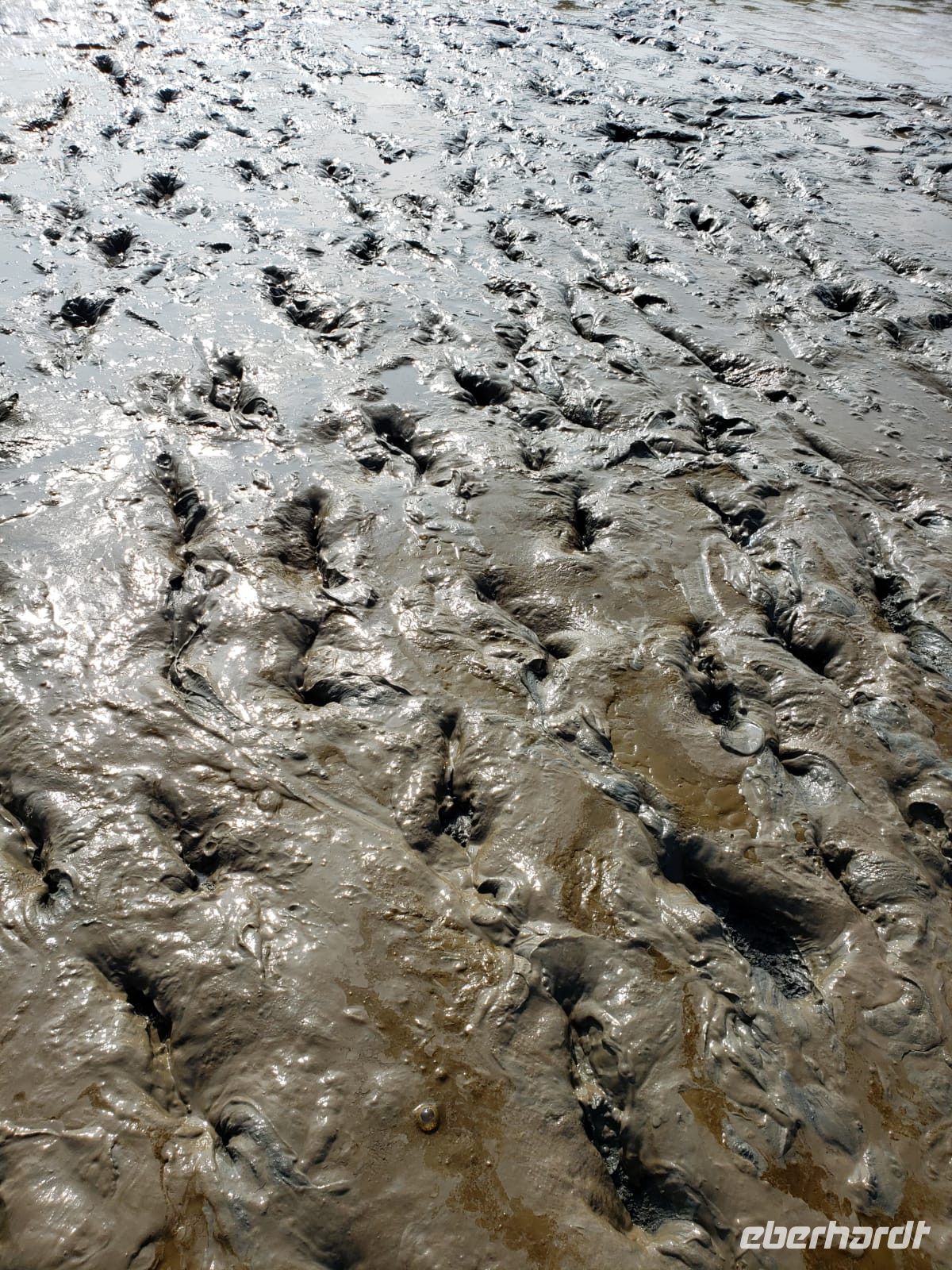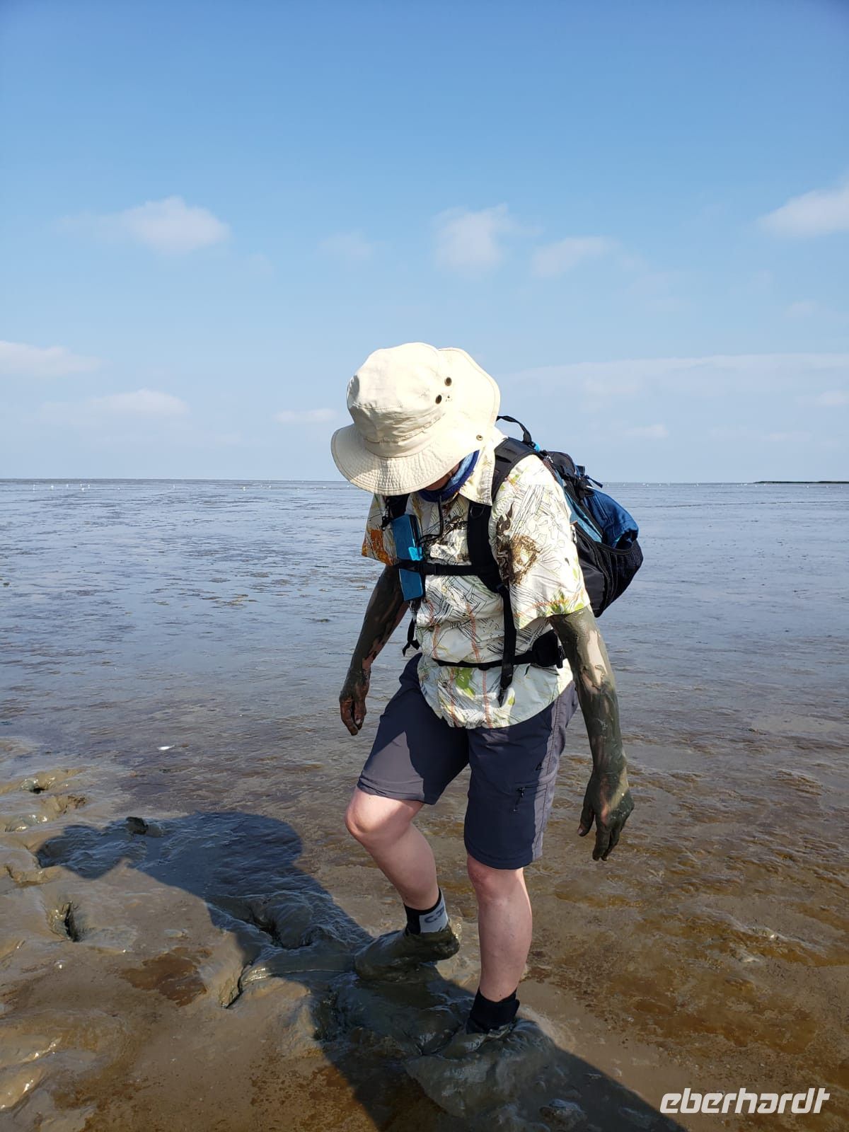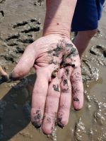 Heute mussten wir relativ früh vom Hotel starten, denn wir machen eine Wattwanderung und diese startet nunmal bei Ebbe. Wir sind alle aufgeregt, manche haben Beachies (Strandsocken) dabei, manche ihre Gummistiefel. Nach wenigen Minuten staunen wir nicht schlecht, als sich doch tatsächlich eine Dame mit dem Schlick einschmiert, Arme und Beine, das soll sehr gesund für die Haut sein! Es ist ein Schlick-Watt, es zieht einem förmlich die Schuhe aus, manchmal steckt man fest, man muss die Hacke langsam nach außen drehen, anders ist kein Entkommen, eine Dame unserer Gruppe verliert das Gleichgewicht und landet vornüber in der Matsche, aber sie nimmt es mit Humor!