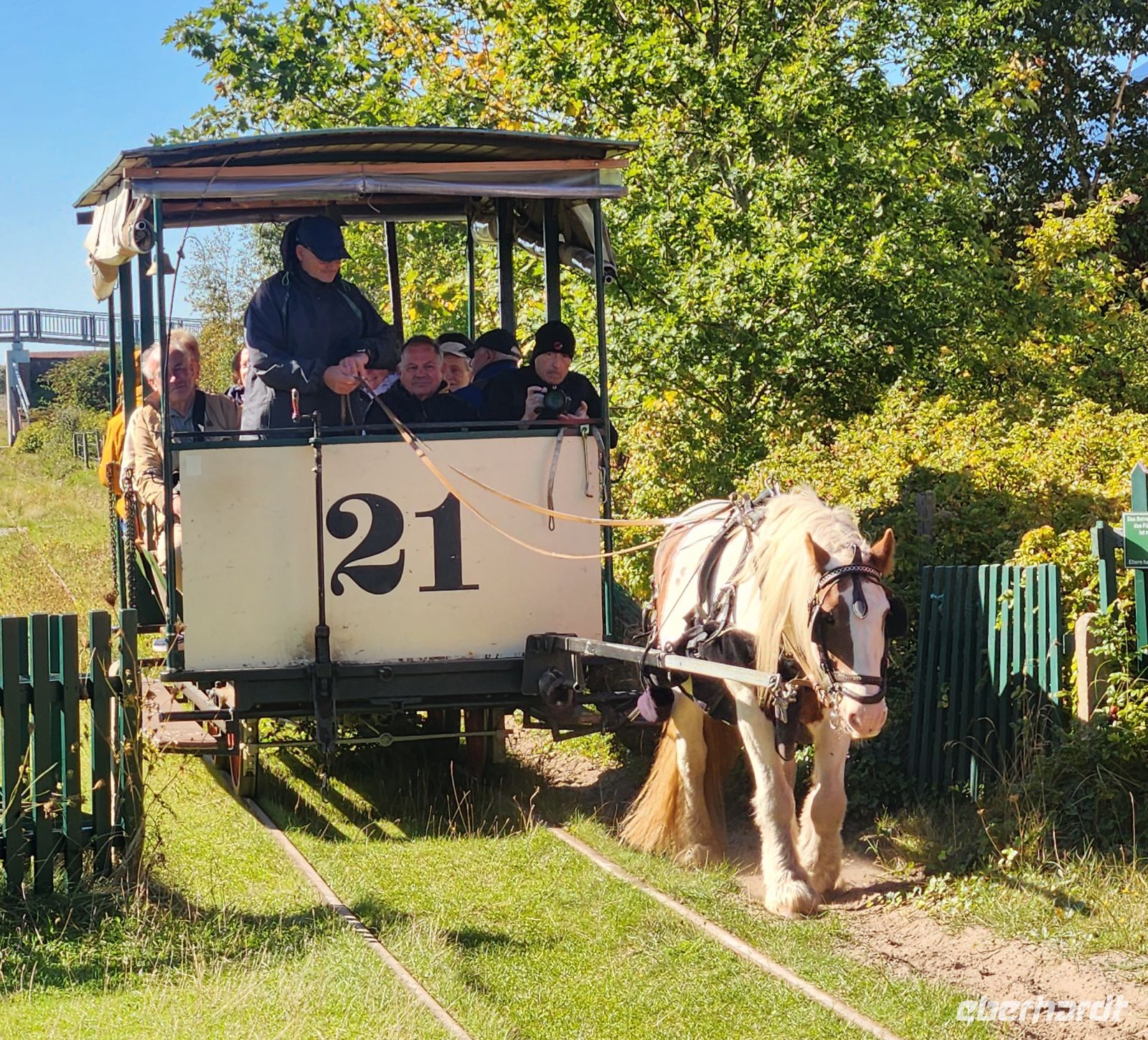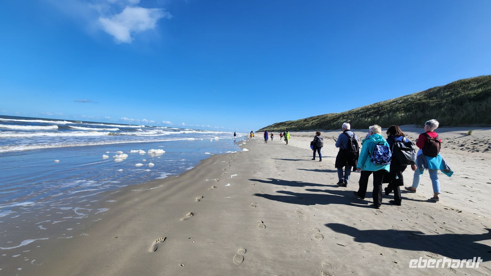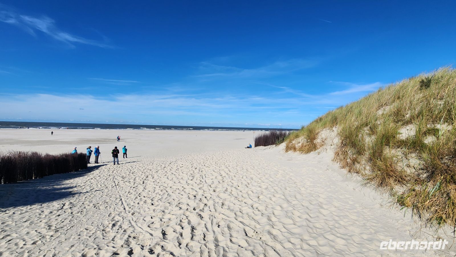 Spiekeroog hat eine Museumspferdebahn aus dem 19. Jahrhundert, man wird von einem Pferd 1 km auf Schienen zum Strand gezogen, so wie damals die reichen Urlauber, denen der Fußweg zum Bilderbuch-Strand zu weit war. Wir entscheiden uns fast alle für diese Fahrt. Zuvor machen wir noch gemeinsam einen Spaziergang durch die Dünen und am Strand entlang, es ist einfach wunderschön.