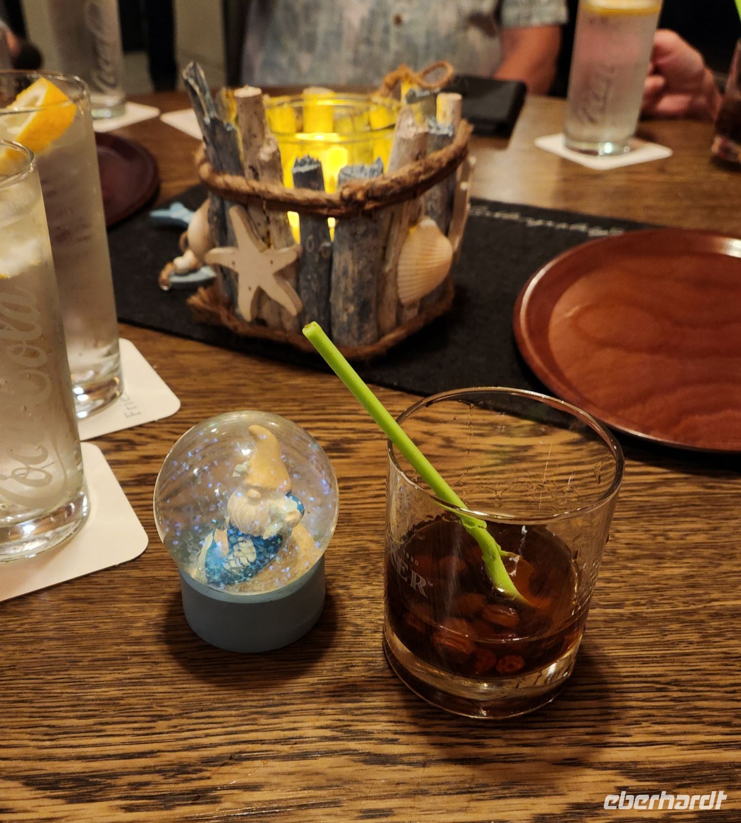 Auf dem Tresen steht ein großes Glas " Sinbohntjesopp"! Ehrensache, dass wir uns alle ein Glas bestellen. Früher hat man dieses Getränk zu Kindstaufen getrunken, dies sind in Weinbrand getränkte Sultaninen.