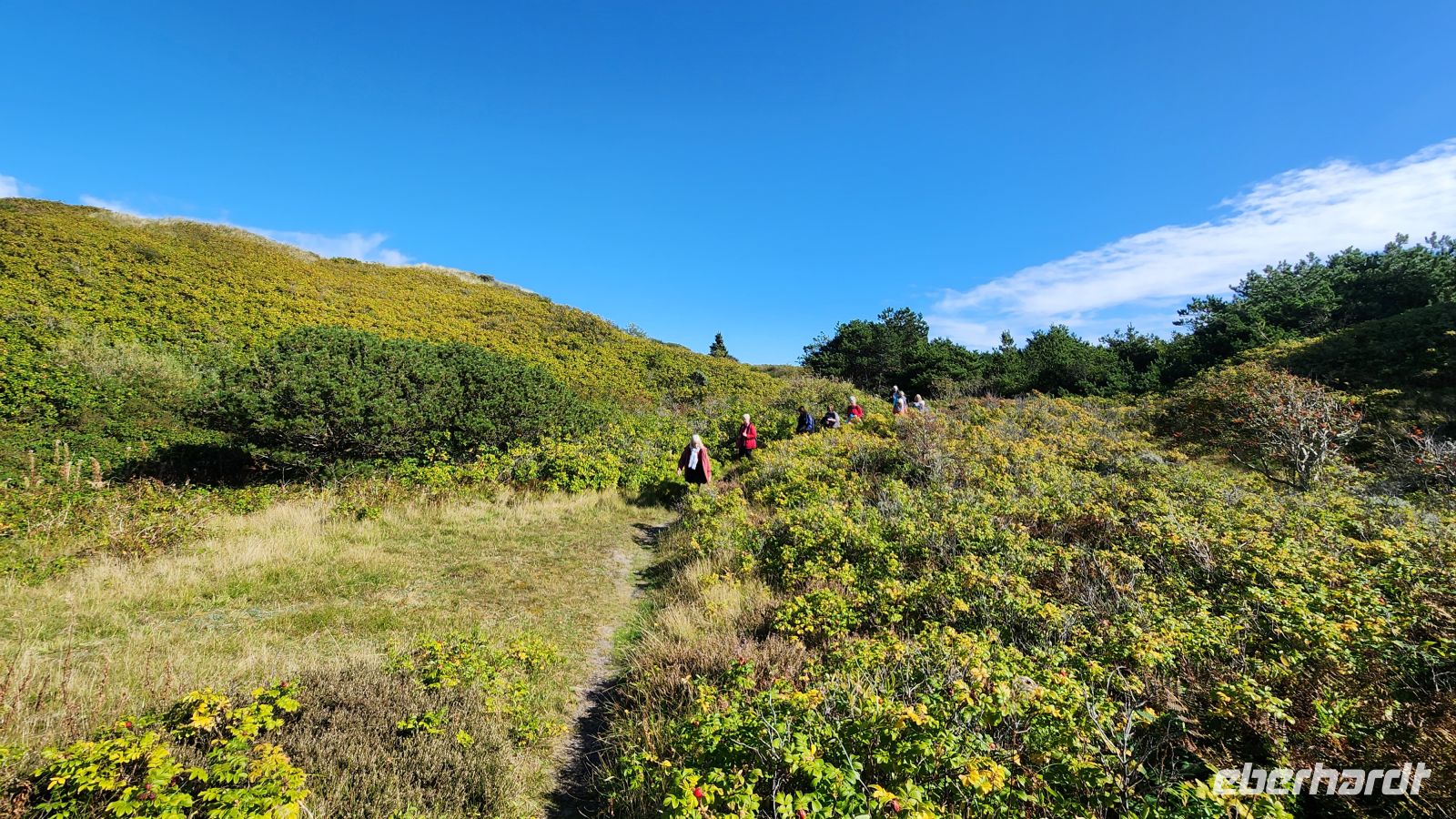 Der Großteil der Gruppe entscheidet sich für eine Wanderung. Zunächst führt der Weg durch den Ort, dann erreichen wir eine grüne Dünenlandschaft, durch die wir eine ganze Weile auf ganz schmalen Wegen durchstreifen, die wunderschöne Natur tut unserer Seele gut!
