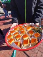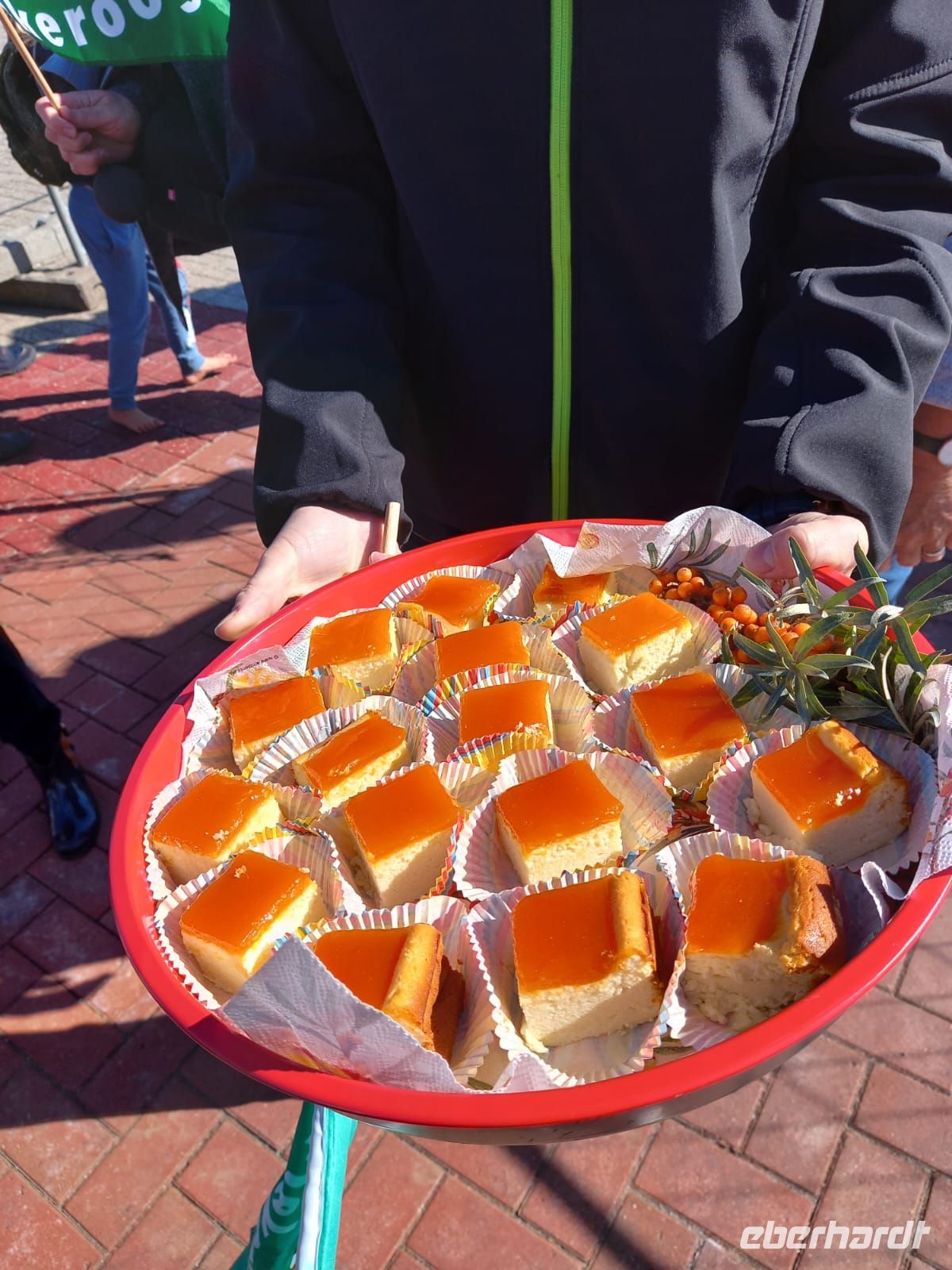 Am Hafen von Spiekeroog angekommen, wartet eine Überraschung auf uns! Im Winter waren auch Spiekerooger auf einer Eberhardt-travel Finnlandreise und da auf dieser Ostfrieslandreise 3 Damen auch mit auf der Finnland-Reise waren, werden wir alle mit Sanddornkuchen und wehenden Fähnchen begrüßt, toll !!!