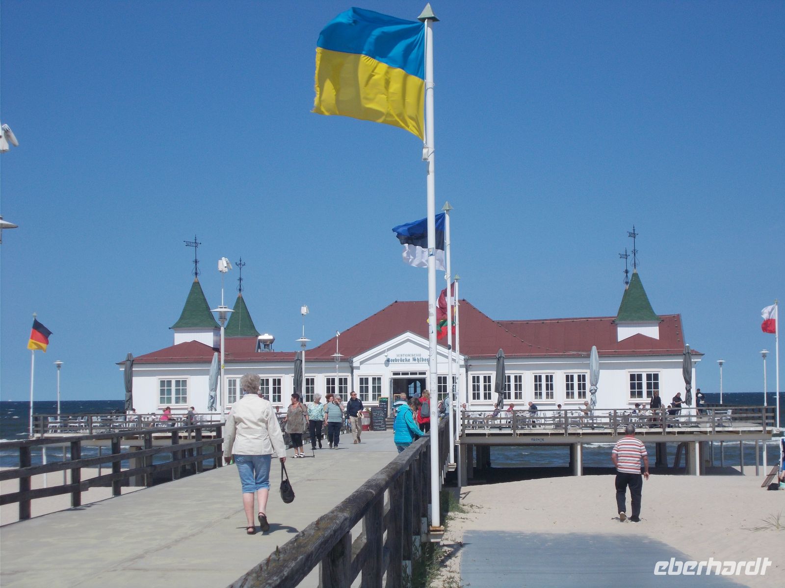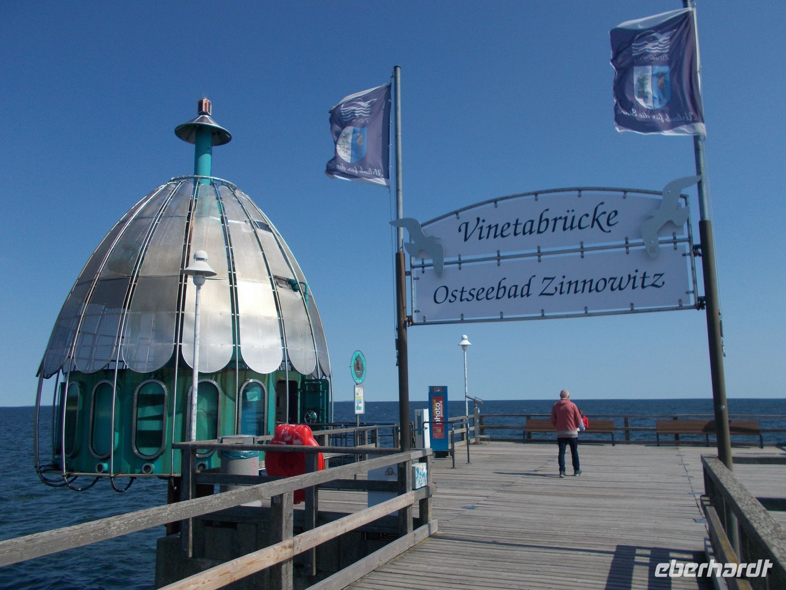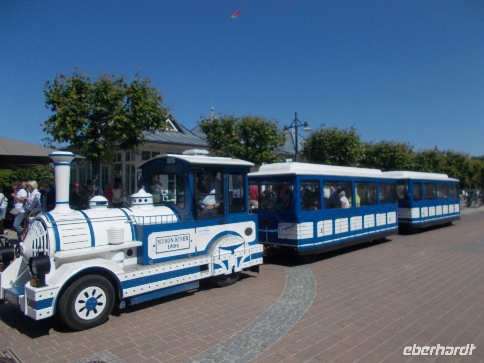 Das Motto hieß " Inselhüpfen " und schon ging es los.Es gibt zwei Möglichkeiten auf die Insel Usedom zu gelangen. Wir nutzten zur Hinfahrt die Route über Wolgast ( auch Tor zur Insel ) genannt. Auch hier trennt ein Fluss die Insel vom Festland ,der Peenestrom. Diesen überquerten wir über die spektakuläre blaue Klappbrücke ,die auch von der Eisenbahn und Fußgängern genutzt werden kann. Unser erstes Ziel war Zinnowitz ,die Tauchglocke . Wir spazierten zur Seebrücke und erfuhren dort - kein Tauchgang möglich ! - Wir durften uns trotzdem des Innere der Glocke anschauen und wurden über die Eigenheiten der Tauchstation vertraut gemacht. Nunja , jetzt hatten wir unverhofft mehr Freizeit und nutzten sie auch.Ein Zinnowitzer Tee sollte uns an den verpatzten Tauchgang erinnern.In Bansin bestiegen wir den "Kaiserbäder - Express", welcher uns bis nach Ahlbeck brachte. Leider das erste Stück ohne Info , wurde aber sofort repariert. - Heute Freitag der 13. !!! An der ältesten Seebrücke Deutschlands ,mit imposanten Restaurant( der Sketch mit Loriot,der hier gedreht wurde, ist vielen noch bekannt), war Halt. Hier lud nicht nur der Ort zum Bummeln ein ,auch der Strand oder die Promenade lockten.