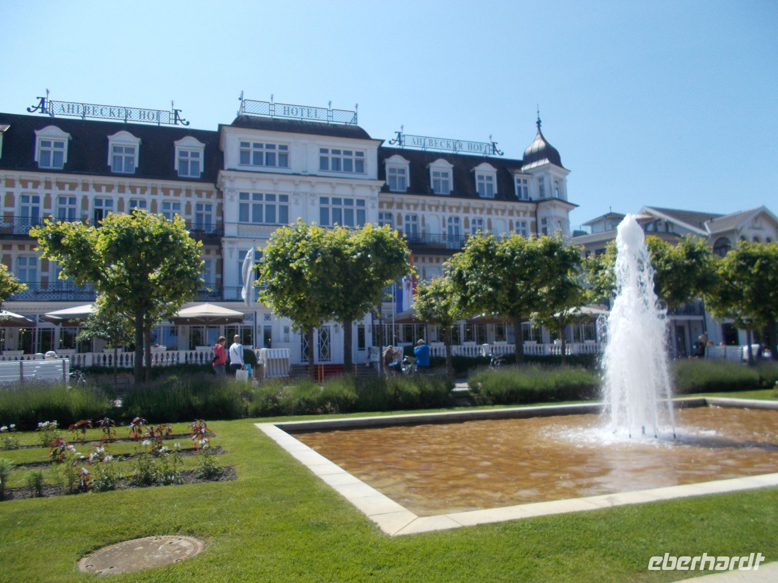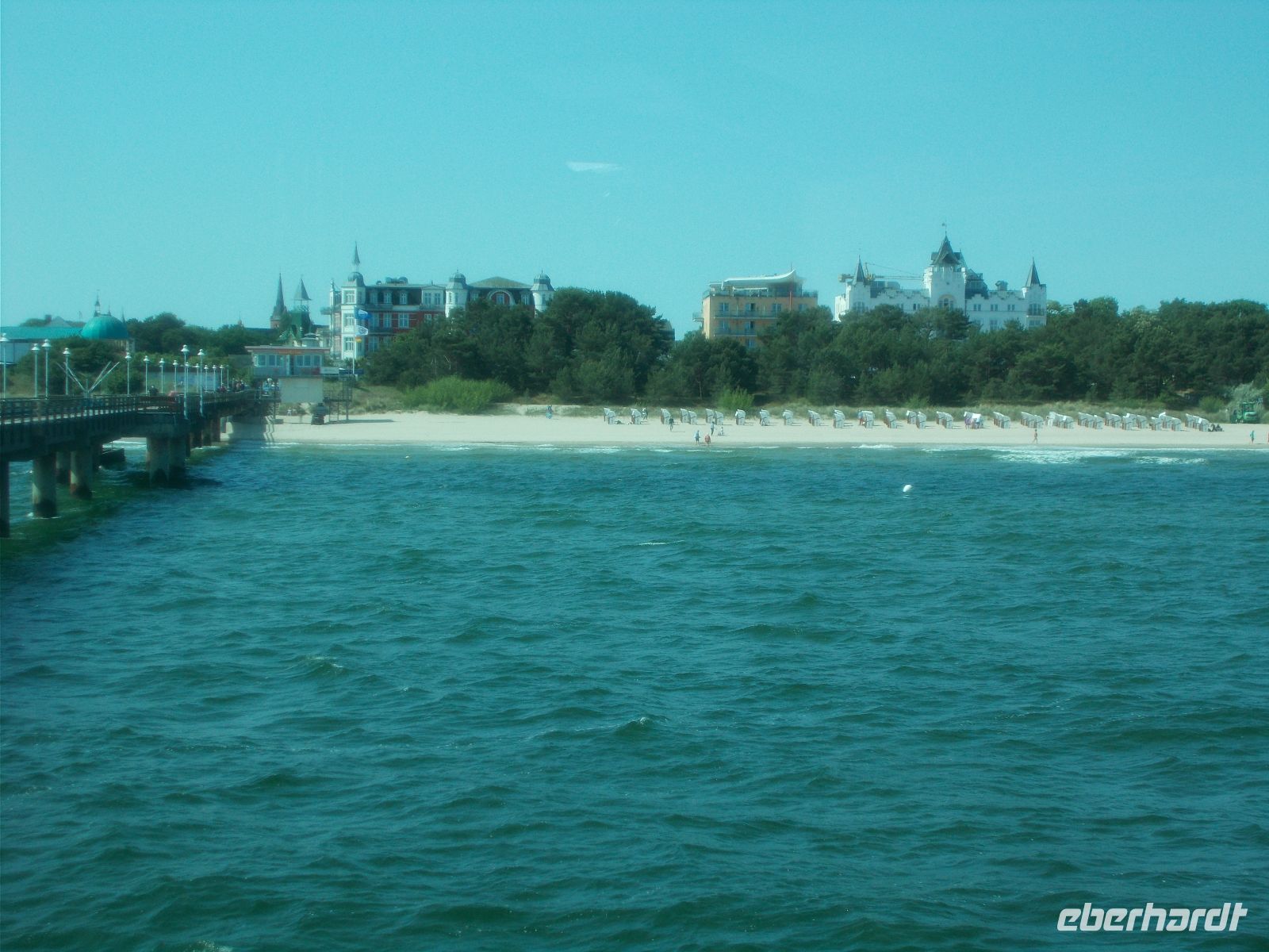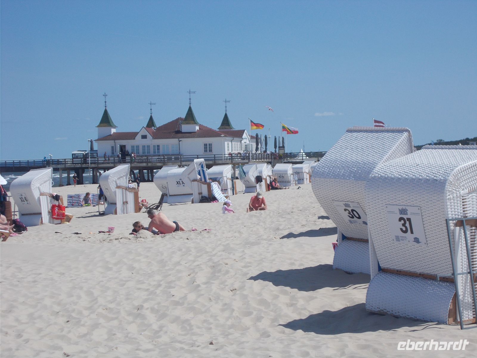 Das Motto hieß " Inselhüpfen " und schon ging es los.Es gibt zwei Möglichkeiten auf die Insel Usedom zu gelangen. Wir nutzten zur Hinfahrt die Route über Wolgast ( auch Tor zur Insel ) genannt. Auch hier trennt ein Fluss die Insel vom Festland ,der Peenestrom. Diesen überquerten wir über die spektakuläre blaue Klappbrücke ,die auch von der Eisenbahn und Fußgängern genutzt werden kann. Unser erstes Ziel war Zinnowitz ,die Tauchglocke . Wir spazierten zur Seebrücke und erfuhren dort - kein Tauchgang möglich ! - Wir durften uns trotzdem des Innere der Glocke anschauen und wurden über die Eigenheiten der Tauchstation vertraut gemacht. Nunja , jetzt hatten wir unverhofft mehr Freizeit und nutzten sie auch.Ein Zinnowitzer Tee sollte uns an den verpatzten Tauchgang erinnern.In Bansin bestiegen wir den "Kaiserbäder - Express", welcher uns bis nach Ahlbeck brachte. Leider das erste Stück ohne Info , wurde aber sofort repariert. - Heute Freitag der 13. !!! An der ältesten Seebrücke Deutschlands ,mit imposanten Restaurant( der Sketch mit Loriot,der hier gedreht wurde, ist vielen noch bekannt), war Halt. Hier lud nicht nur der Ort zum Bummeln ein ,auch der Strand oder die Promenade lockten.