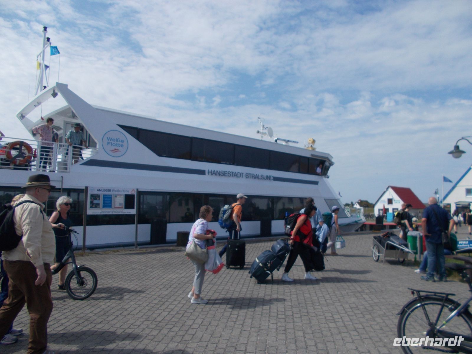 Der heutige Tag begann mit einer "Seereise",von Stralsund aus nach Hiddensse - Neuendorf. Hier wartete ein Planwagengespann auf uns ,um mit uns die Insel zu erkunden. Der Kutscher wußte ,auf seine verschmitzte Art,viel über Land und Leute zu berichten und wir lauschten gebannt.In Kloster kletterten wir vom Pferdewagen und besuchten die Inselkirche .Eine kleine, helle Kirche ,ganz eigen gestaltet mit der Deckenmalerei, einfach zum wohlfühlen.Auf der Insel ist alles von Ruhe geprägt und so ging jeder seinen Neigungen nach. Einige wanderten zum Leutturm Dornbusch.Andere gingen einfach nur bummeln .Aber eins durfte nicht fehlen - bei schönstem Sonnenschein war ein Strandbesuch unumgänglich. Nach einer längeren Schiffsfahrt legten wir wieder im Hafen von Stralsund an und genehmigten uns ein leckeres Eis.