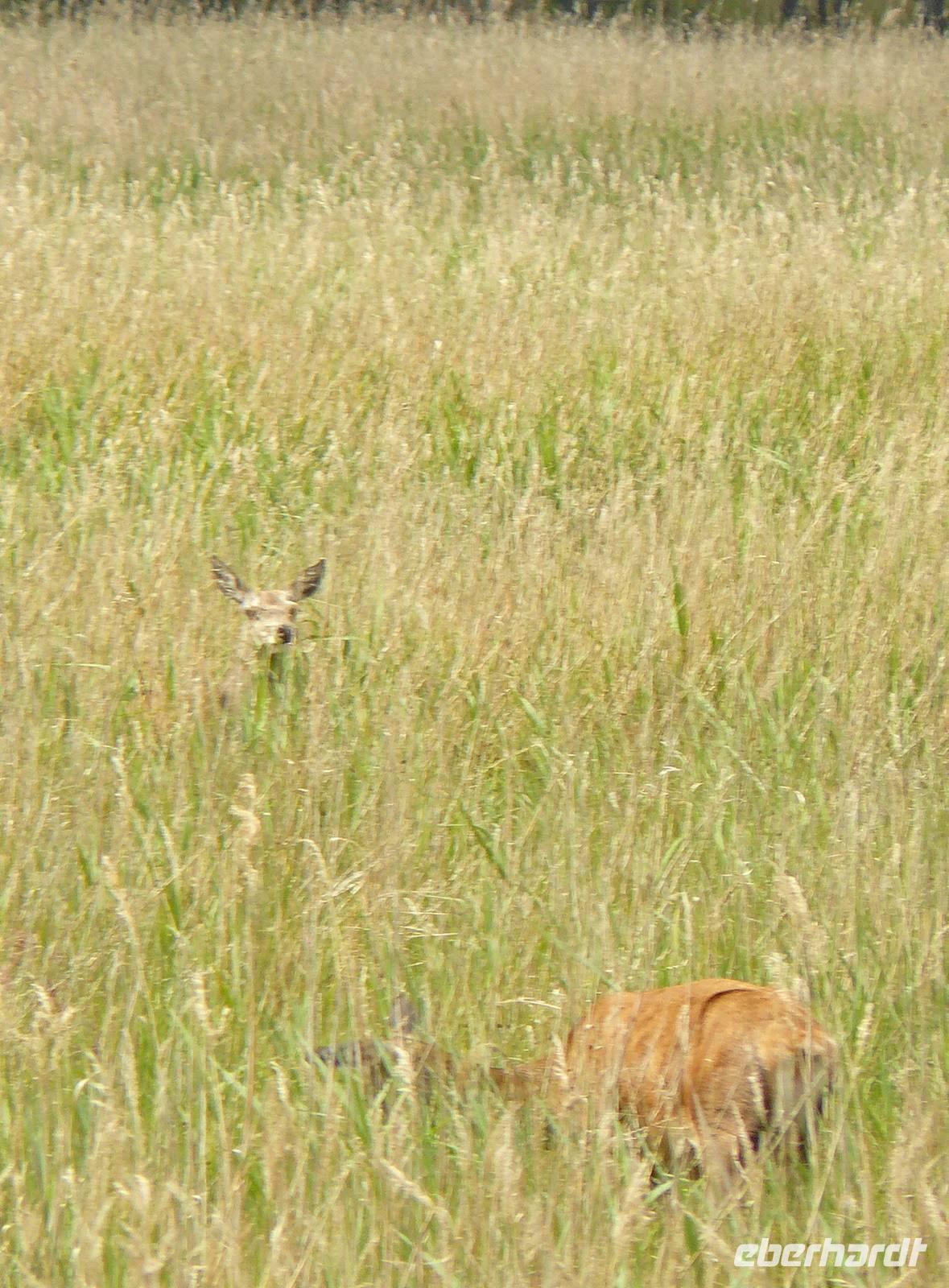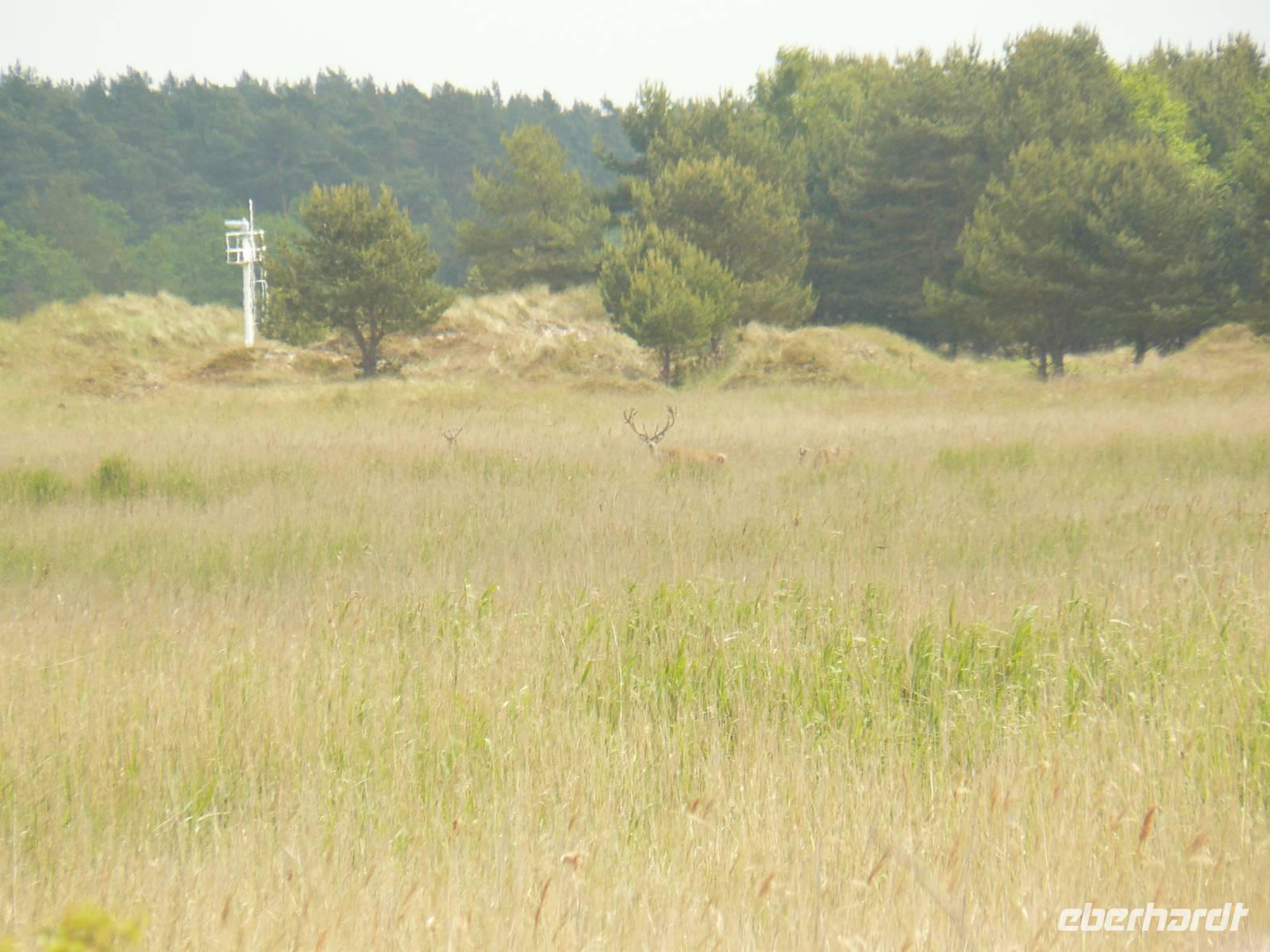 Nach einer 40minütigen Fahrt durch den Darss wanderten wir von Prerow durch den Darßwald zum Leuchtturm am Darßer Ort. Bei einem Besuch im sehr gut gestalteten Museum zur Geologie und zu den lebendigen und ausgestorbenen Wesen der Region stellte sich eine ernsthafte Frage: In einen Harung jung und schlank - 2,3,4,s-da-da-tiralala, der auf dem Meeresboden schwamm - 2, 3,4,s-da-da-tiralala, verliebte sich oh Wunder, ne olle Flunder... So weit so gut. Wir bestaunten die ausgestellte Flunder wussten aber nicht wie das Lied weiter ging. Wie kam die Flunder zu ihrem Goldstück, so dass sie schließlich doch noch den Harung bekam...?? Derlei schwerwiegende Probleme konnten wir zunächst nicht lösen und bald schon wurden wir auf andere Gedanken gebracht, denn auf unserer Tour durch den Nationalpark sahen wir Hirschkühe mit ihren Kälben äsen, die sich nicht um uns kümmerten und wenige Meter vom Pfad entfernt aus dem Schilf auftauchten. Auch ein alter Hirsch mit mächtigem Geweih blickte auf und ein kleiner Spießer erhob sein Köpfchen und schaute uns neugierig an, während wir versuchten die Hirsche mit der Kamera festzuhalten. Ein Gast zog es vor mit dem Kremserfahrzeug nach Prerow zurückzufahren, während die flotten Wanderer am Nordstrand nach Muscheln suchend bis Prerow am Strand entlang weiterzogen. An der Seebrückte folgte eine Eis- bzw. Fischbrötchenpause bevor uns der Bus zum Hotel zurückbrachte. Es war der einzige Abend auf der Reise, der so richtig warm war und das nutzten wir. Vollzählig erschien die Gruppe am Strand, gut ausgestattet mit Piccolofläschchen. Der Sekt hat seine Wirkung nicht verfehlt. Wir konnten das schwerwiegende Problem der Flunder mit dem Goldstück lösen - da stieß die Flunder auf den Grund, wo sie ein großes Goldstück fund - zumindest glaubten wir, dass wir die Lösung gefunden hätten (damit Ihr's wisst, ich habe später dann "gegoggelt": Da stieß die Flunder in den Sand, wo sie ein großes Goldstück fand. Ein Goldstück von 10 Rubel, oh, welch ein Jubel... heißt es eigentlich...). Der Jubel war aber trotzdem unser. Und es stellte sich heraus, dass wir herrlich zusammen singen konnten. Und dichten. Schöner kann der Sonnenuntergang auf Capri auch nicht sein, sagten wir uns. Also sangen wir „Wenn bei Dierhagi die rote Sonne im Meer versinkt..." Aber nicht nur das. Wir besangen die Abendstille - die Dank uns natürlich nicht mehr war - und erprobten uns im Kanonsingen und landeten schließlich sogar bei „Donna nobis pacem". Die Sonne war schon lange weg als wir uns singend aufs Hotel zubewegten. Es war ein herrlicher Abend geworden und keiner scheute sich mitzusingen. Und sogleich wurden Pläne geschmiedet für Winter-Wander-Wochenenden. Vielleicht lassen sich diese Pläne ja auch realisieren - mich würde das jedenfalls sehr freuen!