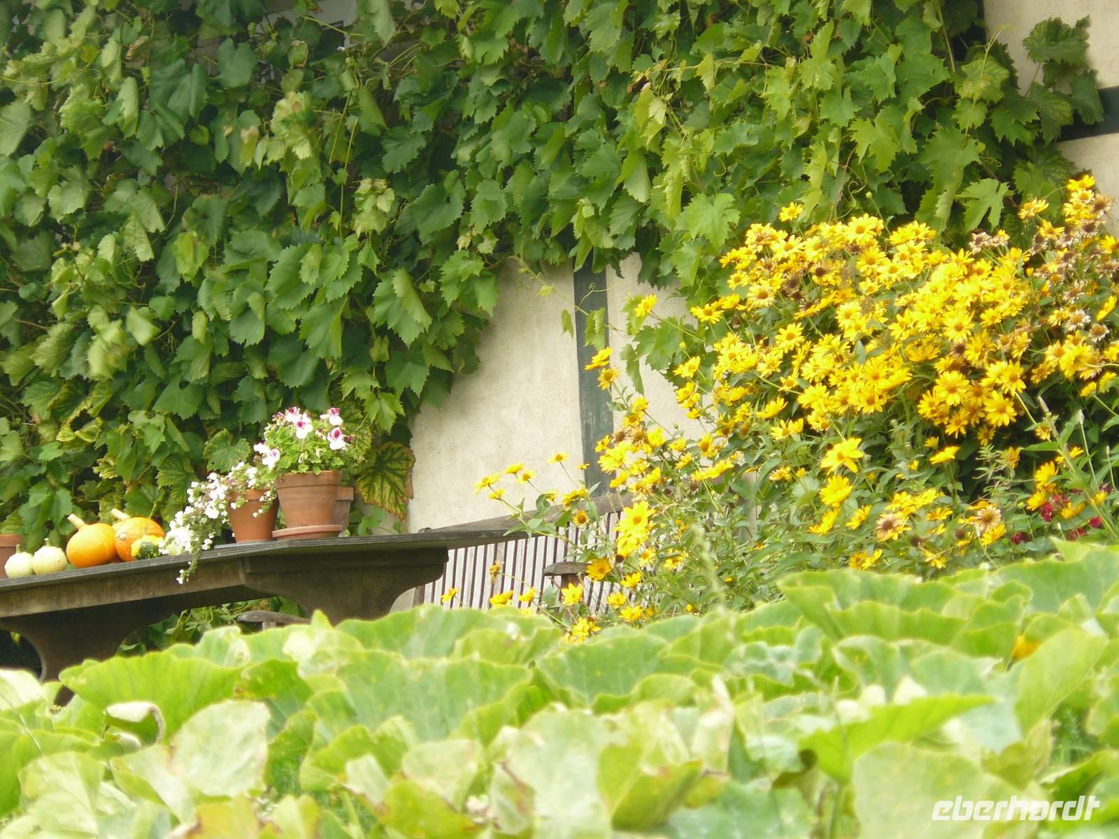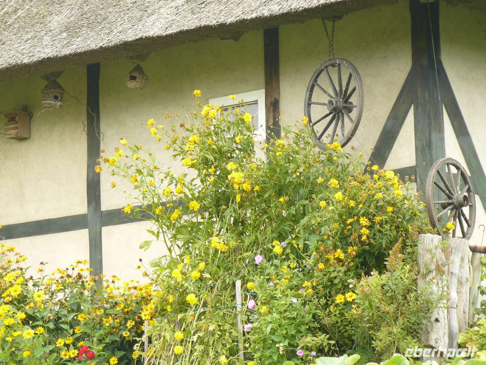 Das Wetter war durchwachsen. Aber es war trocken. Und so fuhren wir morgens nach Wustrow, um zunächst einen Abstecher auf die Seebrücke zu machen. Danach wanderten wir dann der Steilküste folgend in Richtung Ahrenshoop los. Das Meer gräbt hier das Land ab und wir mieden den vorderen Teil des Weges, denn er war bereits unterspült. Die Reiseleiterin muss hier jedes Jahr einen neuen Weg suchen, denn schon nach wenigen Monaten ist der bekannte Pfad nicht mehr begehbar. Wir bestiegen den höchsten Berg des Fischlandes, den 17,9 m hohen Bakelberg und bewunderten den Rundblick und die moderne Plastik, die hier - zum Glück mit Titel versehen - ausgestellt ist. Nach einem kurzen Rundgang in Ahrenshoop zum Kunstkaten und einem kurzen Besuch der Bunten Stube (ein Souvenirshop mit Flair und Geschichte!) strandeten wir im aussichtsreichen Restaurant Buhne 12 und aßen Fischsuppe, Sandornsahnetorte und andere Leckereien. Nach der Mittagspause wanderten wir weiter zum Dornenhaus, in dem Friedemann Löber interessante Keramikwaren ausstellt und verkauft. Nachdem wir am neuen Kunstmuseum vorüber gewandert waren, gönnten wir uns eine kleine Pause am hübschen Hafen von Althagen, passierten danach malerische alte Bauernhäuser mit schönen Blumengärten, Zierkürbissen und Boddenblick, durchwanderten Niehagen und folgten einem ruhigen Weg zwischen Wiesen, Feldern und Schilf am Bodden entlang nach Barnstorf. Dort rückten Gänse der Reiseleiterin auf die Pelle, die ziemlich froh war, dass es da noch einen engmaschigen Zaun gab zwischen ihr und den langen Hälsen... Aber ein kurzer Blick auf die alten Hufen genügte uns dann schon, denn nun fing es an zu regnen und wir bestiegen wenig später direkt nach unserer Ankunft am Hafen von Wustrow sofort den Bus, noch bevor wir richtig nass geworden waren. Glück gehabt mit dem Wetter, denn die Vorhersage war ziemlich düster gewesen, und bis auf die letzten 5 Minuten war es trocken geblieben!