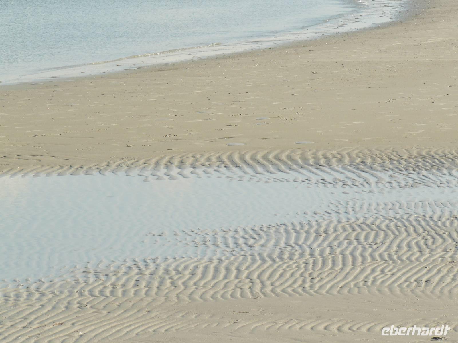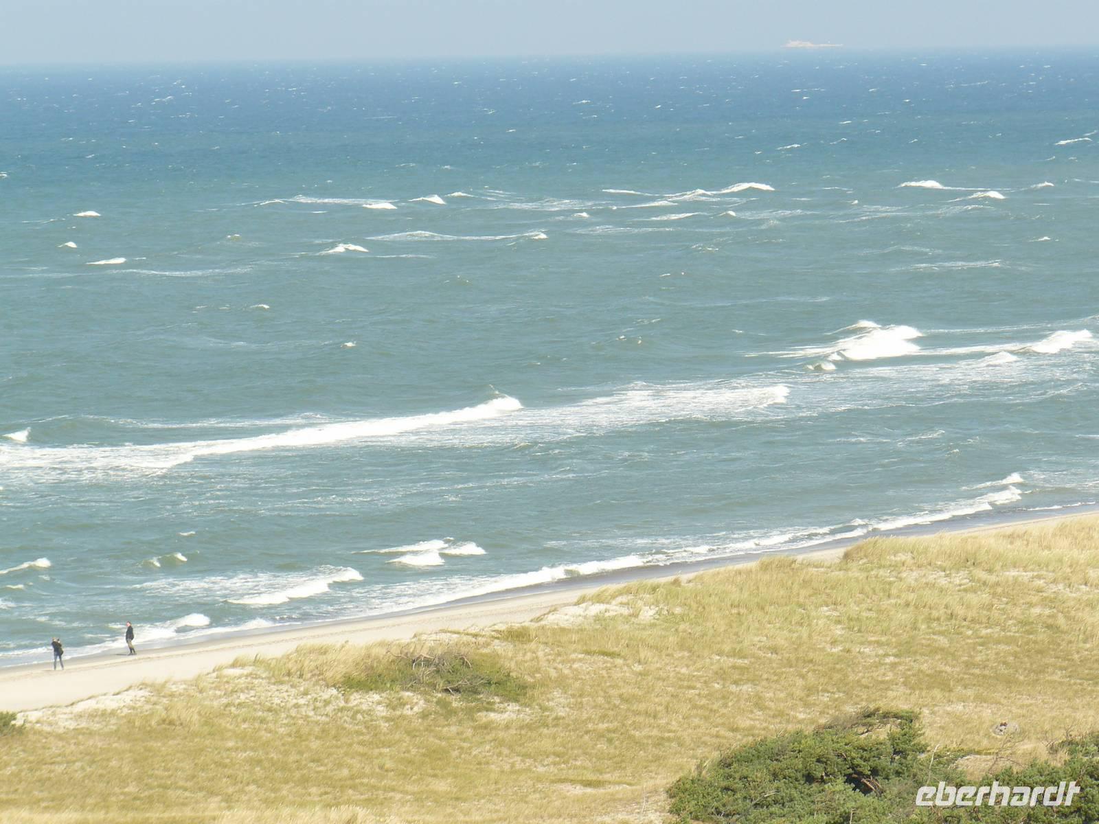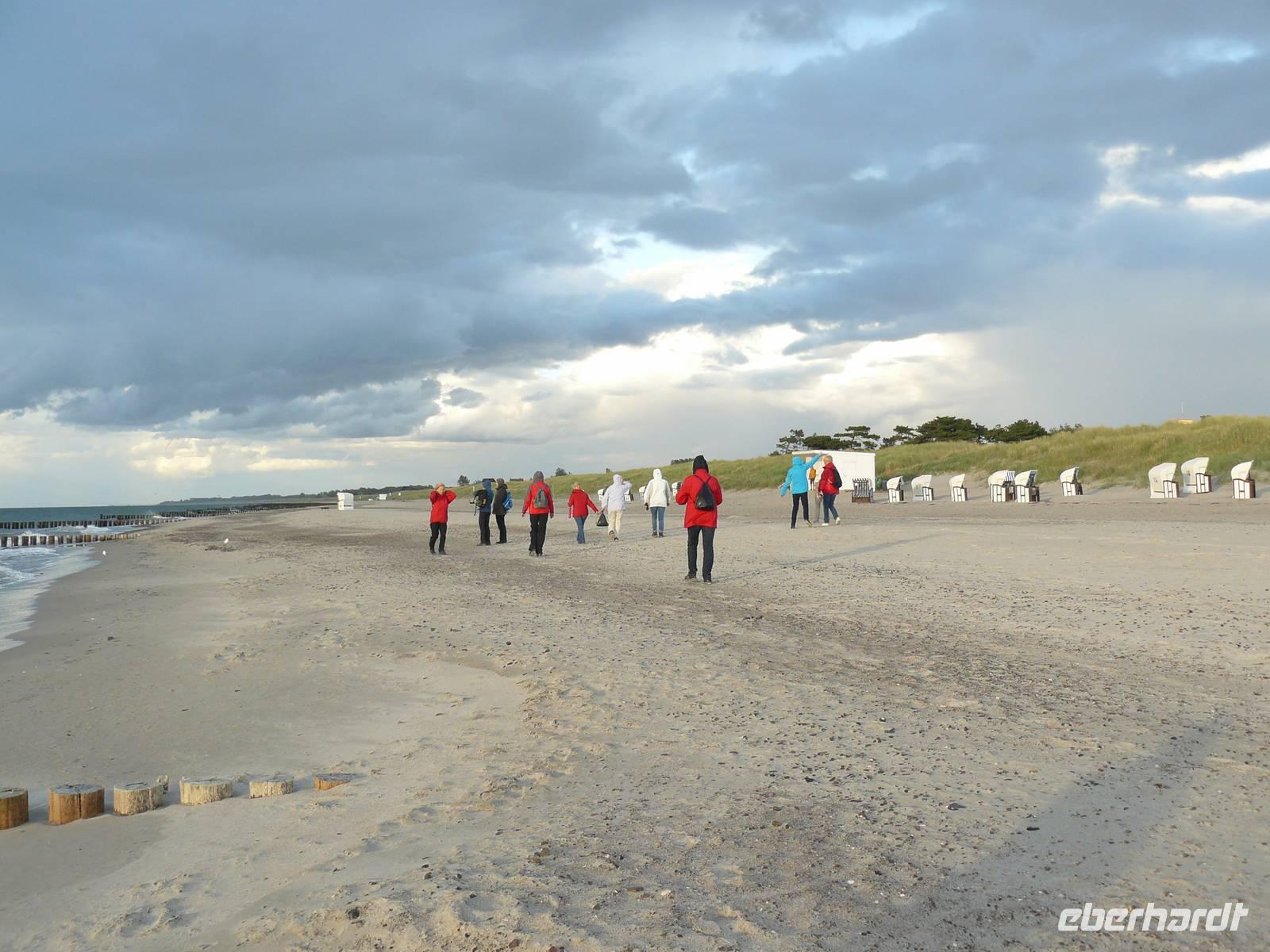 Am Nachmittag hatten einige der Gäste persönliche Pläne: Sie relaxten im Hotel oder am Strand und zogen abends zu einem Orgelkonzert in der Kirche von Dierhagen los. Der Rest der Gruppe wollte es noch mal wissen: gestärkt durch jene üppige Fischmahlzeit am Hafen von Born zogen wir los und durchwanderten den Darßwald und erreichten schließlich den Darßer Weststrand. Nach einer herrlichen Pause am Meer liefen wir am fast menschenleeren Weststrand unter blauem Himmel weiter bis nach Ahrenshoop. Der Weststrand mit seinen bizarren Wurzeln und Hölzern fällt steiler ab und man wünscht sich geradezu, dass man das linke Bein verkürzen könnte. Aber im Wasser geht es sich einfacher. Und das Wasser war noch warm genug, so dass sich einige Gäste entschlossen, durchs Wasser zu gehen. Alle waren sich einig, trotz der Mühen, die diese Tour mit sich brachte: was für eine herrliche Wanderung!