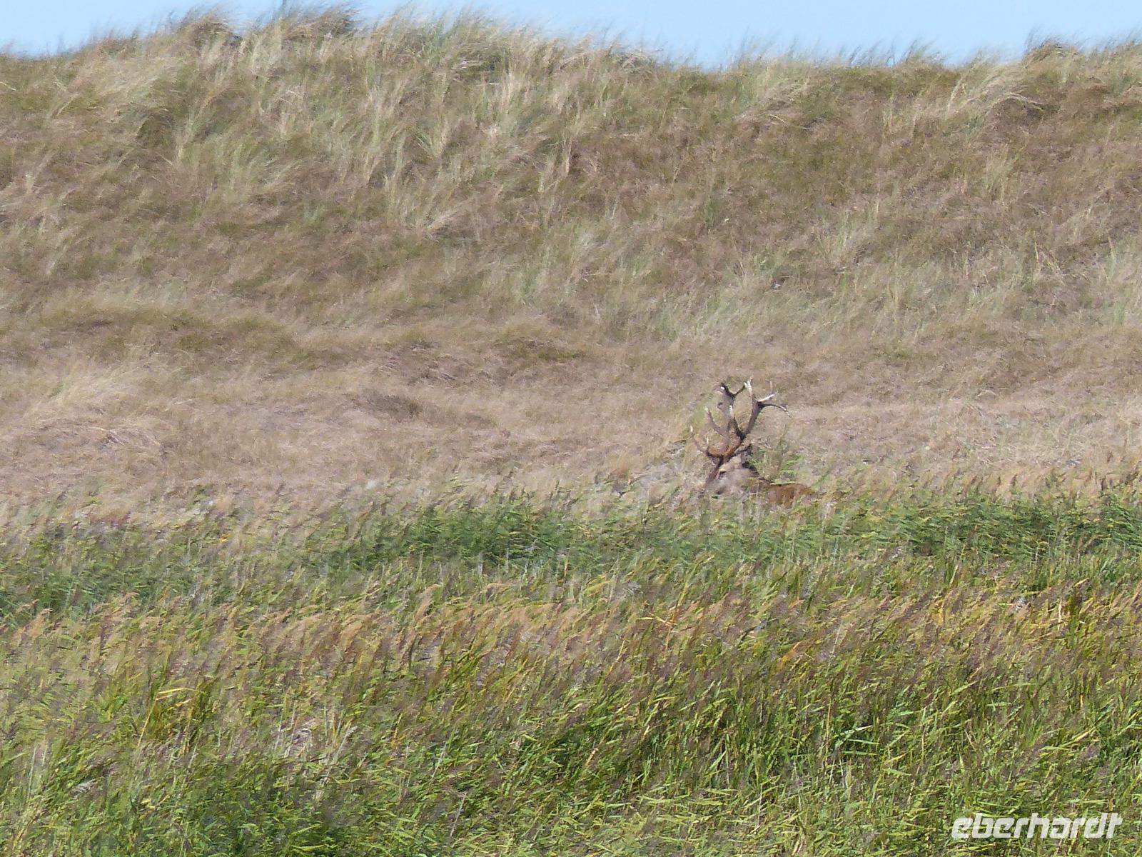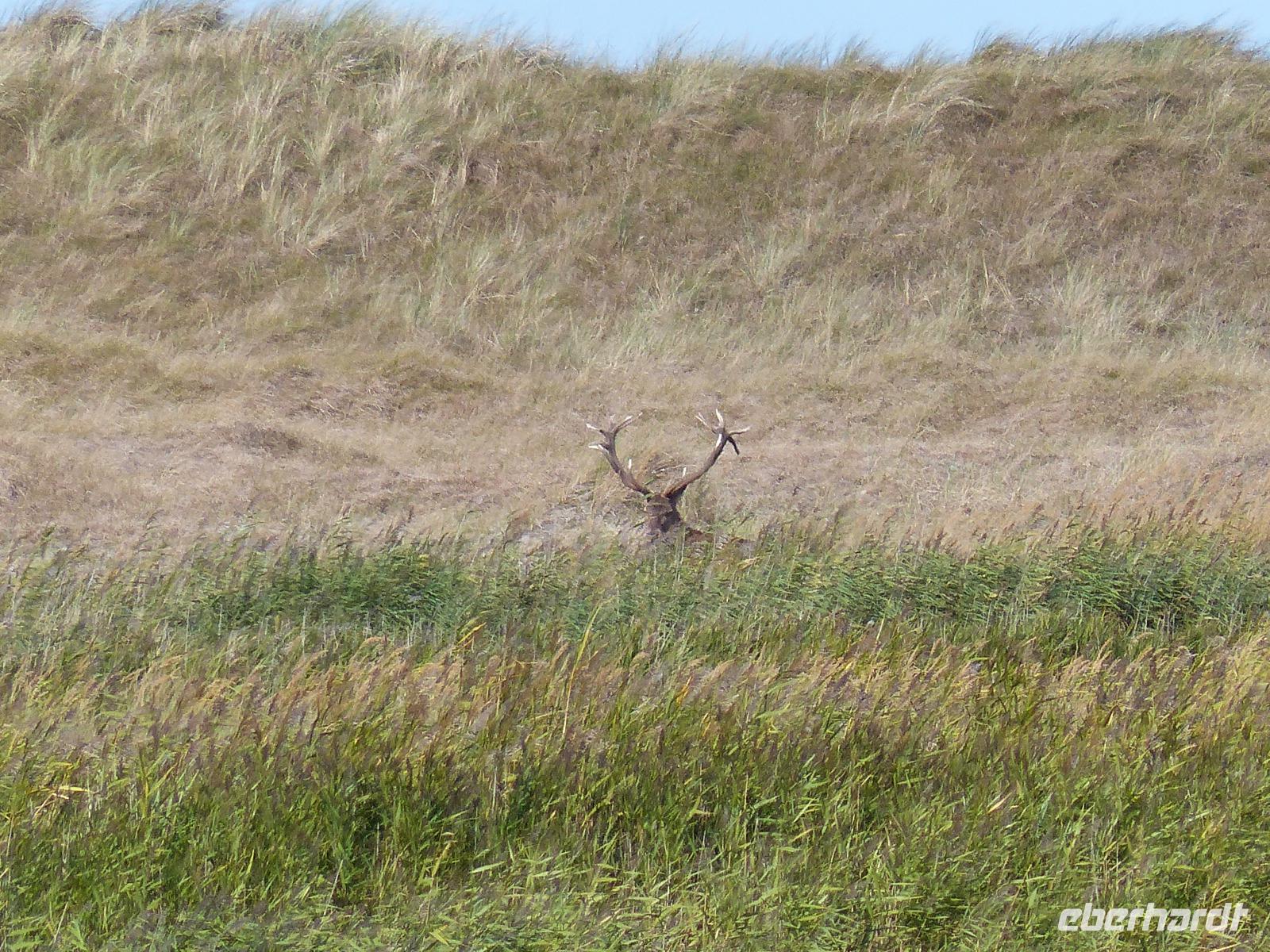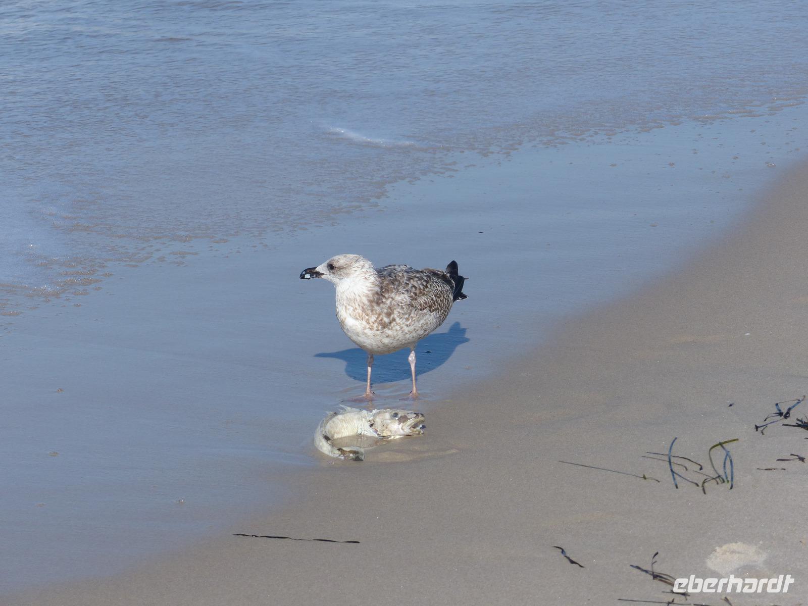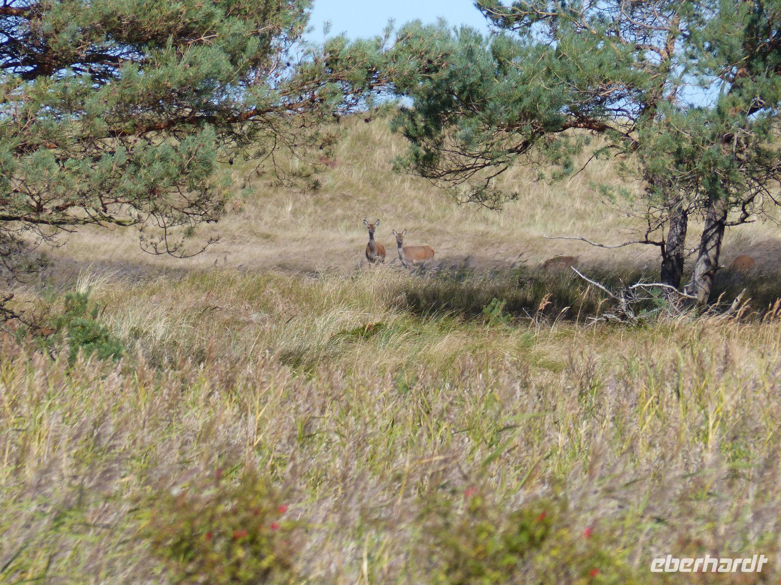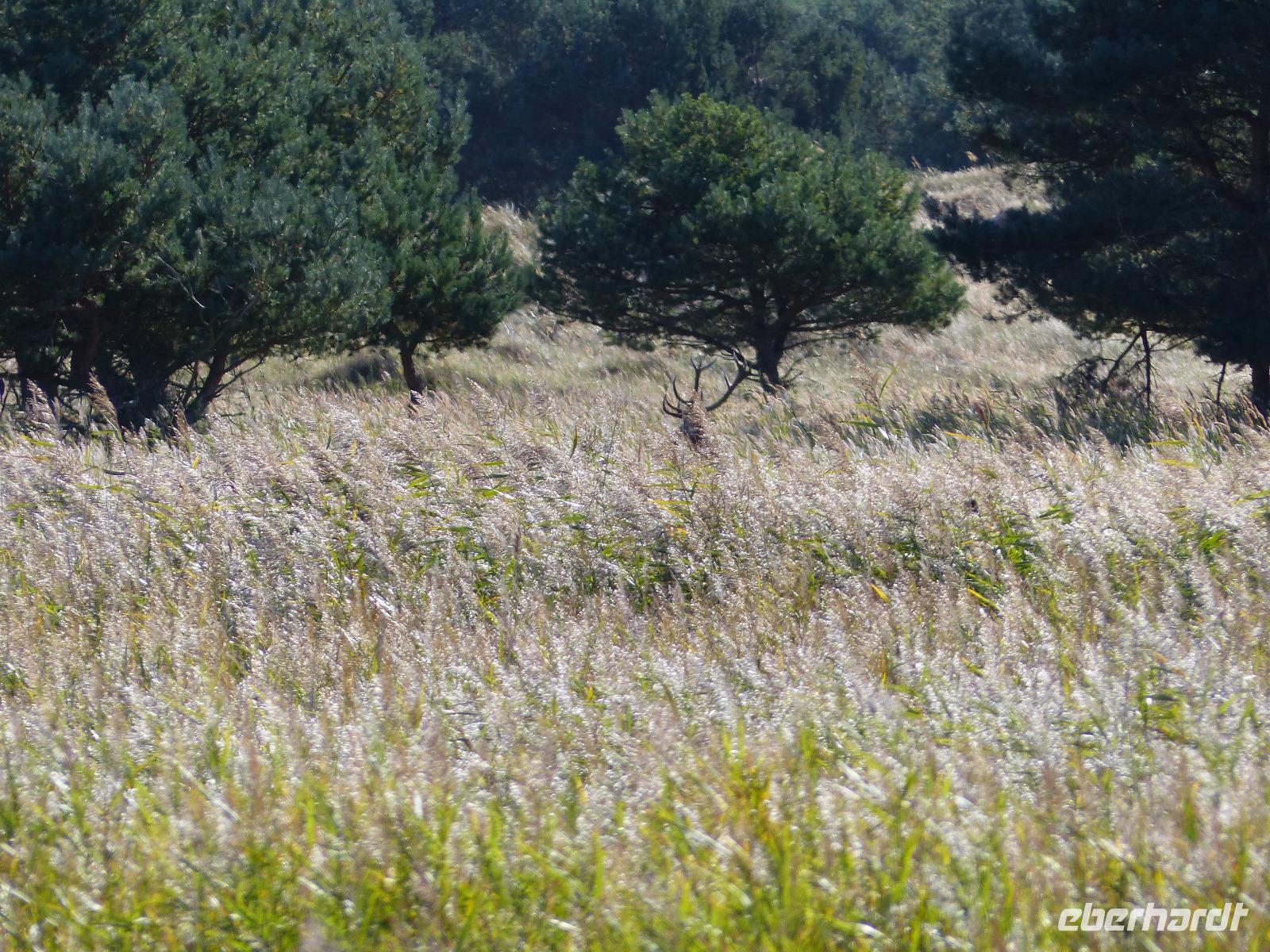 Wir fuhren mit unserem Bus durch Wustrow, Ahrenshoop und den Darßwald und erreichten schließlich Prerow. Dort spazierten wir durch den hübschen Ort und durch den Darßwald zum Leuchtturm am Darßer Ort. Einige Gäste bestiegen den Leuchtturm und genossen die herrliche Aussicht über das Meer und den Nationalpark, andere zog es nicht so sehr auf die steile Wendeltreppe und sie genossen den Blick von unten hoch zum Turm. Der Himmel war heute blitzblau und es war viel wärmer als am Vortag. Nach einer gemütlichen Mittagspause, die wir bei einem Kaffee oder einem Essen genossen, folgte ein Besuch des sehr gut gestalteten Museums zur Geologie und zu den lebendigen und ausgestorbenen Wesen der Region. Dann trennten wir uns, denn einigen Gästen war es nun nicht mehr so sehr zum Wandern zumute. Sie fuhren mit dem Kremserfahrzeug am frühen Nachmittag zurück und bummelten noch durch Prerow. Die Wanderer zogen mit mir am Strand entlang nordwärts. Einsam war es hier nicht gerade. Gebadet hat zwar niemand, aber der ganze Strand saß voller Menschen. Dann folgten wir einem Bohlenpfad, der uns in die Schutzzone des Nationalparks führte. Und hier sahen wir - wie fast jedes Jahr um diese Zeit - Hirsche, deren Brunft in vollem Gange war. Das Schilf wogte im Wind und wir wanderten weiter am Nothafen vorüber, der nun ausgebaggert wird. Nun ging's am Nordstrand entlang nach Prerow zurück. Die Möwen und Strandläuferchen baten zum Fototermin. Es ist gar nicht so einfach Möwen im Flug zu fotografieren. Aber mir gelang es schließlich. Dann bummelten auch wir noch durch Prerow. Hier konnten wir leckeres Eis samt Fischbrötchen finden. Und abends wartete im Hotel mal wieder ein prächtiges Buffet auf uns.