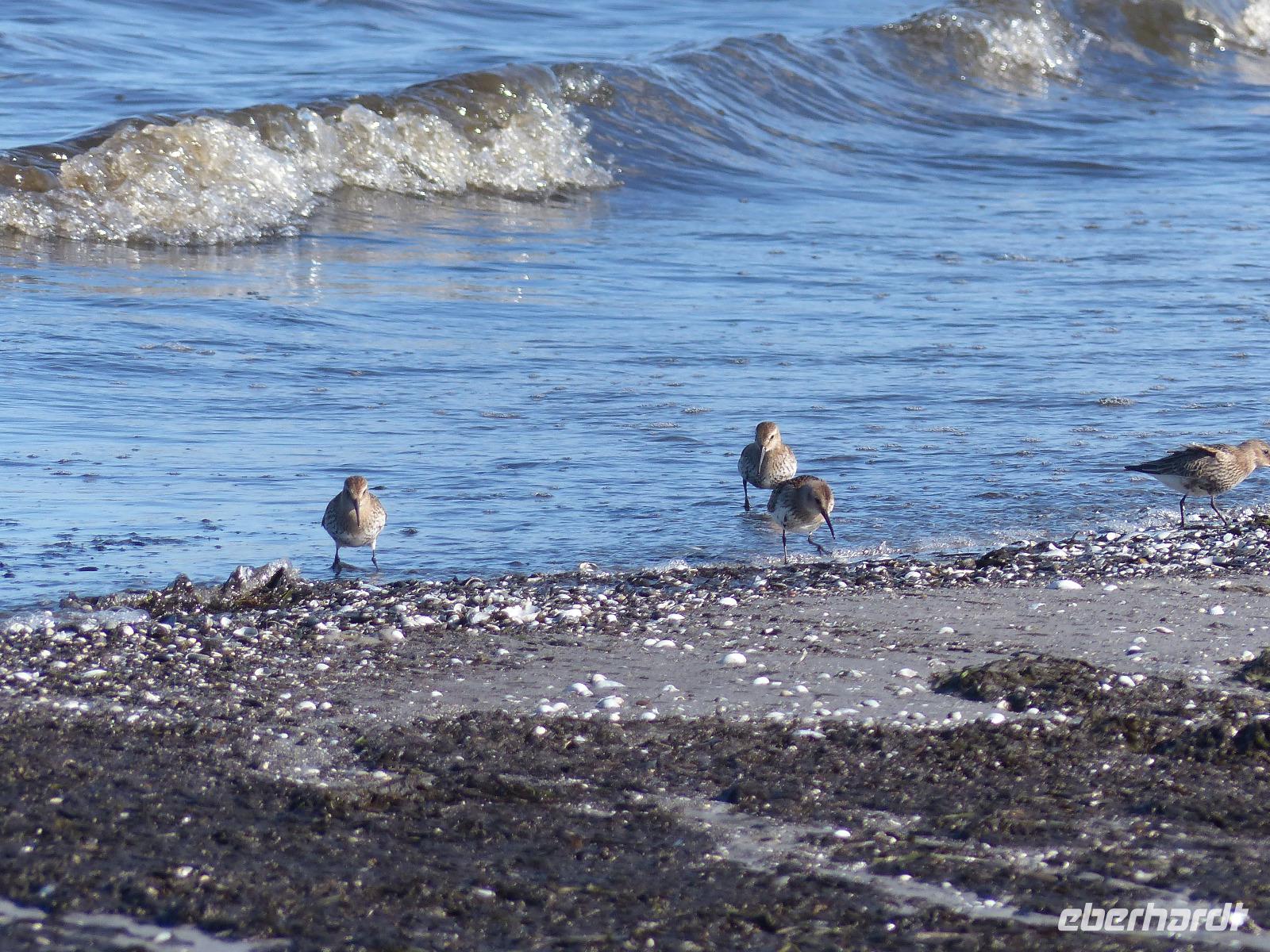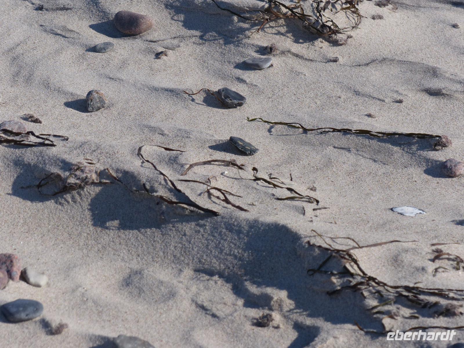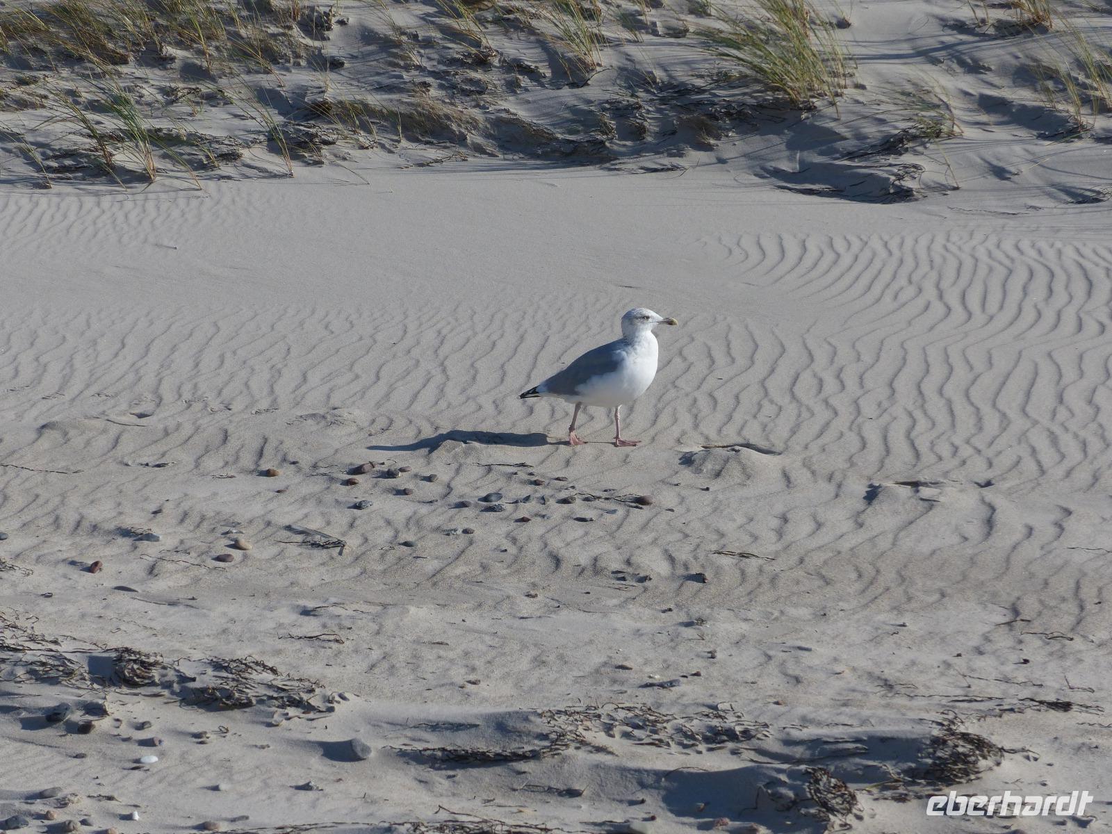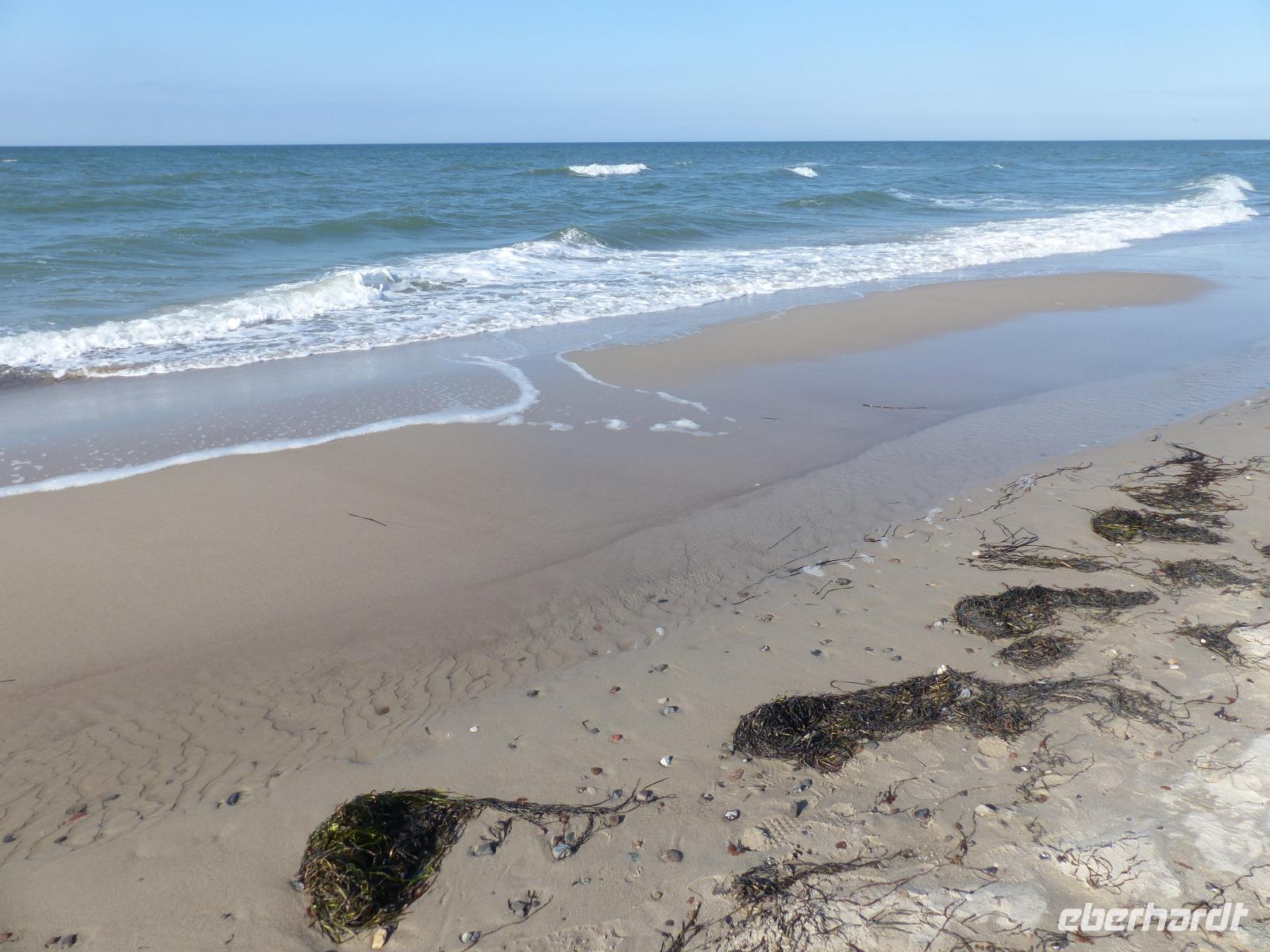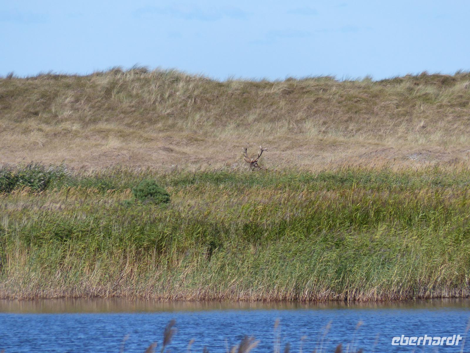 Wir fuhren mit unserem Bus durch Wustrow, Ahrenshoop und den Darßwald und erreichten schließlich Prerow. Dort spazierten wir durch den hübschen Ort und durch den Darßwald zum Leuchtturm am Darßer Ort. Einige Gäste bestiegen den Leuchtturm und genossen die herrliche Aussicht über das Meer und den Nationalpark, andere zog es nicht so sehr auf die steile Wendeltreppe und sie genossen den Blick von unten hoch zum Turm. Der Himmel war heute blitzblau und es war viel wärmer als am Vortag. Nach einer gemütlichen Mittagspause, die wir bei einem Kaffee oder einem Essen genossen, folgte ein Besuch des sehr gut gestalteten Museums zur Geologie und zu den lebendigen und ausgestorbenen Wesen der Region. Dann trennten wir uns, denn einigen Gästen war es nun nicht mehr so sehr zum Wandern zumute. Sie fuhren mit dem Kremserfahrzeug am frühen Nachmittag zurück und bummelten noch durch Prerow. Die Wanderer zogen mit mir am Strand entlang nordwärts. Einsam war es hier nicht gerade. Gebadet hat zwar niemand, aber der ganze Strand saß voller Menschen. Dann folgten wir einem Bohlenpfad, der uns in die Schutzzone des Nationalparks führte. Und hier sahen wir - wie fast jedes Jahr um diese Zeit - Hirsche, deren Brunft in vollem Gange war. Das Schilf wogte im Wind und wir wanderten weiter am Nothafen vorüber, der nun ausgebaggert wird. Nun ging's am Nordstrand entlang nach Prerow zurück. Die Möwen und Strandläuferchen baten zum Fototermin. Es ist gar nicht so einfach Möwen im Flug zu fotografieren. Aber mir gelang es schließlich. Dann bummelten auch wir noch durch Prerow. Hier konnten wir leckeres Eis samt Fischbrötchen finden. Und abends wartete im Hotel mal wieder ein prächtiges Buffet auf uns.