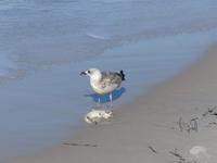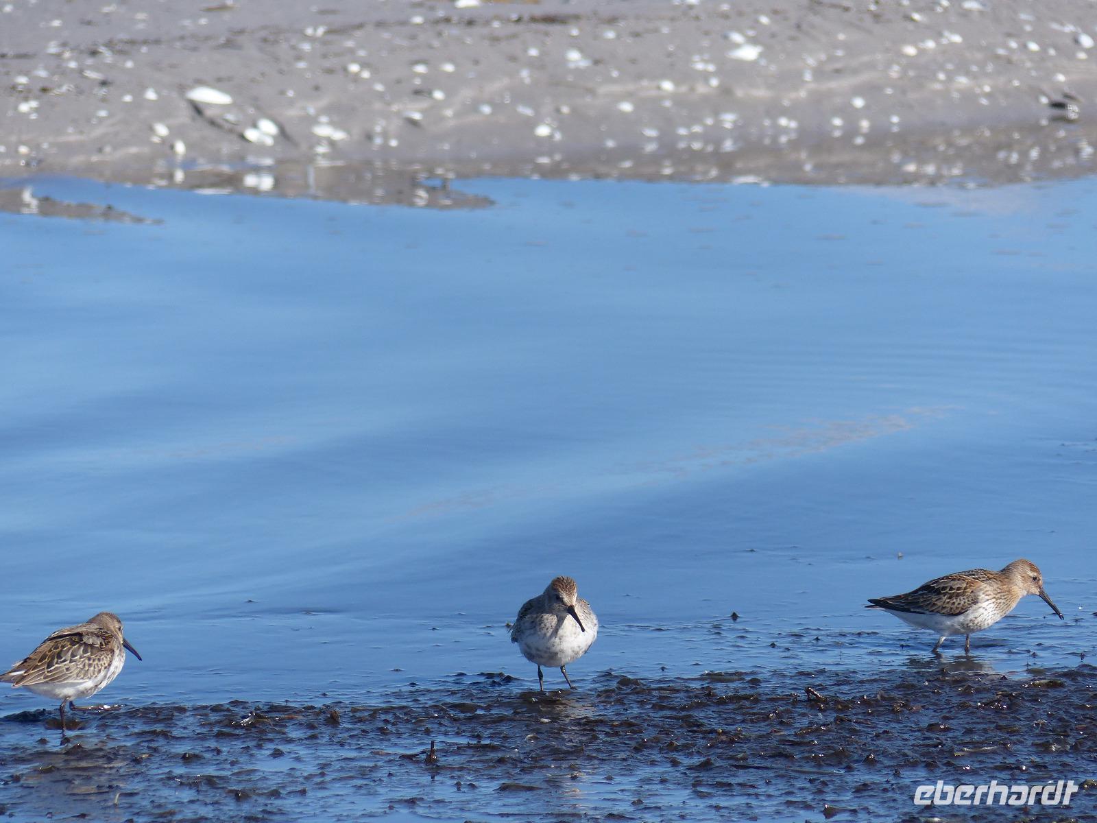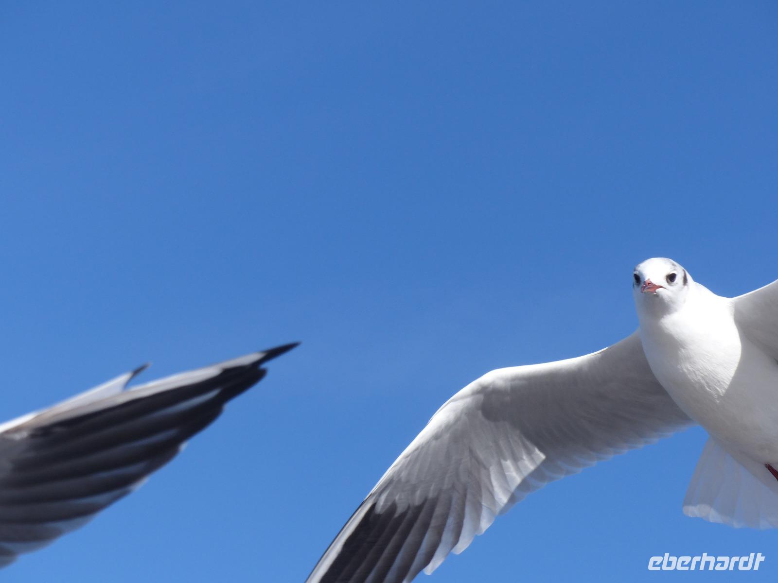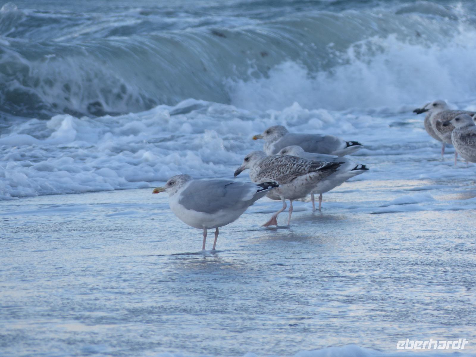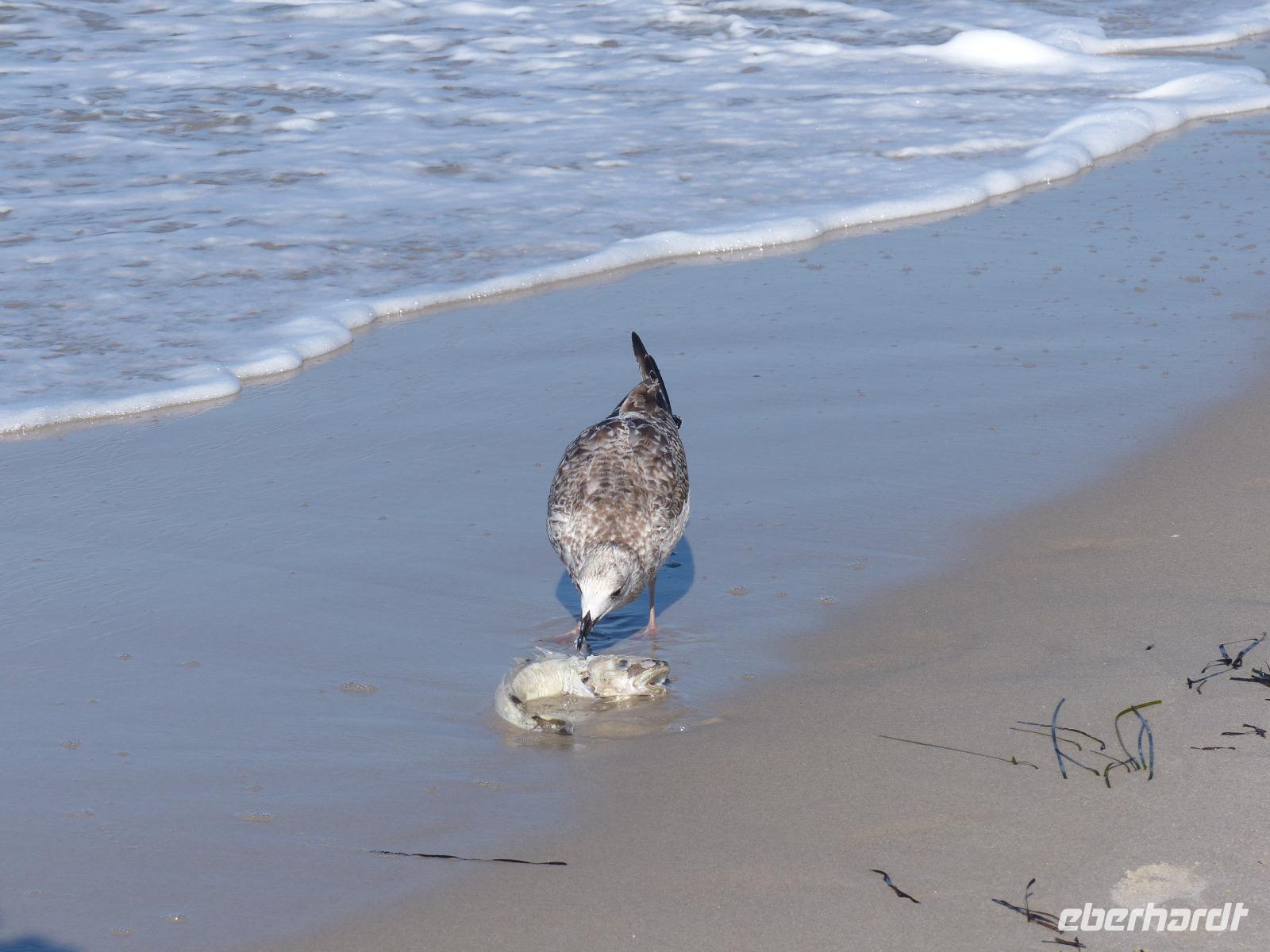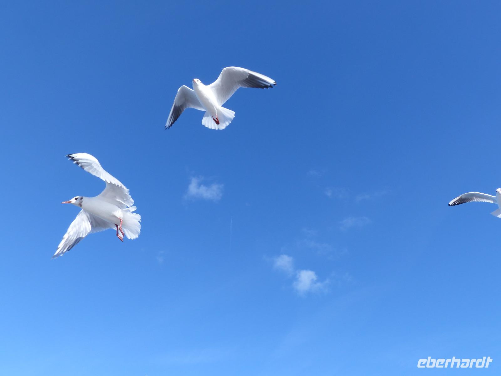 Wir fuhren mit unserem Bus durch Wustrow, Ahrenshoop und den Darßwald und erreichten schließlich Prerow. Dort spazierten wir durch den hübschen Ort und durch den Darßwald zum Leuchtturm am Darßer Ort. Einige Gäste bestiegen den Leuchtturm und genossen die herrliche Aussicht über das Meer und den Nationalpark, andere zog es nicht so sehr auf die steile Wendeltreppe und sie genossen den Blick von unten hoch zum Turm. Der Himmel war heute blitzblau und es war viel wärmer als am Vortag. Nach einer gemütlichen Mittagspause, die wir bei einem Kaffee oder einem Essen genossen, folgte ein Besuch des sehr gut gestalteten Museums zur Geologie und zu den lebendigen und ausgestorbenen Wesen der Region. Dann trennten wir uns, denn einigen Gästen war es nun nicht mehr so sehr zum Wandern zumute. Sie fuhren mit dem Kremserfahrzeug am frühen Nachmittag zurück und bummelten noch durch Prerow. Die Wanderer zogen mit mir am Strand entlang nordwärts. Einsam war es hier nicht gerade. Gebadet hat zwar niemand, aber der ganze Strand saß voller Menschen. Dann folgten wir einem Bohlenpfad, der uns in die Schutzzone des Nationalparks führte. Und hier sahen wir - wie fast jedes Jahr um diese Zeit - Hirsche, deren Brunft in vollem Gange war. Das Schilf wogte im Wind und wir wanderten weiter am Nothafen vorüber, der nun ausgebaggert wird. Nun ging's am Nordstrand entlang nach Prerow zurück. Die Möwen und Strandläuferchen baten zum Fototermin. Es ist gar nicht so einfach Möwen im Flug zu fotografieren. Aber mir gelang es schließlich. Dann bummelten auch wir noch durch Prerow. Hier konnten wir leckeres Eis samt Fischbrötchen finden. Und abends wartete im Hotel mal wieder ein prächtiges Buffet auf uns.