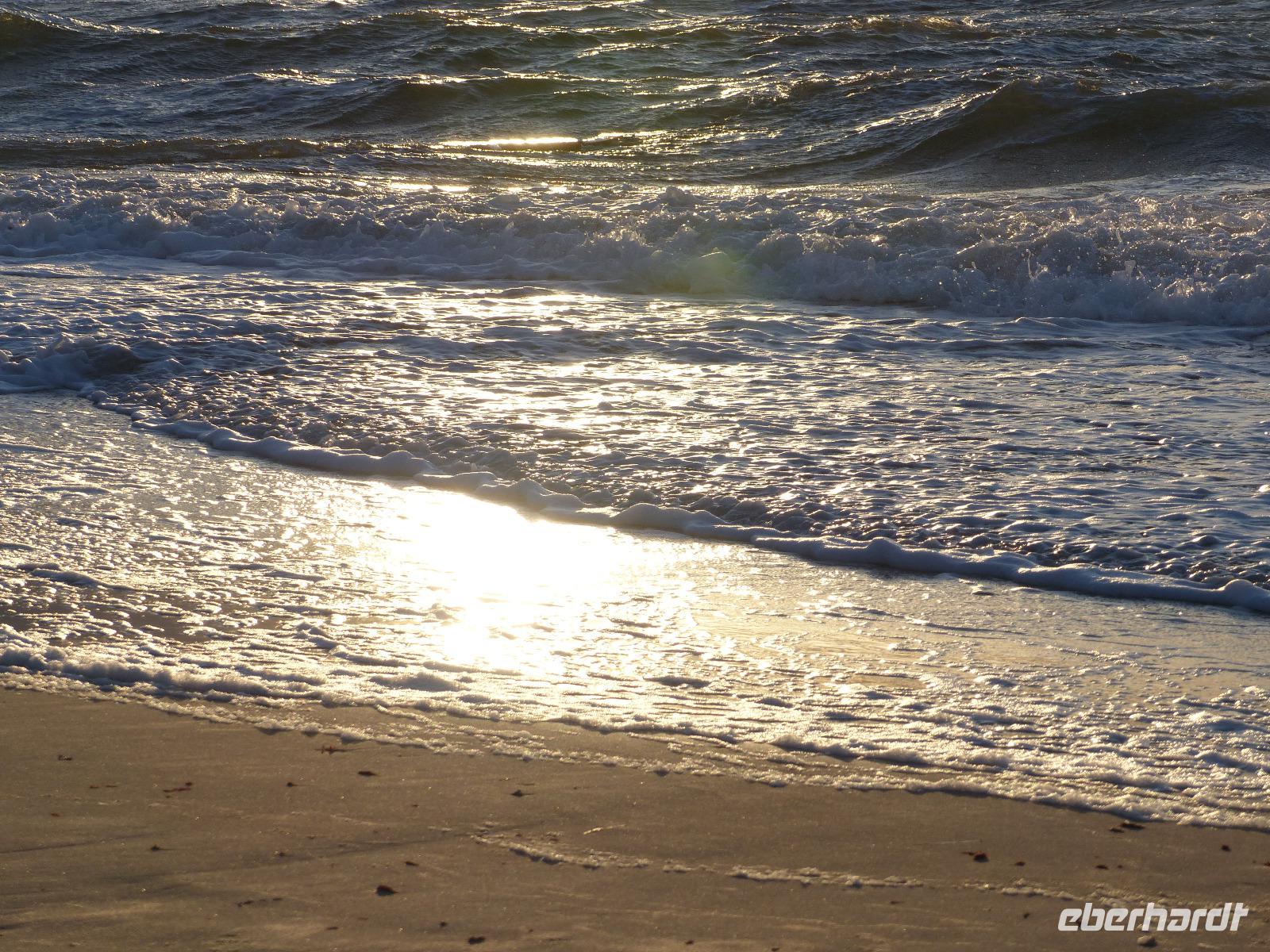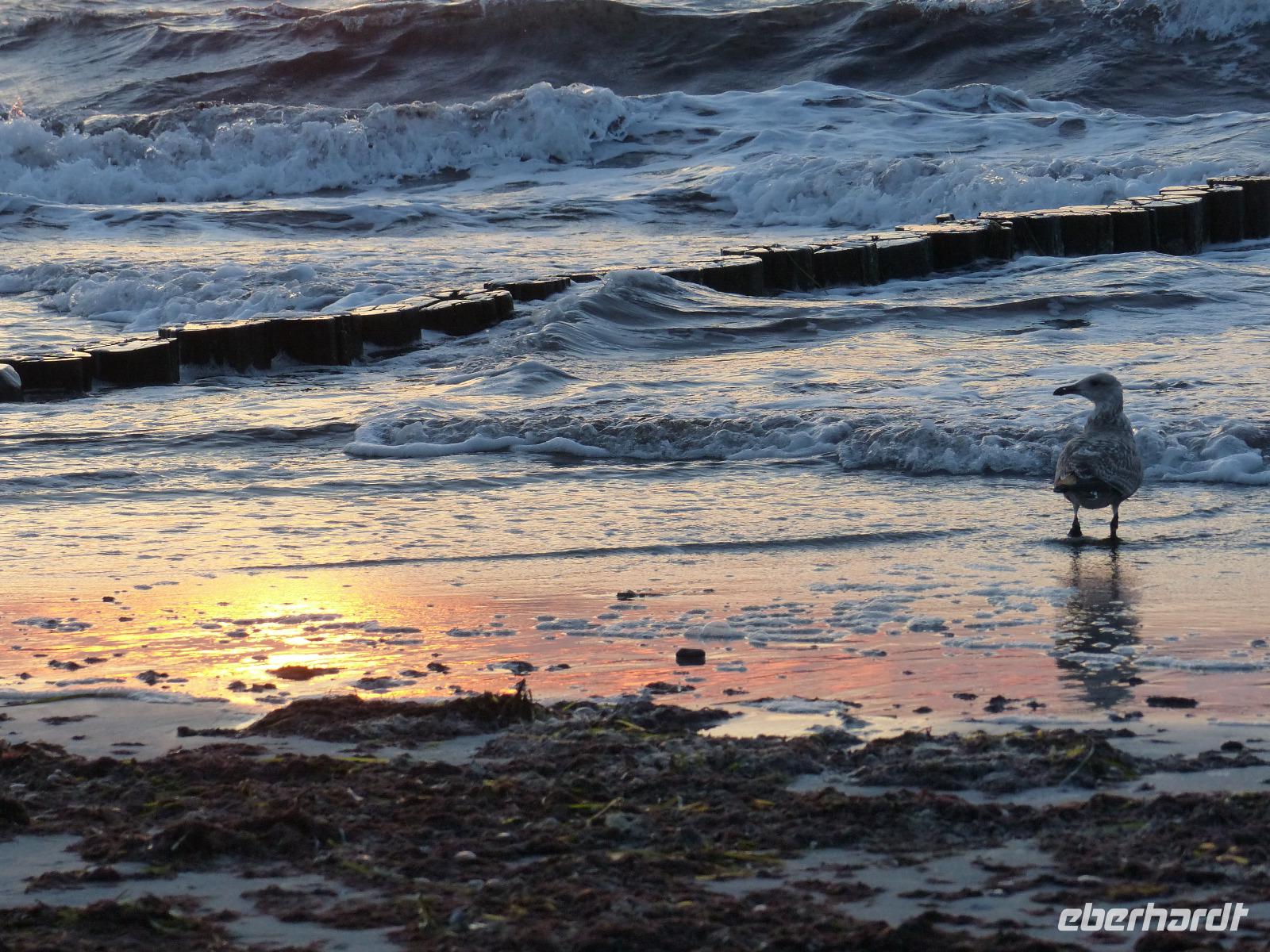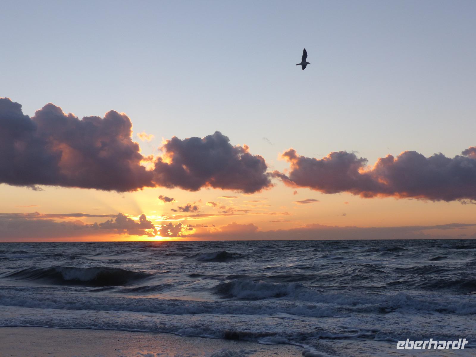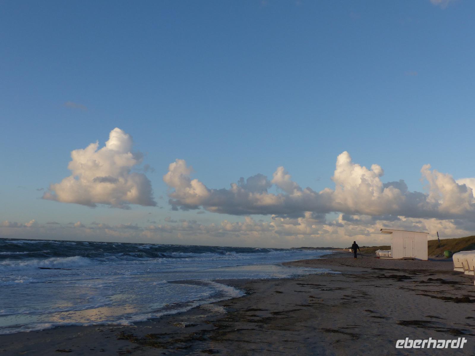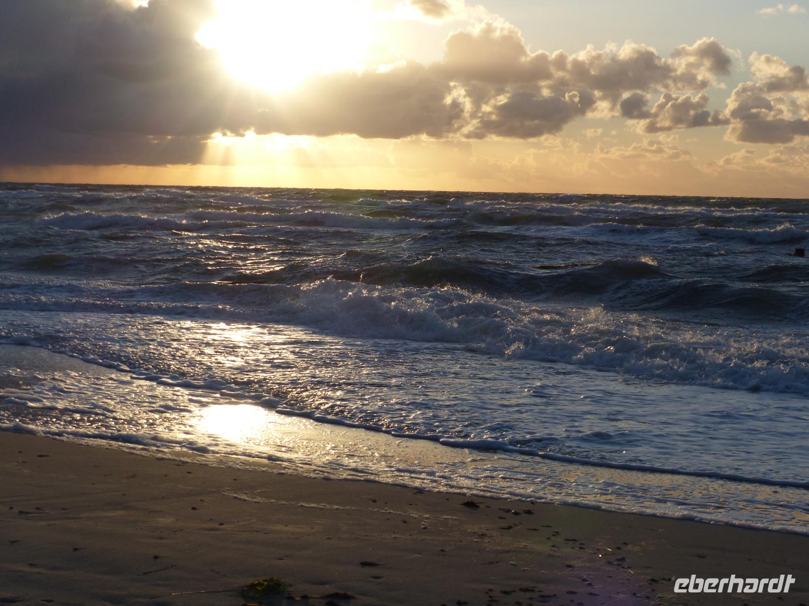 Unser Bus fuhr von Dresden über Leipzig an Dessau vorüber. Im Havelland stieg dann die Reiseleiterin und unsere Berlinerin zu. 3 Gäste reisten mit dem Auto an, denn nicht jeder Gast wohnt an der Busstrecke. Im Rhinluch versammeln sich alljährlich im Herbst die Kraniche und wir sahen auf dieser Reise sogar größere Gruppen am Autobahnrand stehen. Nach unserer Ankunft in Dierhagen, wo wir schon von unseren Autofahrerinnen erwartet wurden, zogen wir sofort los und nutzten die noch verbleibende Zeit für einen ersten Abendspaziergang nach Dierhagen-Strand. Richtiges Herbstwetter hatten wir. Dicke Wolken fegten über den blauen Himmel und es windete kräftig. Die Ostsee war aufgewühlt und vor lauter Wellen war von den meisten Buhnenreihen gar nichts mehr zu sehen. Am Sandstrand entlang wanderten wir zurück zum Hotel und ließen uns die steife Briese um die Ohren wehen und bewunderten am Hotelstrand noch den Sonnenuntergang, bevor wir uns zum Abendessen begaben.