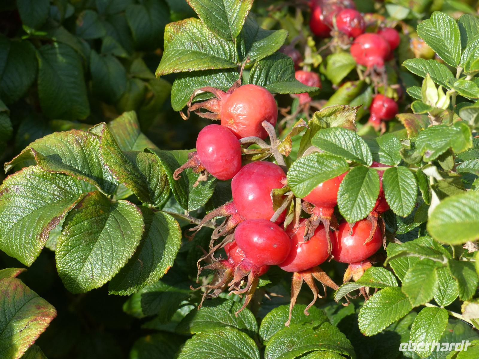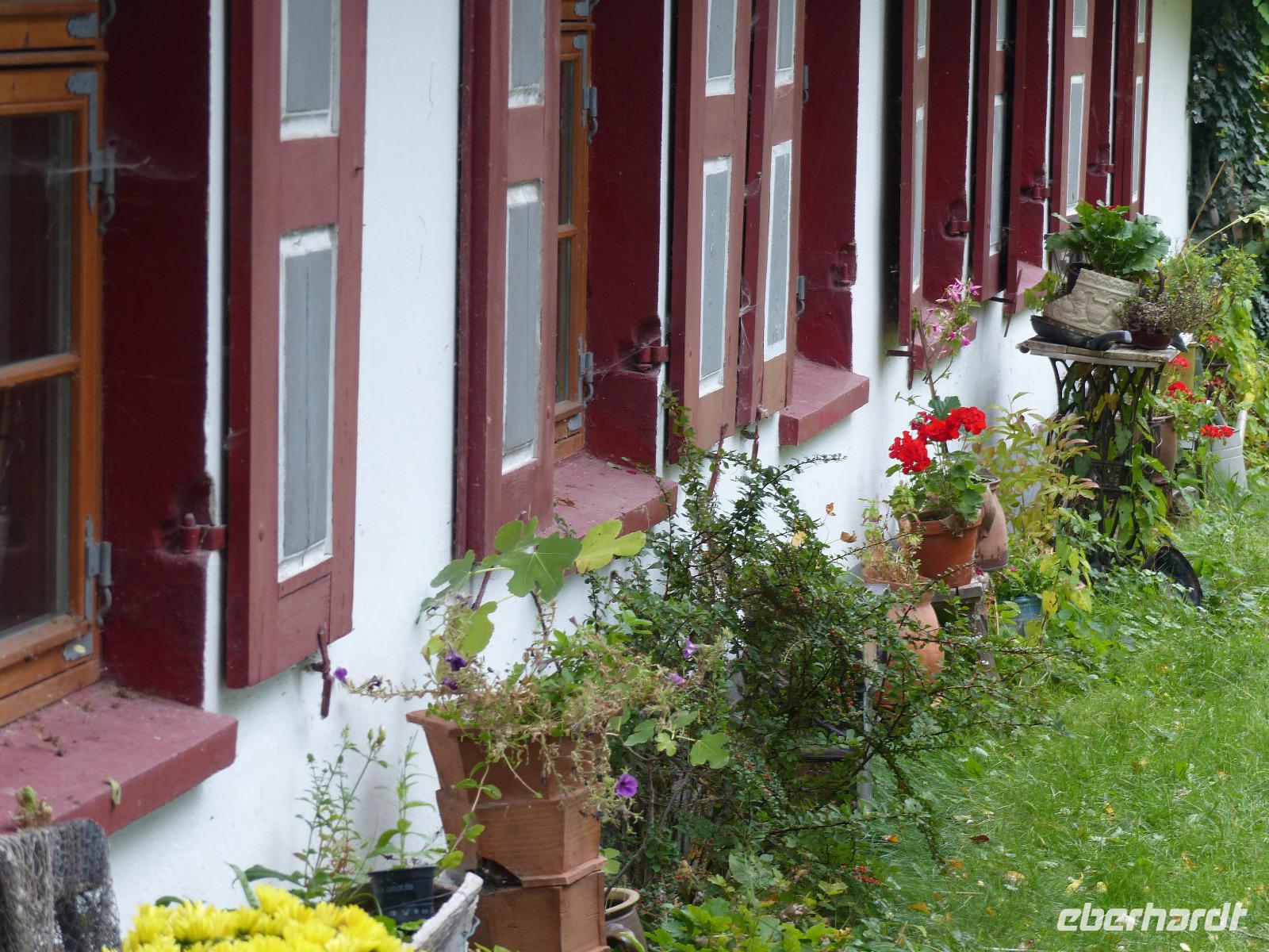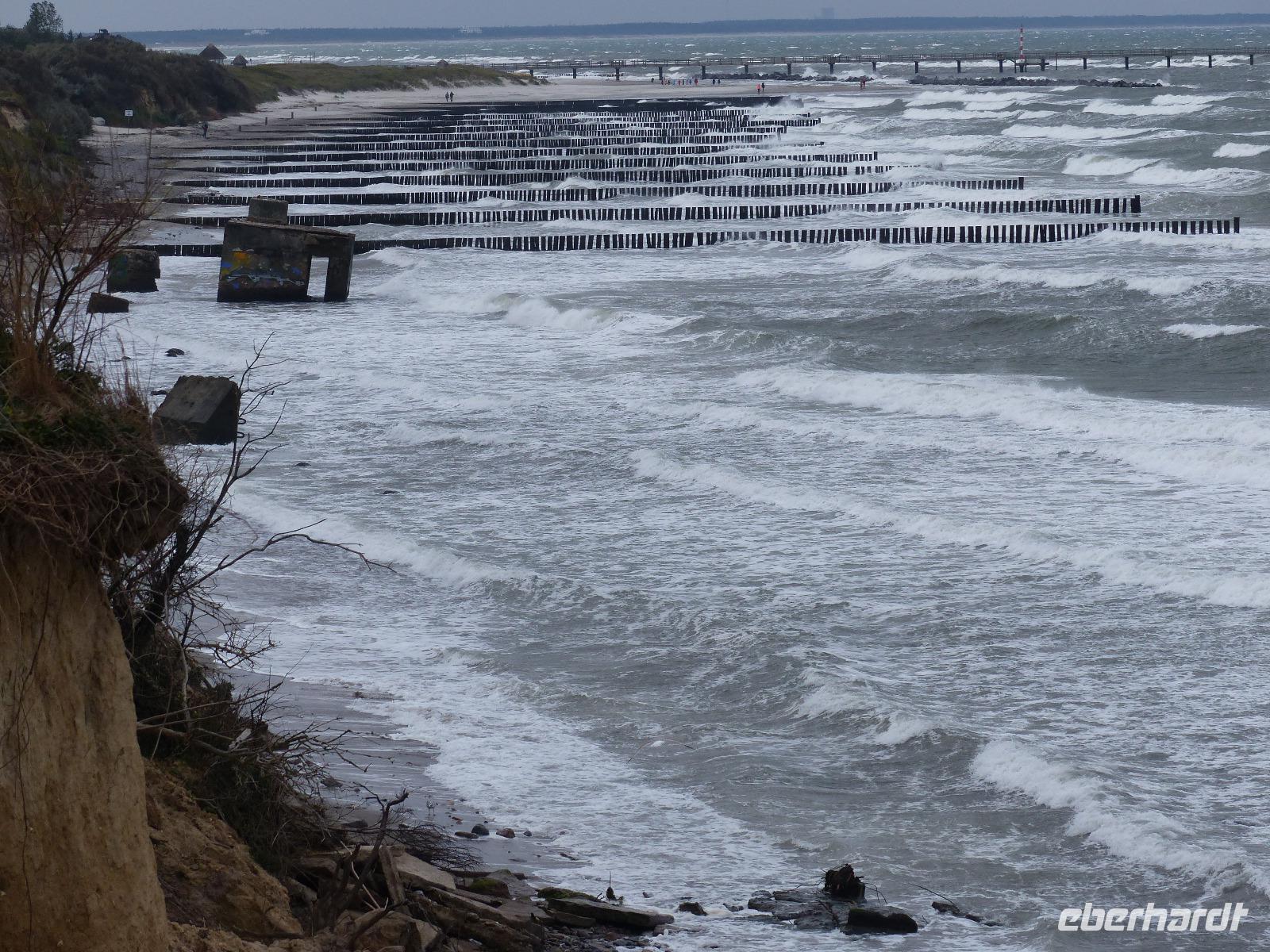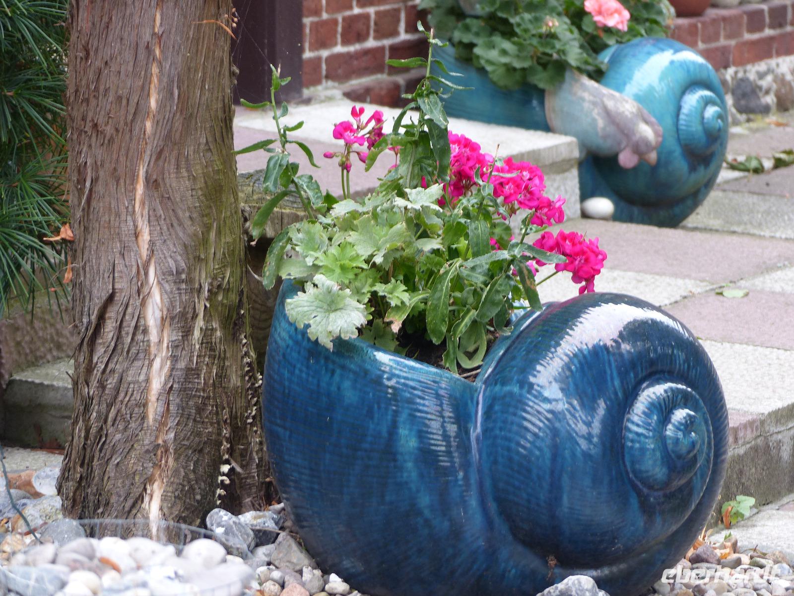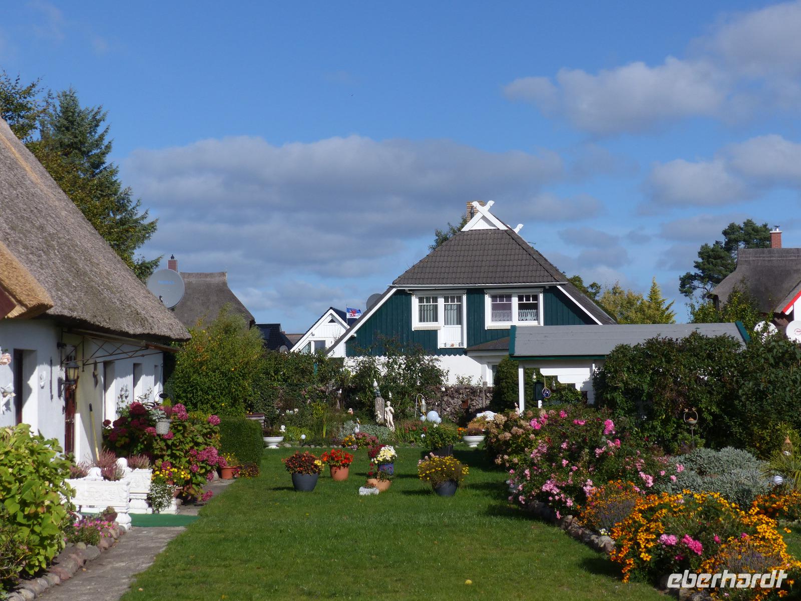 Am Vorabend bahnte sich bei mir ein Problem an: ich hatte doch glatt nach dem Zähneputzen Zahnstücke in der Hand. Da hieß es für mich früh aufstehen und hoffen, dass der Zahnarzt in Wustrow auch bereit ist mich schnell zu behandeln. Alles klappte, ich stand pünktlich um 9 Uhr wieder bissfest in Wustrow an der Seebrücke, aber ich musste mit leerem Magen losziehen. Essen durfte ich erst 2 Stunden später. Meine Gäste hatten unterdessen das Frühstück genossen und standen voller Energie nun vor mir. Das Wetter zeigte sich heute Vormittag von seiner sehr rauen Seite. Es stürmte kräftig und riesige Wellen donnerten auf die Wellenbrecher zu. So beließen wir es bei einem kurzen Blick auf die Seebrücke, denn eine morgendliche Meeresdusche wollten wir uns ersparen. Gut eingepackt in dicke Jacken, mit Mützen und Handschuhen trotzten wir diesem Herbststurm. An der Steilküste entlang wanderten wir in Richtung Ahrenshoop. Hagebutten und Sandornbeeren säumten unseren Weg. Im letzten Jahr war wieder ein größeres Stück der Steilküste abgebrochen. Der Weg, den ich noch im letzten Jahr mit den Eberhardt-Reisenden entlang gewandert bin, ist heute aus Sicherheitsgründen teilweise gesperrt. Das Meer gräbt hier immer mehr Land ab und Stück für Stück verschwindet der Weg in den Fluten. Wir bestiegen den höchsten Berg des Fischlandes, den 17,9 m hohen Bakelberg und zogen dann landeinwärts weiter. Ein rosarotes Popartkunstwerk erinnert hier oben an Paul Müller-Kaempff, der in Ahrenshoop die Künstlerkolonie gegründet hatte. Danach wanderten wir also eine auch für mich neue Strecke, spazierten an alten Weidenbüschen entlang durchs Landesinnere, zwischen wunderschönen Streublumenfeldern hindurch. Auch diese boten sich den Fotografen an. Nach unserer Ankunft in Ahrenshoop zogen wir uns zur Mittagspause in die Wärme zurück und genossen je nach Wunsch Herzhaftes, Fischiges oder Süßes. Ein paar Gäste gefiel Ahrenshoop so gut, dass sie gleich da blieben und auf den Rest der Wanderung verzichteten. Die Wanderer zogen weiter zwischen herbstlichen Gärten entlang zum Dornenhaus. Diese Galerie, die ihre Plastiken sehr malerisch im Garten plaziert hat, schauten wir uns kurz an. Das Dornenhaus stand aber schon lange bevor die Künstler aufs Fischland kamen. Dann wanderten wir weiter zum Hafen von Althagen und machten dort einen weiteren Halt, denn der Wunsch nach Räucherfisch kam auf. Vorüber an weiteren herrlich blühenden, herbstlichen Gärten voller Dalien, Apfelbäumchen mit leuchtenden Früchten und Sonnenblumen wanderten wir aus Ahrenshoop hinaus, zwischen Pferdekoppeln und Feldern entlang und erreichten schließlich, nachdem wir einen hübschen Wald durchquert hatten, Wustrow. Unser Ziel war der dortige Boddenhafen. Wer wollte, konnte sich die Kirche von Wustrow ansehen und auch den Turm besteigen, während andere es vorzogen, ein leckeres Eis zu essen, bevor es dann mit windzerzausten Frisuren, stahlenden Augen und roten Wangen wieder ins Hotel zurück ging.