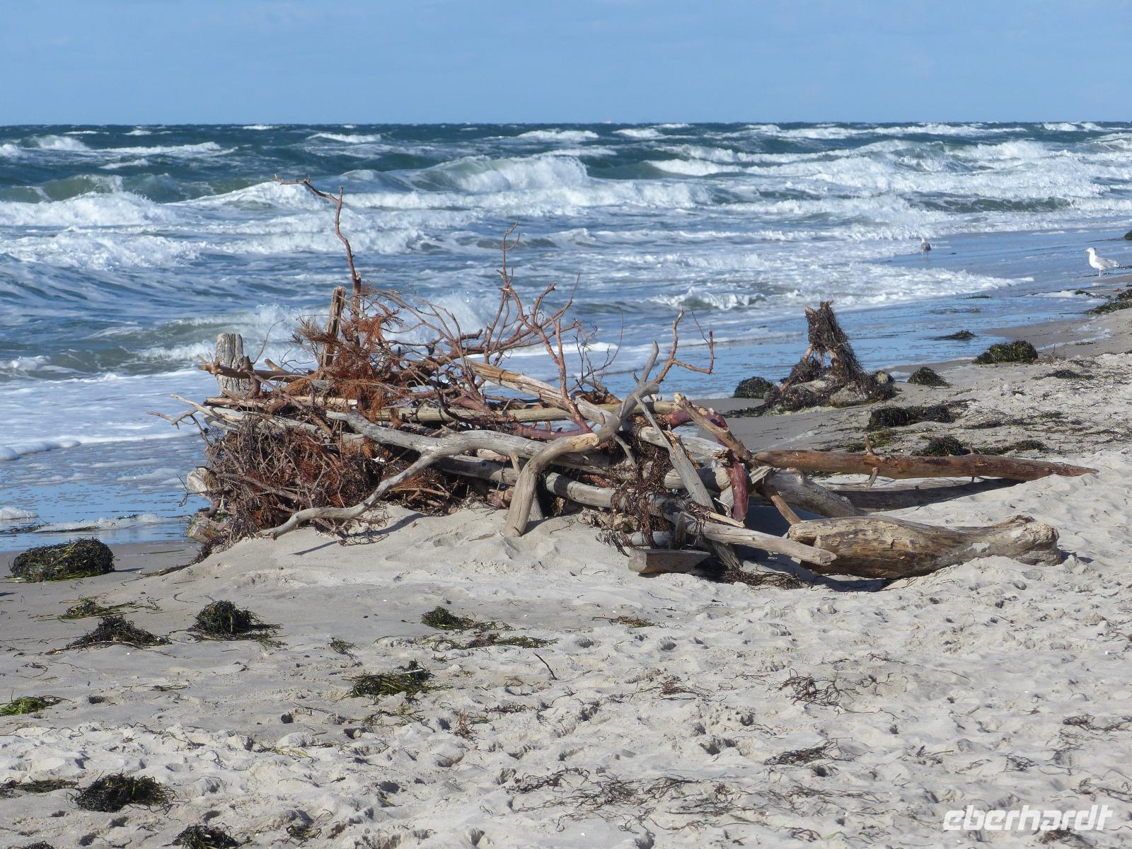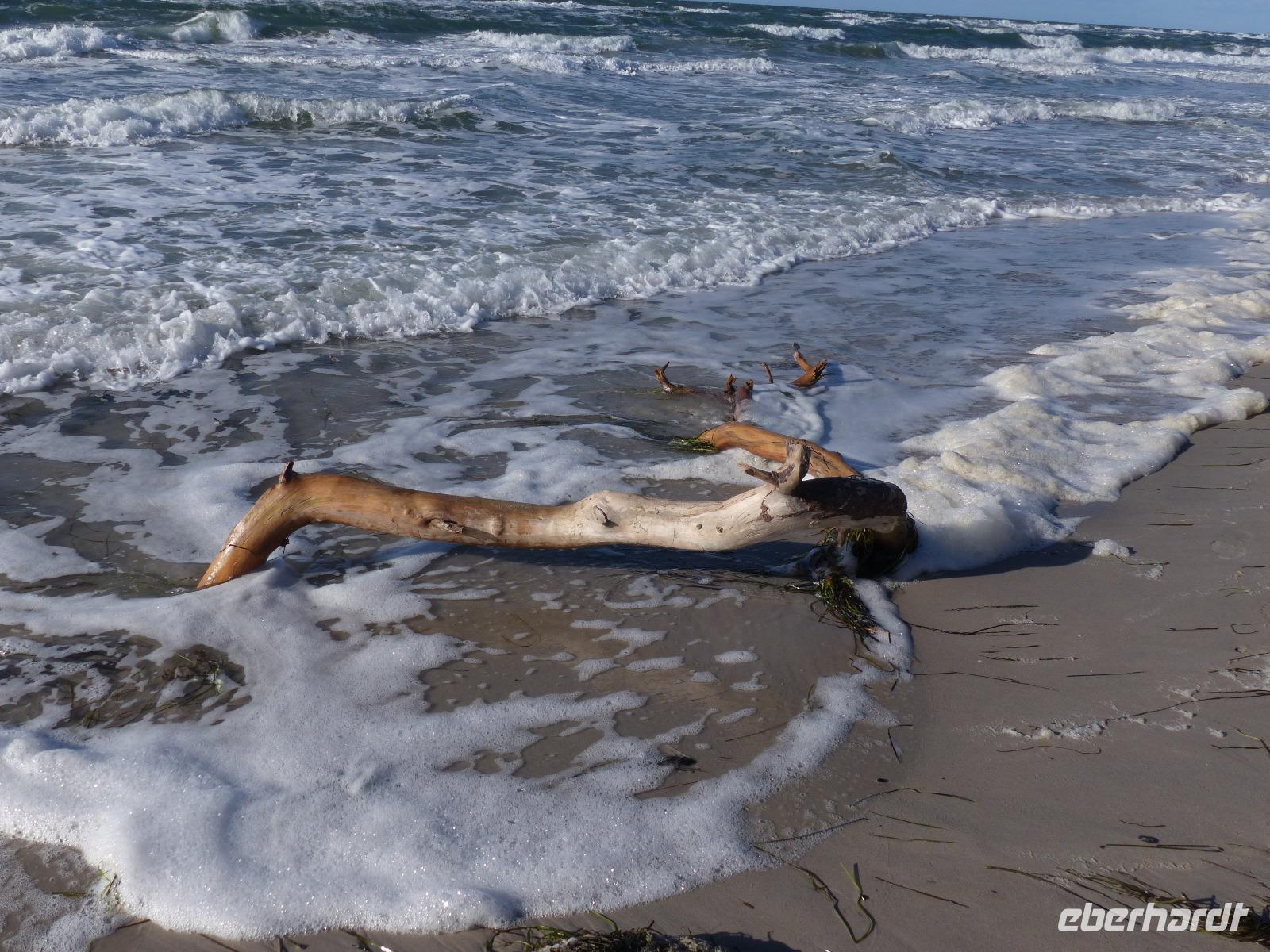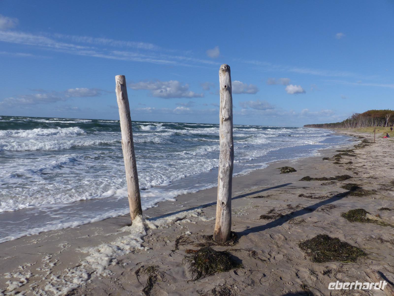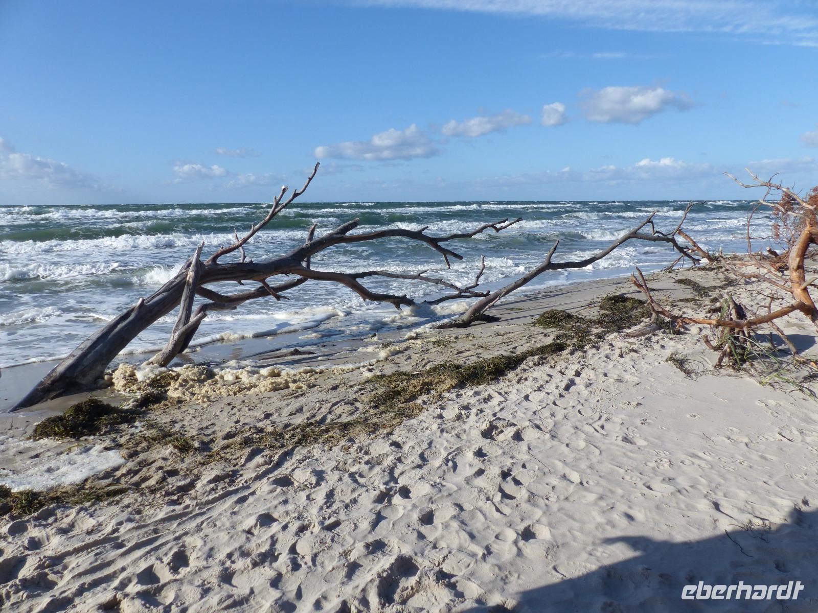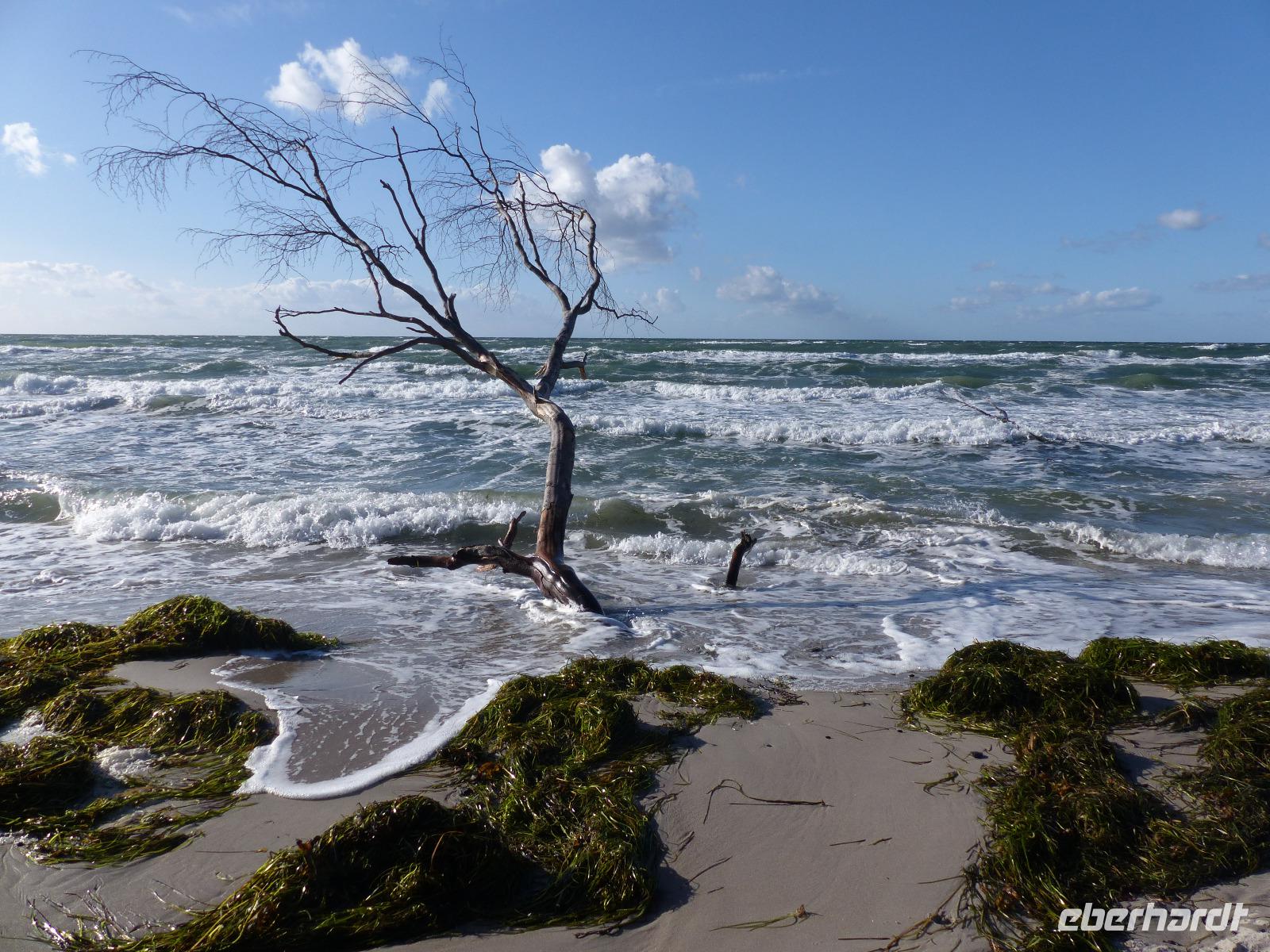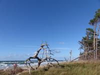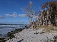 Wir begannen unsere letzte Wanderung in Wieck und genossen die Tour, die uns von Wieck am Bodden entlang nach Born führte. Dort begeisterten uns mal wieder die wunderschönen herbstlichen Gärten, die alten Holztüren, die Katen und Kapitänshäuser. Am Hafen machten wir Rast, genossen den Fisch und wunderten uns über den pfiffigen Ton, den mancher Einheimische an den Tag legen kann... Unsere Genusswanderer hatten teilweise keine Lust mehr am Nachmittag die Wanderung fortzusetzen und der Bus brachte sie ins Hotel zurück. Wir hatten wieder herrliches, aber stürmisches Herbstwetter. Wie sieht es da wohl am Weststrand aus?? Der ist an manchen Stellen sehr schmal und der Wasserstand der Ostsee lag fast einen Meter höher als in anderen Jahren. Der Wind hatte das Wasser aufgepeitscht und gegen die Küste gedrückt. Was mach ich da nur mit Euch...??? Gestärkt durch die Pause am Boddenhafen in Born zogen meine flotten Damen und unsere beiden noch flotteren Herren nun mit mir los und durchwanderten den Darsswald. Wir gingen am Grab des Försters von Raesfeld vorbei und erreichten schließlich den Darßer Weststrand. Unsere Pause hier fiel etwas kürzer aus als sonst, denn es windete kräftig. Der schmale Weststrand mit seinen bizarren Baumleichen war zunächst gut begehbar. „Das aufgewühlte Meer, der blaue Himmel, der Wind - und sehr wenig Menschen. Das ist toll hier, so habe ich mir das vorgestellt", sagte einer meiner Gäste. Ich bummelte, wie immer, mit den letzten Gästen mit, machte Fotos und achtete darauf, dass keiner am langen Strand verloren ging. Unsere schnellen Männer sollten an den ersten Buhnenreihen warten - nur sah man die vor lauter Wellen nicht. Zum Glück warteten sie trotzdem irgendwo auf der Strecke, bevor es zu schmal wurde. Nasse Füße wollten wir bei den frischen Temperaturen nicht haben und so machten wir einen Abstecher ins Landesinnere und umgingen die engsten Stellen und fuhren wie geplant am frühen Abend ins Hotel zurück. Vor dem Abendessen gab es von mir meine beiden Abschiedsgedichte, eines extra für die Wiederholungstäterin, die nun schon zum 3. Mal die gleiche Reise gebucht hat - einfach weil ihr diese Reise an den Darss so gut gefällt. „Ich hab es auch dieses Mal nicht bereut, denn es ist jedes Mal total anders hier!", so ihr Kommentar. Und mein Kommentar: „Zum 3. Mal - oh Graus, da gehen mir die Gedichte aus...". Unseren letzten Abend verbrachten wir mal wieder an der Hotelbar. „Diese Reise hat uns gut gefallen - was machst Du denn sonst noch für leichte Wanderreisen??", wurde ich gefragt. Und sofort wurden neue Urlaubspläne geschmiedet - Ihr habt mir jetzt schon meine „Nordfriesischen Inseln" gefüllt!!! Alle beide Termine im nächsten Sommer haben jetzt schon Durchführungsgarantie. Mit Euch setze ich mich nochmal an die Bar.......