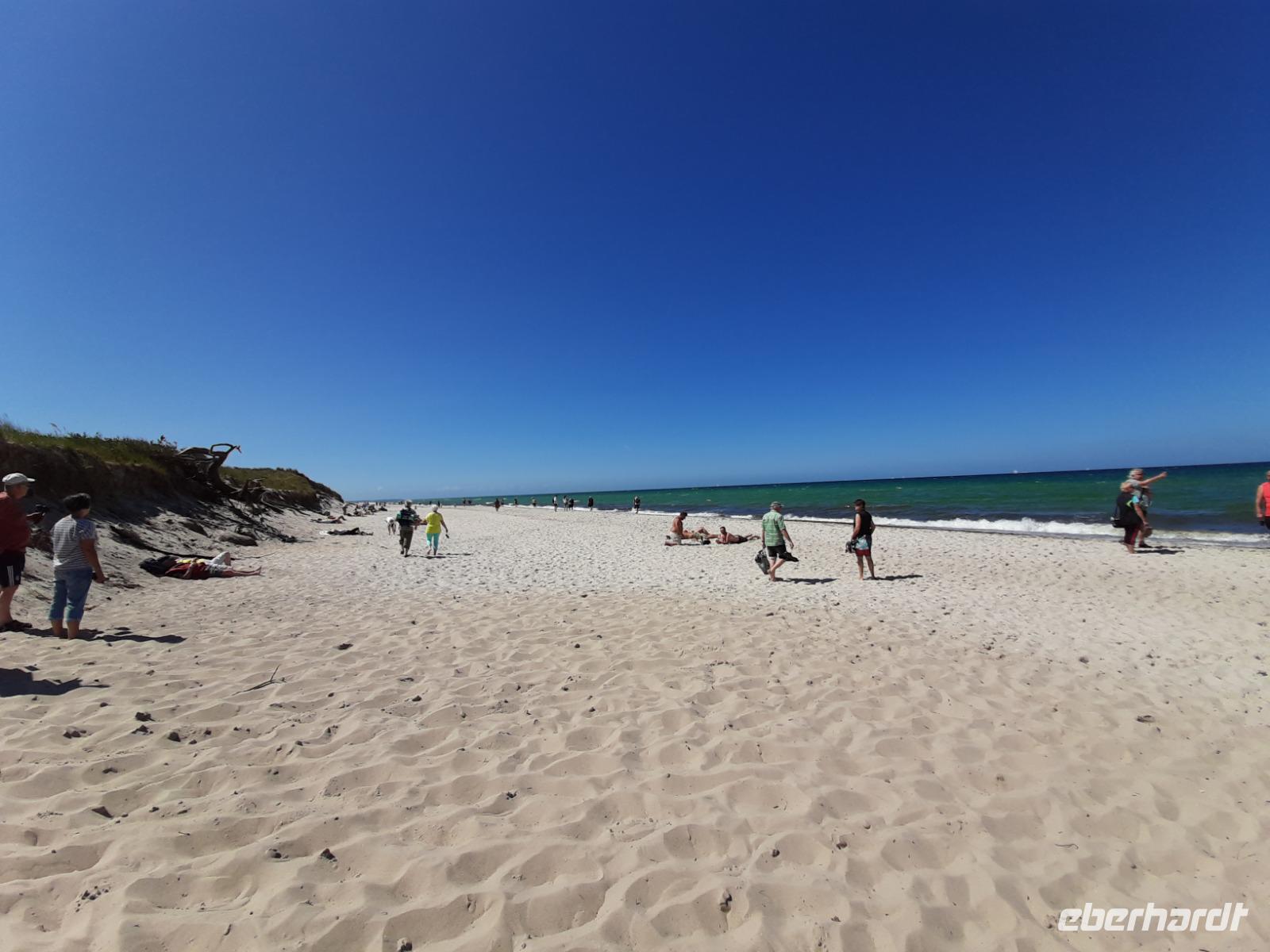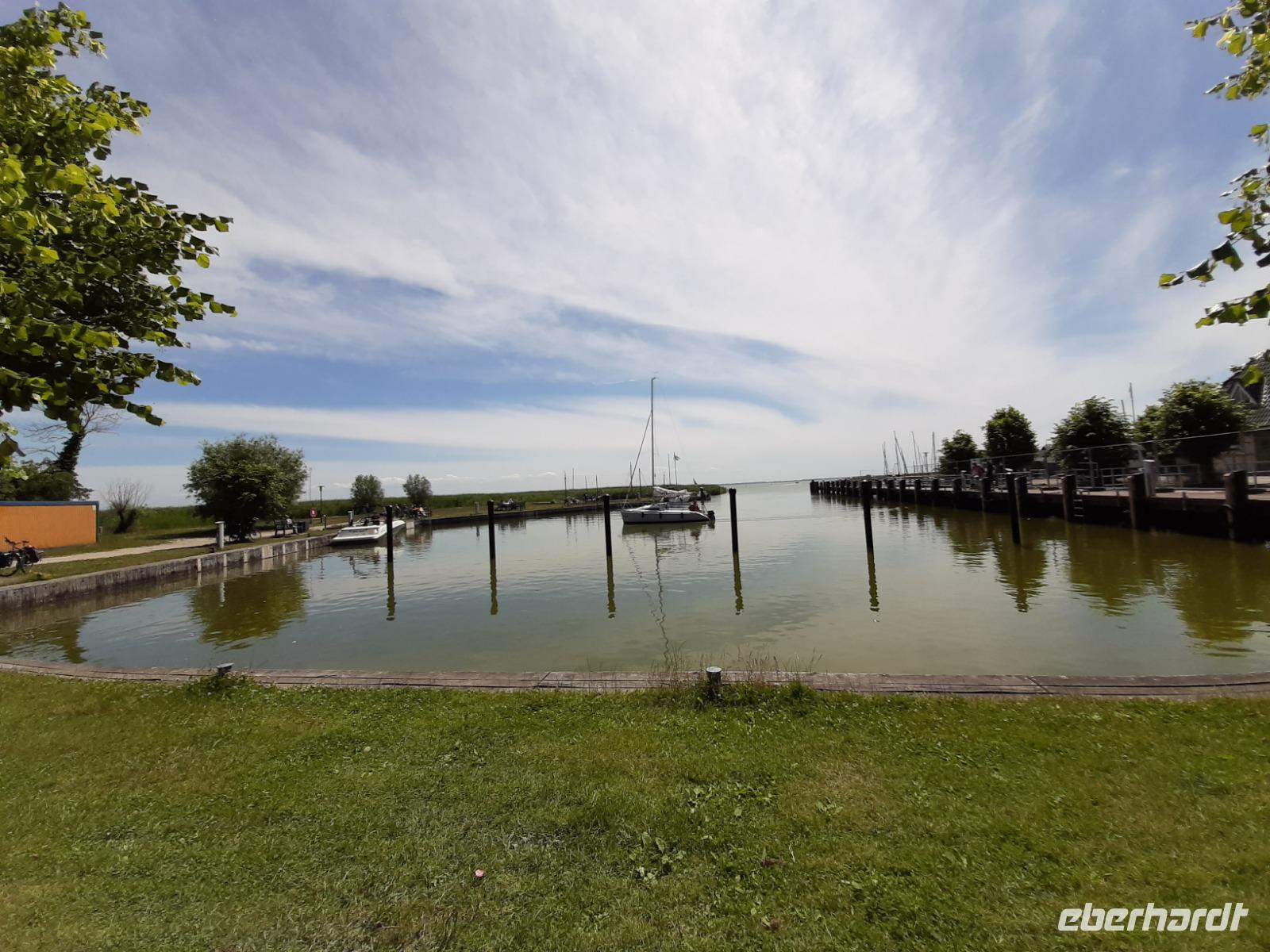 Heute legten wir zur Abwechslung mal einen Wander-Ruhetag ein und ließen es demnach auch langsam angehen. Wir verabredeten uns am späten Vormittag und spazierten zum direkt am Saaler Bodden gelegenen Hafen von Dierhagen-Dorf, wo zwei traditionelle Zeesboote mitsamt Kapitänen auf uns warteten. Einigen war etwas mulmig zumute, denn der Bodden war durch den recht starken Wind ziemlich aufgewühlt... Man erklärte uns dann später, dass es auf dem Bodden unmöglich sei, seekrank zu werden und dies nur auf hoher See passieren könnte. Also waren wir beruhigt und konnten diese Segelbootsfahrt in vollen Zügen genießen. Mit Zeesbooten wurden immerhin noch bis in die 1970er Jahre hinein auf den Vorpommerschen Boddengewässern gefischt und das Schlepp- bzw. Treibnetz, die sog. "Zeese", gab dem Boot seinen Namen. Wir ließen uns treiben und schipperten ca. 90 Minuten im Bodden umher. Es war traumhaft und die Sonne zeigte sich auch heute wieder in ihrer vollen Pracht. Später am Nachmittag nutzen wir die freie Zeit und das tolle Wetter zum Baden in der Ostsee bei Wassertemperaturen von 18 Grad am hoteleigenen Strand.
