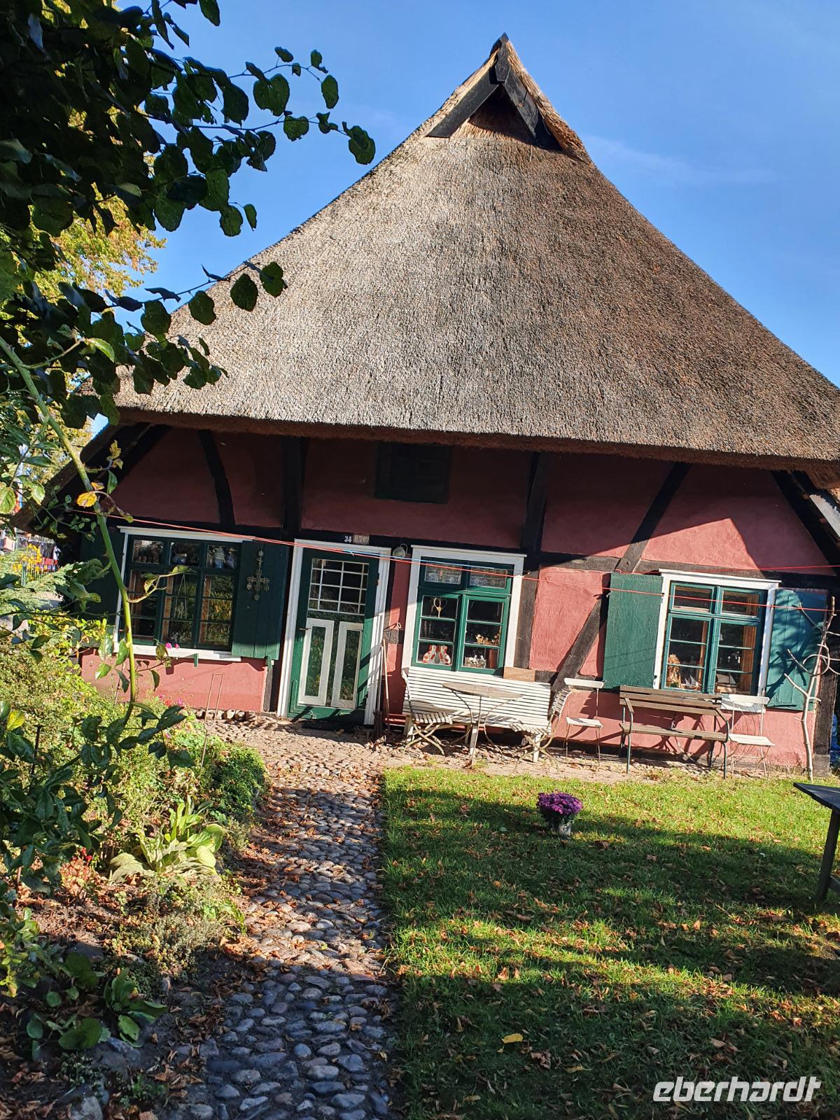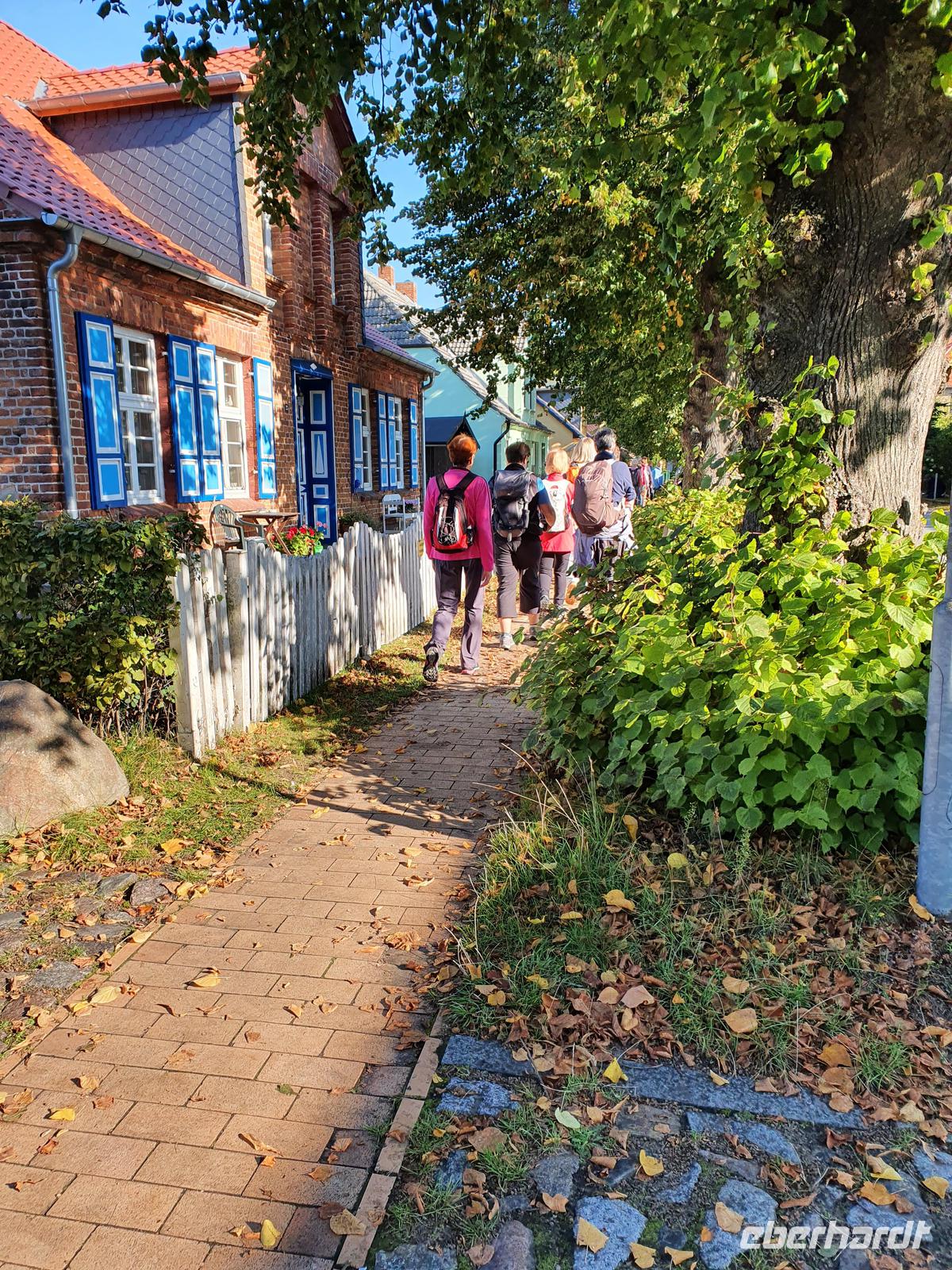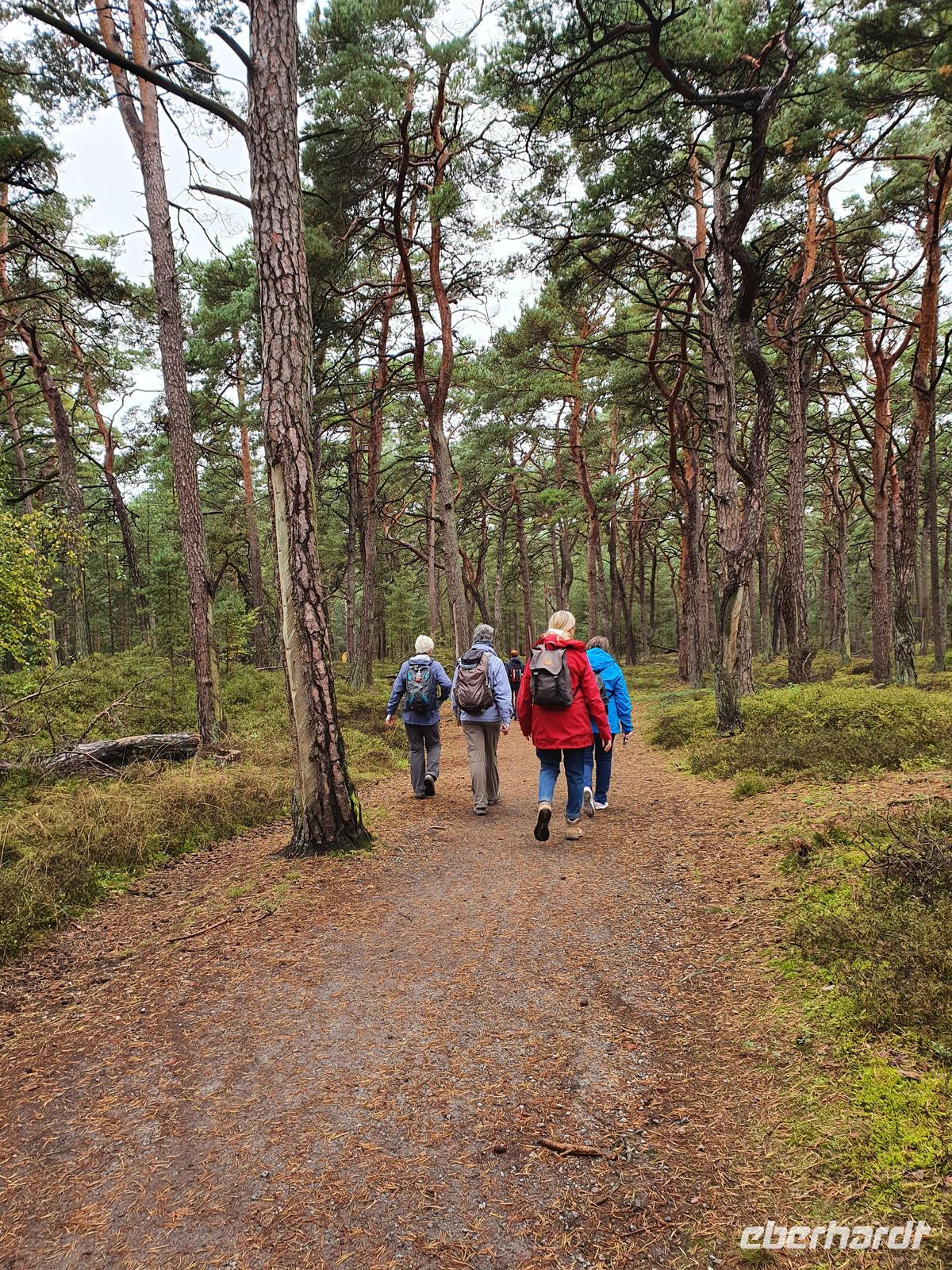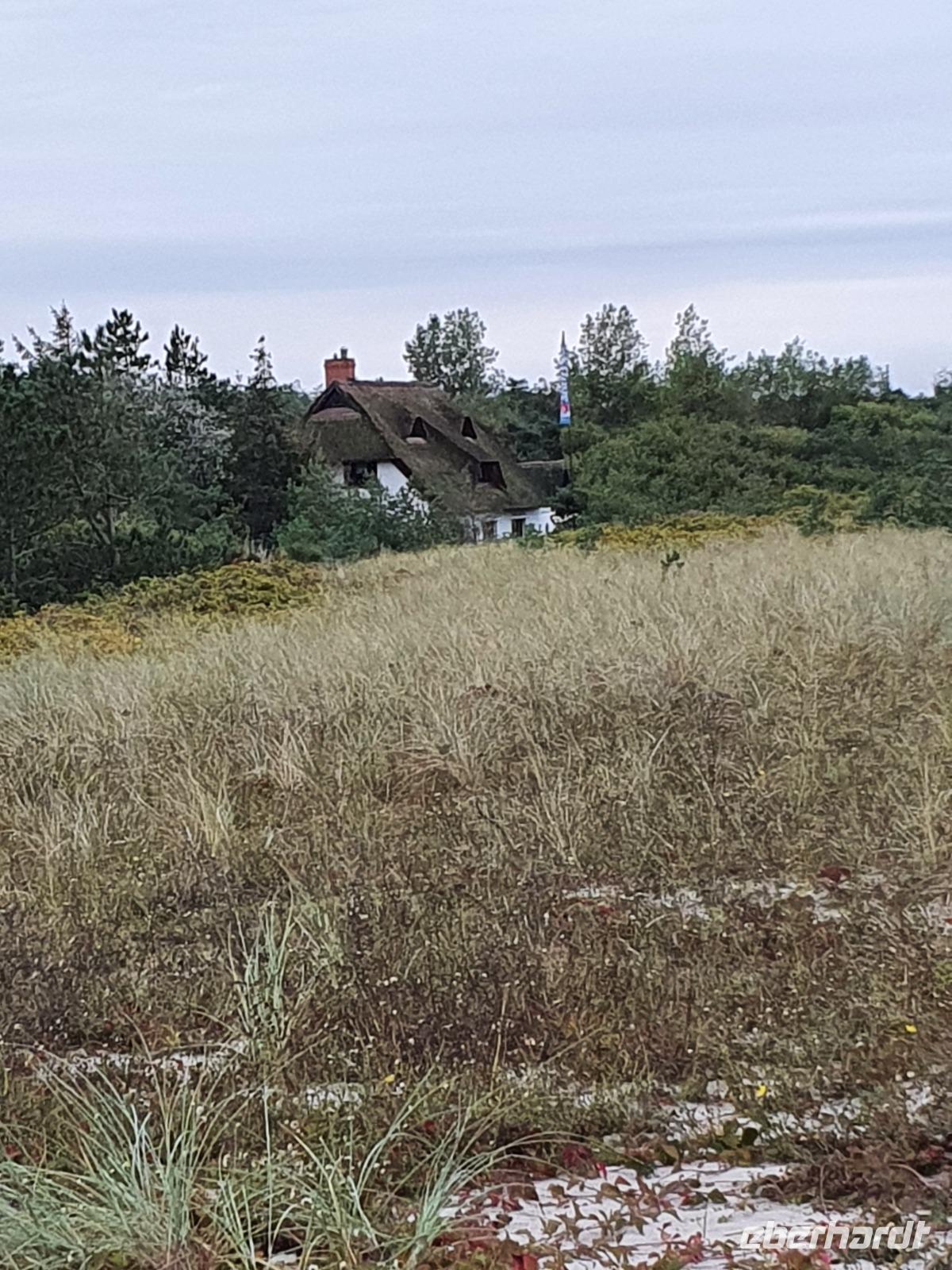 Der Blick zum Himmel wird von leichtem Nieselregen getrübt. Wanderfreudig fahren wir nach Wieck auf dem Darß. Der kleine Ort mit seinen für die Region typischen reetgedeckten Häusern und bunt bemalten Haustüren erinnern an die Zeit, da Fischer, Seefahrer und Bauern mit ihrem Tun die Region prägten. Uns fallen immer wieder einander zu- oder abgewandte Pferdeköpfe an den Giebeln auf. Sie sollen Böses wie Feuer, Blitzschlag, Unheil oder Krankheiten abwenden. Entlang des Boddens und durch den Wald gelangen wir gegen Mittag nach Born. Der leichte Nieselregen bleibt uns leider treu. Ein Teil der Gruppe lässt sich deshalb vom Bus nach Ahrenshoop bringen. Wir wandern weiter am Bodden, müssen diesen Weg jedoch wegen einer Gefahrenstelle verlassen und vorbei an Wiesen und Weiden erreichen wir am Nachmittag die kleine Schifferkirche in Ahrenshoop. Der Bau erinnert an ein kieloben liegendes Schiff, der Glockenturm der Kirche steht neben der Kirche. Hier endet unsere erste Wanderung und das Wetter verspricht für die kommenden Tage eine deutliche Besserung.
