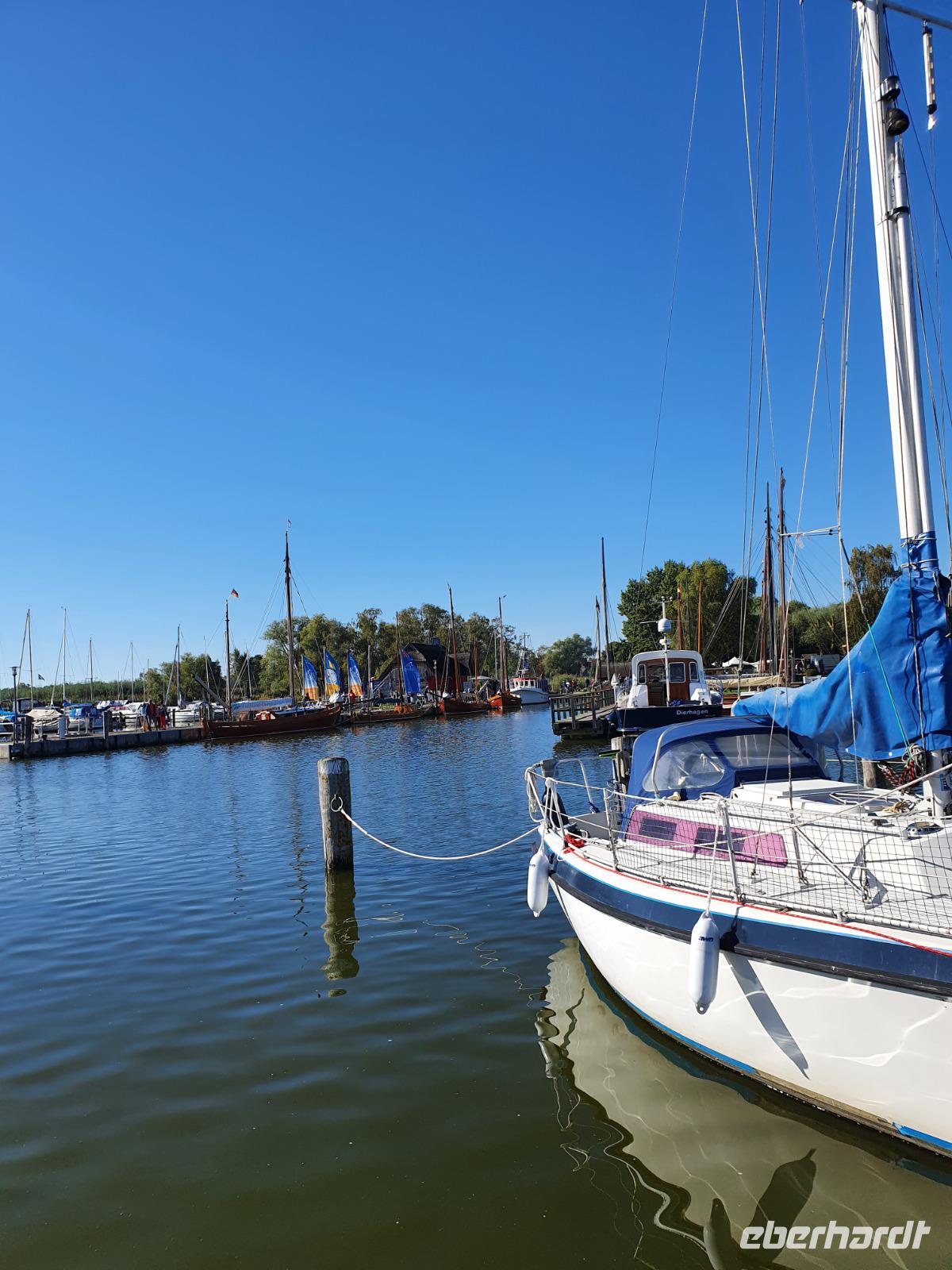 Bei strahlendem Sonnenschein und Windstille wollen wir heute mit dem Zeesboot auf dem Bodden segeln. Da ein Boot nur zwölf Passagiere und einen Skipper trägt, fahren wir nacheinander in zwei Gruppen. Ein kleiner Markt im Hafen von Dierhagen mit regionalen Produkten und Kunsthandwerk lässt die Zeit für die Wartenden schnell vergehen. Zeesboote waren bis in die Siebziger Jahre traditionell mit dem Fischfang auf den vorpommerschen Boddengewässern beschäftigt und gehören heute zum kultur-historischen Eigentum der Region. Das Schleppnetz - die Zeese - wurde unter dem quertreibenden Segelboot gezogen, die Takelage der Holzboote ist rot-braun gefärbt. Damit unser Boot überhaupt den Hafen verlassen kann, muss der Skipper einen kleinen Hilfsmotor starten. Bei unserem Segeltörn genießen wir den herrlichen Blick über den Bodden und erfahren Neues und Wissenswertes über Fischland-Darß und seine Bewohner. Den Nachmittag nutzen einige Gäste für einen kleinen Ausflug mit dem Rad und einige trauen sich sogar ein Bad in der Ostsee zu.