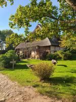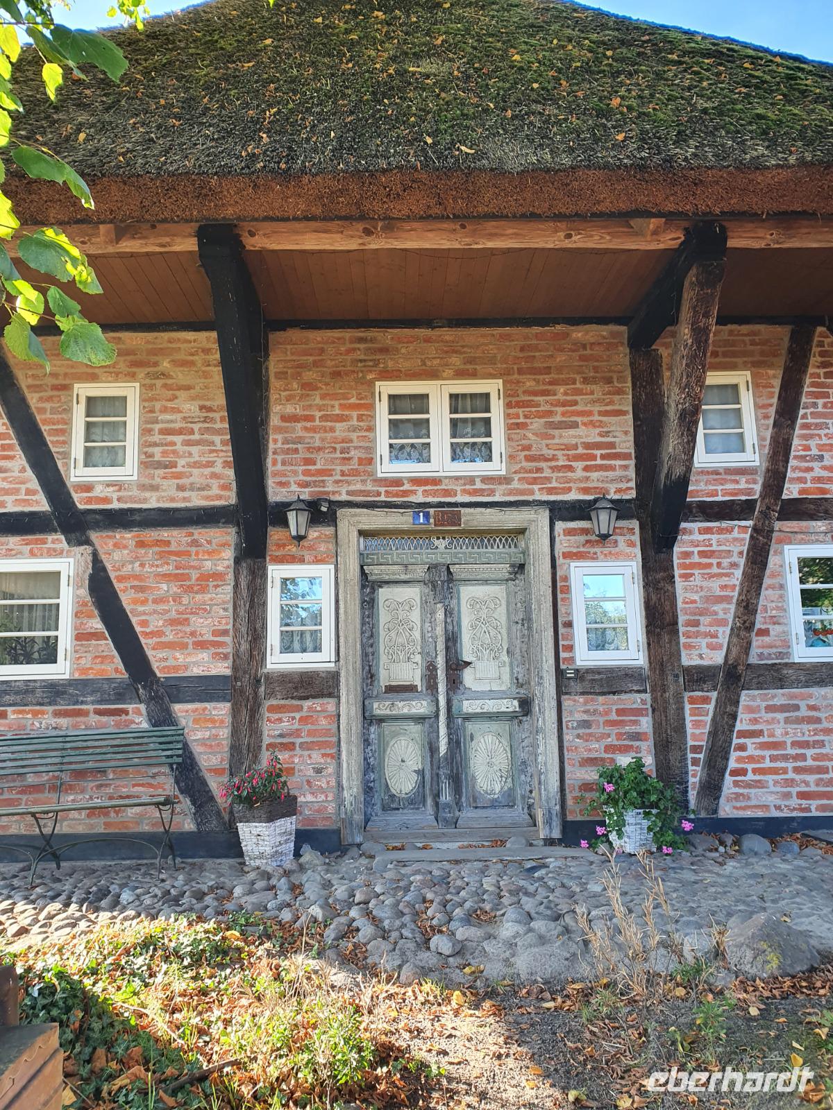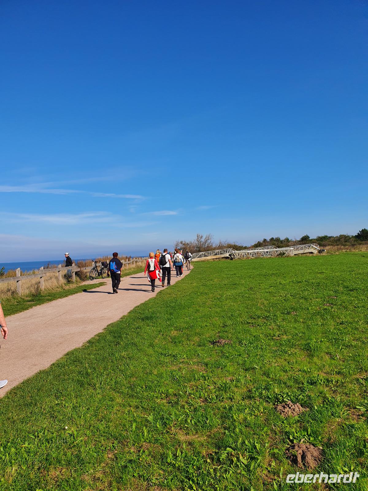 Unsere Wanderung beginnt am Wustrower Hafen bei strahlendem Sonnenschein und führt zunächst zum Woermannhaus, das exemplarisch für die Bauweise der Büdnereien und Kapitänshäuser in der Region ist. Am Giebel über dem Eulenloch sind zwei (echte) Pferdeköpfe zu sehen, die Klöntür dürfte zu den am meisten fotografierten in Wustrow gehören. Von der Seebrücke aus führt unsere Wanderung über das Hohe Ufer bis nach Ahrenshoop. Unterwegs lassen wir den Blick auf die Abbrüche an der Küste schweifen, ein Teil der ehemaligen Bunkeranlage liegt hier bereits im Meer. Dem Maler Paul Müller Kaempf ist eine Skulptur auf der höchsten Erhebung - 18 m.ü.M. - der Halbinsel gewidmet. Er war Mitbegründer der Künstlekolonie in Ahrenshoop. Einige Wanderer verweilen nun in Ahrenshoop, andere wandern weiter bis zum Hafen in Althagen. Bei Räucherfisch und einem frisch Gezapften der „Fischland-Brauerei" machen wir eine kleine Pause bevor es entlang dem Bodden über Niehagen und den durch seine Kunstscheune bekannten Ortsteil Barnstorf zurück nach Wustrow geht. Unser Busfahrer sammelt die Ahrenshoop verweilenden Gäste ein und wir fahren zurück zum Hotel.