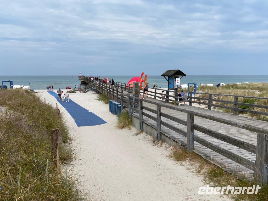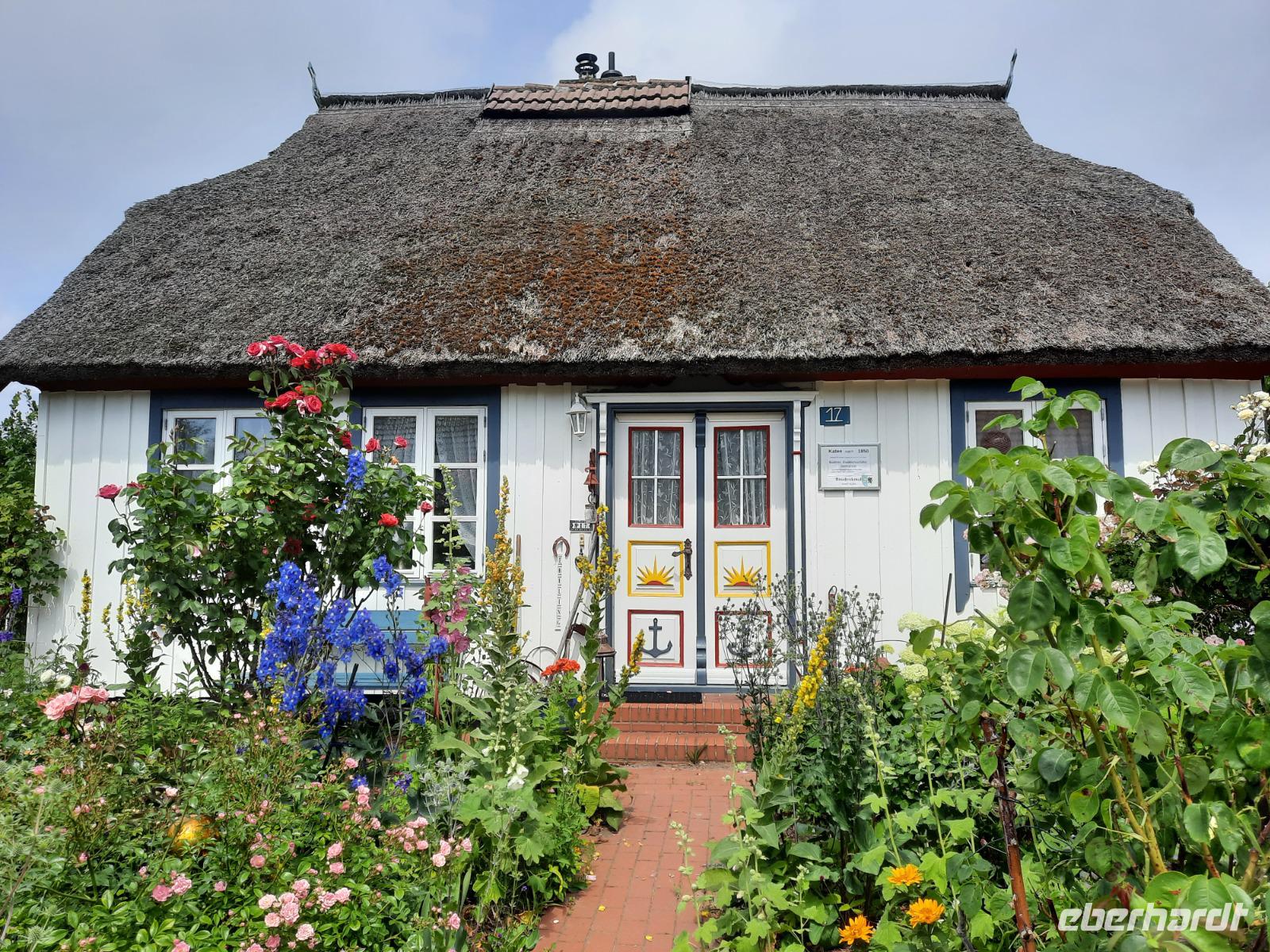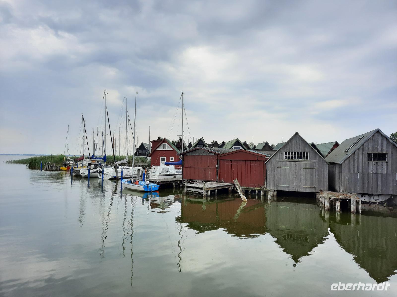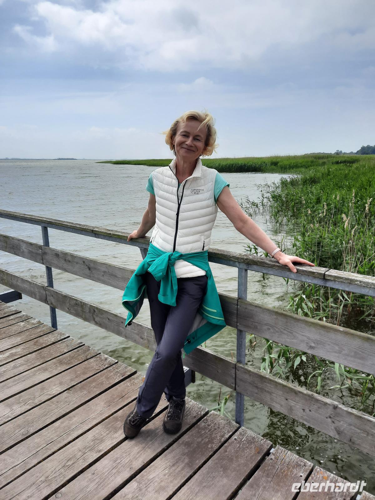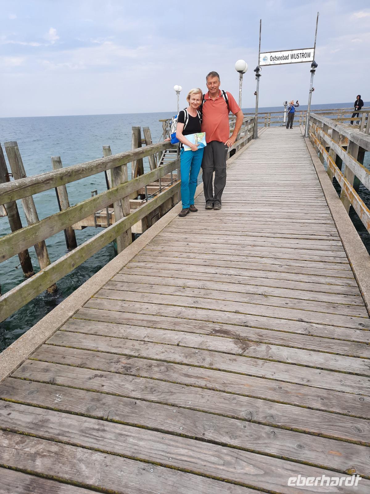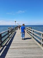 Gut gestärkt vom üppigen Frühstücksbuffet konnten wir auch heute bei angenehmen Temperaturen um die 20 Grad starten. Der Blick zum Himmel versprach zwar am Morgen nichts Gutes, denn es regnete bei unserer Abfahrt in Dierhagen. Nach gerade einmal zehn Minuten Busfahrt waren wir am kleinen Hafen von Wustrow angekommen und ganz plötzlich war kein Niederschlag mehr in Sicht - was für ein Glück! Vom Parkplatz am Hafen wanderten wir zunächst zur Wustrower Seebrücke, die noch Ende des 19. Jahrhunderts lediglich eine 50 Meter lange Holzbrücke war. Diese wurde dann durch Eisgang zerstört und erst 1992/93 wurde die heutige, 240 Meter lange Seebrücke errichtet. Der Tag war noch jung und somit hatten wir die Seebrücke noch ganz für uns allein! Von hier aus wanderten wir weiter der Küste entlang, die stetig höher wurde. Wenig später führte uns dann ein kurzer Abstecher zum Bakelberg, dem sogenannten "Mount Everest" des Fischlands. Immerhin handelt es sich hier um die höchste Erhebung der Halbinsel und für Seeleute war der Berg früher ein wichtiger geographischer Orientierungspunkt, worauf auch der Name "Bake" zurückzuführen ist. Anschließend erreichten wir den Steilabfall Hohes Ufer mit spektakulären Blicken auf Strand und Ostsee. Das Hohe Ufer hat schließlich eine bis zu 18 Meter hohe Kliffranddüne, die aus eiszeitlichen Sanden gebildet ist und die starke Meeresbrandung der Ostsee hat dann zur Herausbildung des Kliffs geführt. Durch den stetigen Abtrag des alten Inselkerns des Fischlands bricht es besonders nach herbstlichen Stürmen immer wieder nach und die Küstenlinie verlagert sich interessanterweise langsam nach Osten. In dem hohen Steilabbruch haben sich sogar Uferschwalben eingenistet und Bruthöhlen gegraben. Später gingen wir dann in das Künstlerdorf Ahrenshoop mit seinen ca. 700 Einwohnern hinein und bogen den historischen Grenzweg (Grenze südlich Mecklenburg/nördlich Vorpommern) ein. Wir gelangten so zur belebten Dorfstraße, wo wir eine wohlverdiente kleine Pause einlegten und die vielen wunderschönen Häuser in regionaltypischer Bauweise mit rohrgedeckten Dächern bewundern konnten. Später kamen wir dann noch an der Schifferkirche vorbei, die erst vor knapp 70 Jahren eingeweiht wurde und den Ortsbezug durch die gewählte Architektur und die verwendeten heimischen Baumaterialien unterstreichen. Sie trägt ihre Verbundenheit zur Seefahrt nicht nur im Namen, sondern ist sogar einem kieloben liegenden Boot nachempfunden. Unsere Wanderung führte uns nun südlich weiter. Wir erreichten so Althagen mit seinem malerischen Hafen. Wie wäre es denn mit Räucherfisch und einer Mini-Bierprobe...? Gesagt, getan... Zuerst stärkten wir uns mit Räucherfisch am Imbiss "Zur Reuse", wo es selbstverständlich auch eine eigene Räucherei gab. Wir saßen in rustikalem Ambiente an langen Eichenbänken und konnten den frischen Fisch aus dem Rauch genießen. Es wird immer gesagt, ein Fisch muss schwimmen... Also sollte es auch etwas zum "Nachspülen" geben und so konnten wir wenig später das Bier der erst im Jahre 2017 eröffneten "Fischland-Brauerei" verkosten, welches es übrigens ausschließlich in Ahrenshoop zu trinken gibt. Zwischenzeitlich setzte leichter Regen ein, der aber ganz schnell wieder vorüber war... So konnte es nach dieser kulinarischen Stärkung gut gelaunt in den Nachmittag gehen. Wir setzten unsere Wanderung fort und auf dem Deichweg gelangten wir an Niehagen vorbei bzw. der Boddenküste entlang bis Wustrow zurück. Als wir den Hafen in Wustrow erreichten, stärkten wir uns nochmals - diesmal allerdings mit Kaffee und Eis oder Törtchen. Heute lagen uns schließlich stolze 16,7 Wander-Kilometer in den Beinen!