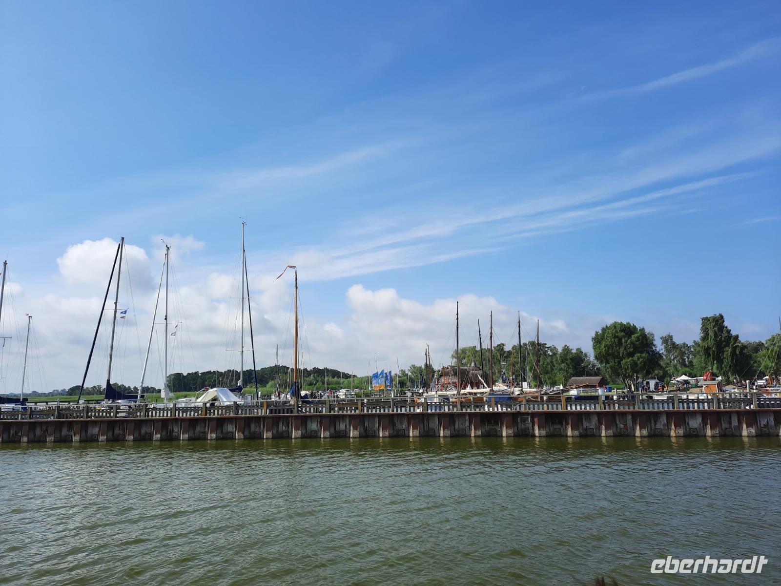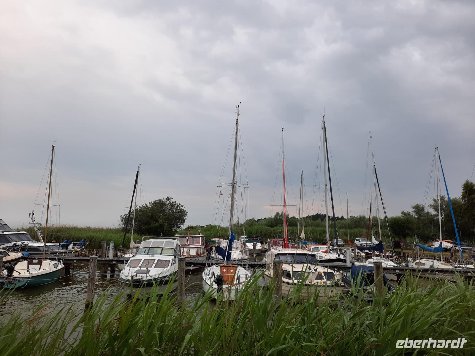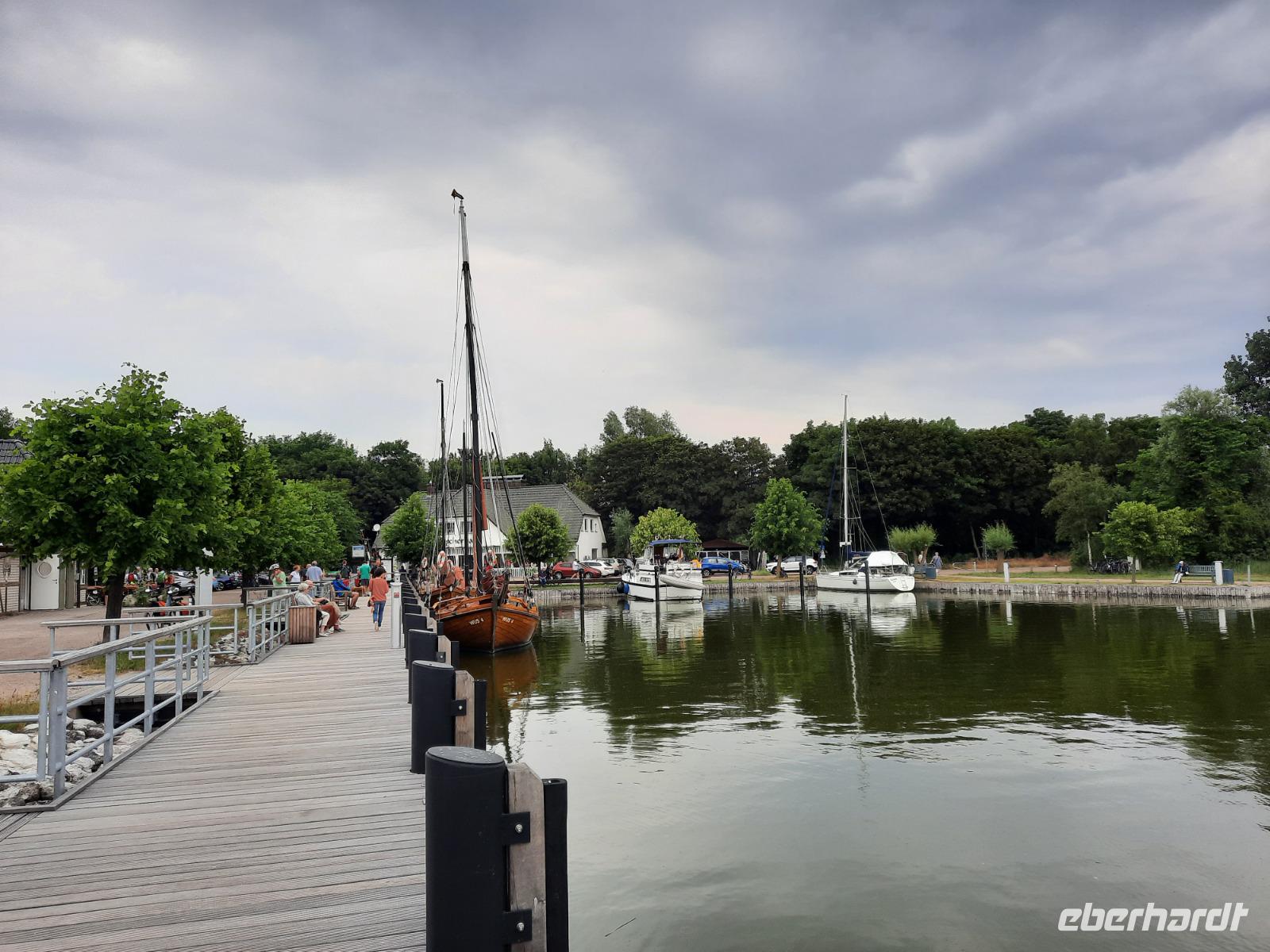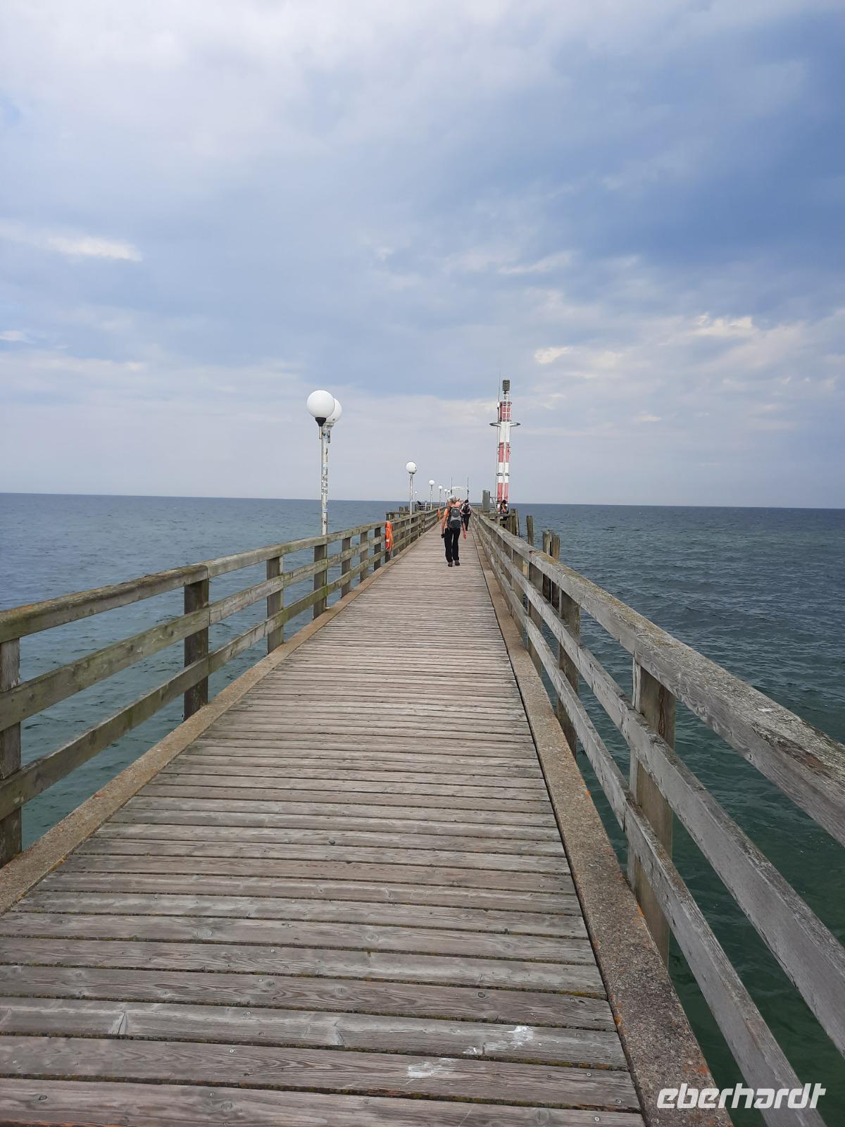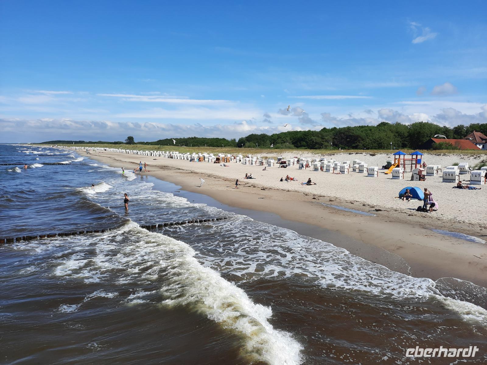 Gut gestärkt vom üppigen Frühstücksbuffet konnten wir auch heute bei angenehmen Temperaturen um die 20 Grad starten. Der Blick zum Himmel versprach zwar am Morgen nichts Gutes, denn es regnete bei unserer Abfahrt in Dierhagen. Nach gerade einmal zehn Minuten Busfahrt waren wir am kleinen Hafen von Wustrow angekommen und ganz plötzlich war kein Niederschlag mehr in Sicht - was für ein Glück! Vom Parkplatz am Hafen wanderten wir zunächst zur Wustrower Seebrücke, die noch Ende des 19. Jahrhunderts lediglich eine 50 Meter lange Holzbrücke war. Diese wurde dann durch Eisgang zerstört und erst 1992/93 wurde die heutige, 240 Meter lange Seebrücke errichtet. Der Tag war noch jung und somit hatten wir die Seebrücke noch ganz für uns allein! Von hier aus wanderten wir weiter der Küste entlang, die stetig höher wurde. Wenig später führte uns dann ein kurzer Abstecher zum Bakelberg, dem sogenannten "Mount Everest" des Fischlands. Immerhin handelt es sich hier um die höchste Erhebung der Halbinsel und für Seeleute war der Berg früher ein wichtiger geographischer Orientierungspunkt, worauf auch der Name "Bake" zurückzuführen ist. Anschließend erreichten wir den Steilabfall Hohes Ufer mit spektakulären Blicken auf Strand und Ostsee. Das Hohe Ufer hat schließlich eine bis zu 18 Meter hohe Kliffranddüne, die aus eiszeitlichen Sanden gebildet ist und die starke Meeresbrandung der Ostsee hat dann zur Herausbildung des Kliffs geführt. Durch den stetigen Abtrag des alten Inselkerns des Fischlands bricht es besonders nach herbstlichen Stürmen immer wieder nach und die Küstenlinie verlagert sich interessanterweise langsam nach Osten. In dem hohen Steilabbruch haben sich sogar Uferschwalben eingenistet und Bruthöhlen gegraben. Später gingen wir dann in das Künstlerdorf Ahrenshoop mit seinen ca. 700 Einwohnern hinein und bogen den historischen Grenzweg (Grenze südlich Mecklenburg/nördlich Vorpommern) ein. Wir gelangten so zur belebten Dorfstraße, wo wir eine wohlverdiente kleine Pause einlegten und die vielen wunderschönen Häuser in regionaltypischer Bauweise mit rohrgedeckten Dächern bewundern konnten. Später kamen wir dann noch an der Schifferkirche vorbei, die erst vor knapp 70 Jahren eingeweiht wurde und den Ortsbezug durch die gewählte Architektur und die verwendeten heimischen Baumaterialien unterstreichen. Sie trägt ihre Verbundenheit zur Seefahrt nicht nur im Namen, sondern ist sogar einem kieloben liegenden Boot nachempfunden. Unsere Wanderung führte uns nun südlich weiter. Wir erreichten so Althagen mit seinem malerischen Hafen. Wie wäre es denn mit Räucherfisch und einer Mini-Bierprobe...? Gesagt, getan... Zuerst stärkten wir uns mit Räucherfisch am Imbiss "Zur Reuse", wo es selbstverständlich auch eine eigene Räucherei gab. Wir saßen in rustikalem Ambiente an langen Eichenbänken und konnten den frischen Fisch aus dem Rauch genießen. Es wird immer gesagt, ein Fisch muss schwimmen... Also sollte es auch etwas zum "Nachspülen" geben und so konnten wir wenig später das Bier der erst im Jahre 2017 eröffneten "Fischland-Brauerei" verkosten, welches es übrigens ausschließlich in Ahrenshoop zu trinken gibt. Zwischenzeitlich setzte leichter Regen ein, der aber ganz schnell wieder vorüber war... So konnte es nach dieser kulinarischen Stärkung gut gelaunt in den Nachmittag gehen. Wir setzten unsere Wanderung fort und auf dem Deichweg gelangten wir an Niehagen vorbei bzw. der Boddenküste entlang bis Wustrow zurück. Als wir den Hafen in Wustrow erreichten, stärkten wir uns nochmals - diesmal allerdings mit Kaffee und Eis oder Törtchen. Heute lagen uns schließlich stolze 16,7 Wander-Kilometer in den Beinen!